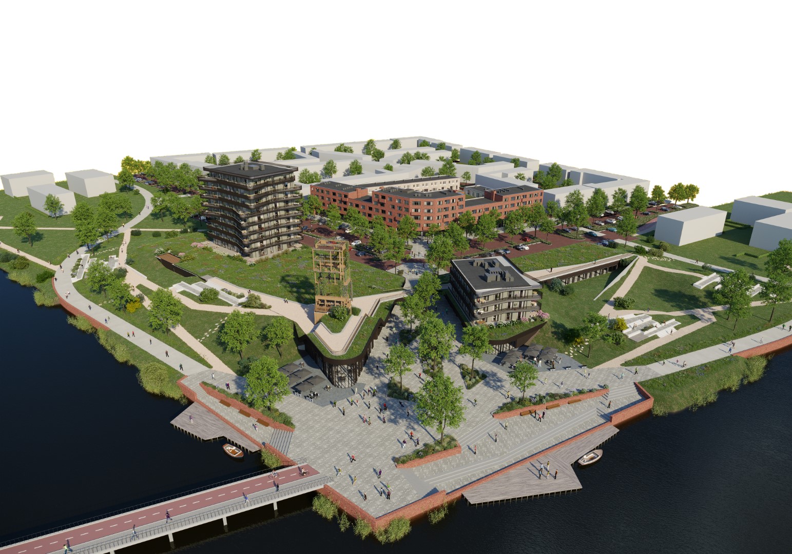Inmiddels is het tijd geworden voor een volgende stap, namelijk een nieuw en definitief centrum. Dit wordt gerealiseerd aan de oeverzijde van De Groote Wielenplas. Hier vind je straks 2 supermarkten en verschillende winkels voor je dagelijkse boodschappen. Ook tref je er een lunchroom met terras aan het water en het gezondheidscentrum met huisartsenpraktijk en apotheek.