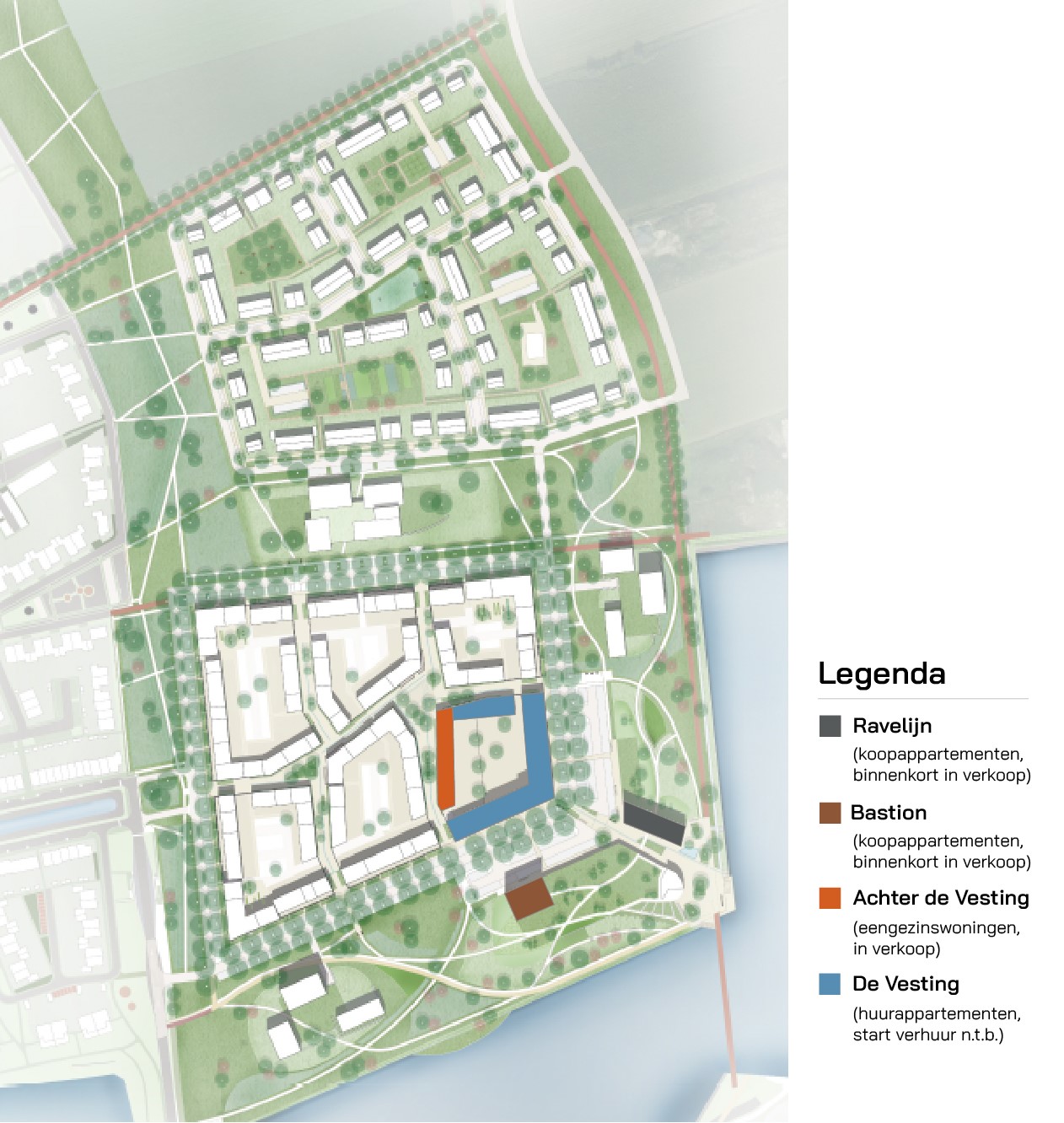 De bouw van het totale project is inmiddels gestart. In het plandeel achter de Vesting, gelegen in een rustige, autoluwe straat, bevinden zich de 10 eengezinswoningen (koop). Het plandeel De Vesting bestaat uit 47 huurappartementen met op de begane grond een plint van commerciële ruimtes. De oplevering van de eerste winkels, de huurappartementen en de eengezinswoningen verwachten we in de tweede helft van 2023 (kwartaal 3). In het plandeel Bastion binden zich 32 appartementen en 2 penthouses en in het plandeel Ravelijn bevinden zich 9 appartementen. De oplevering van het plandeel Ravelijn verwachten we in de tweede helft van 2023 (kwartaal 4) en het plandeel Bastion de eerste helft van 2024.