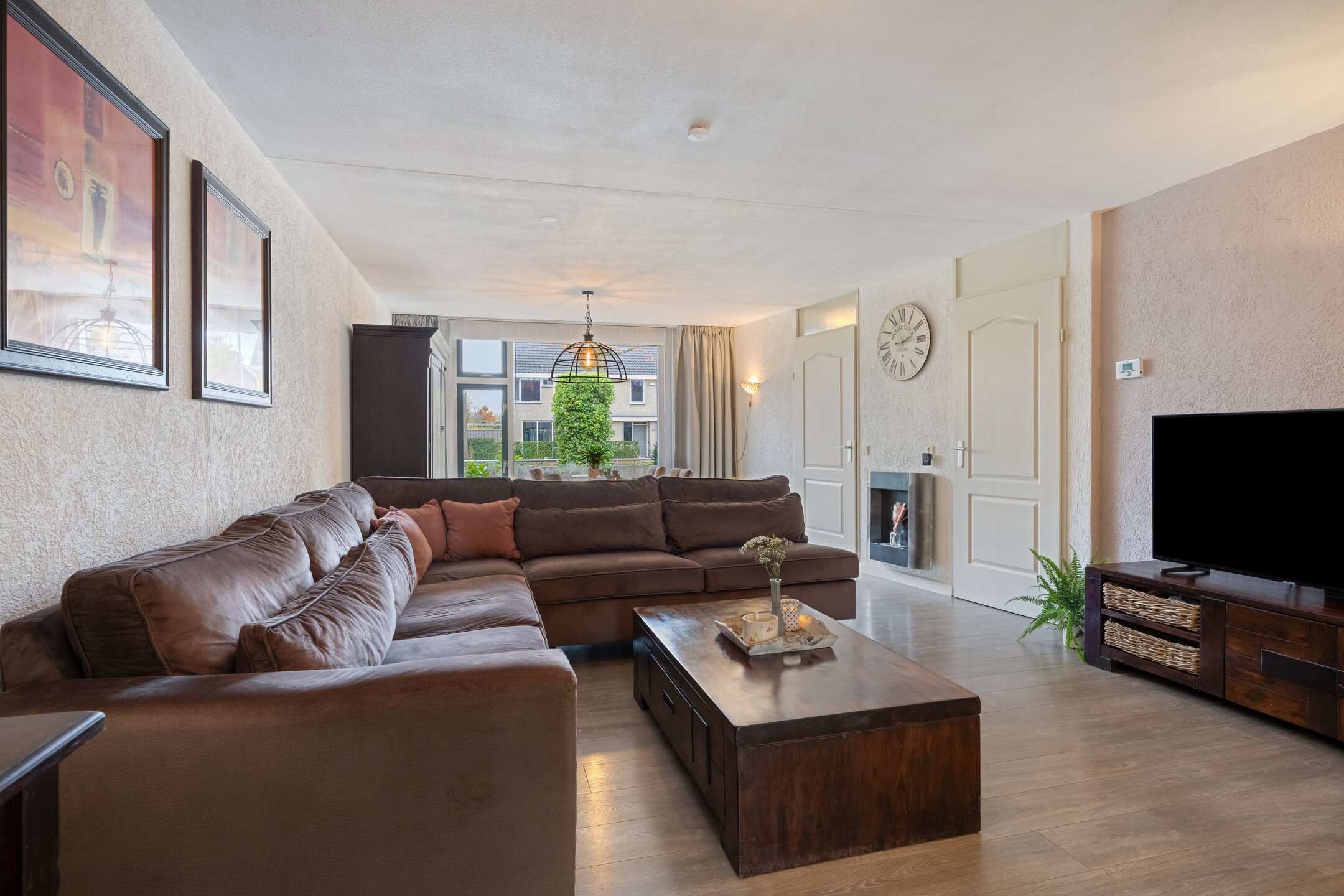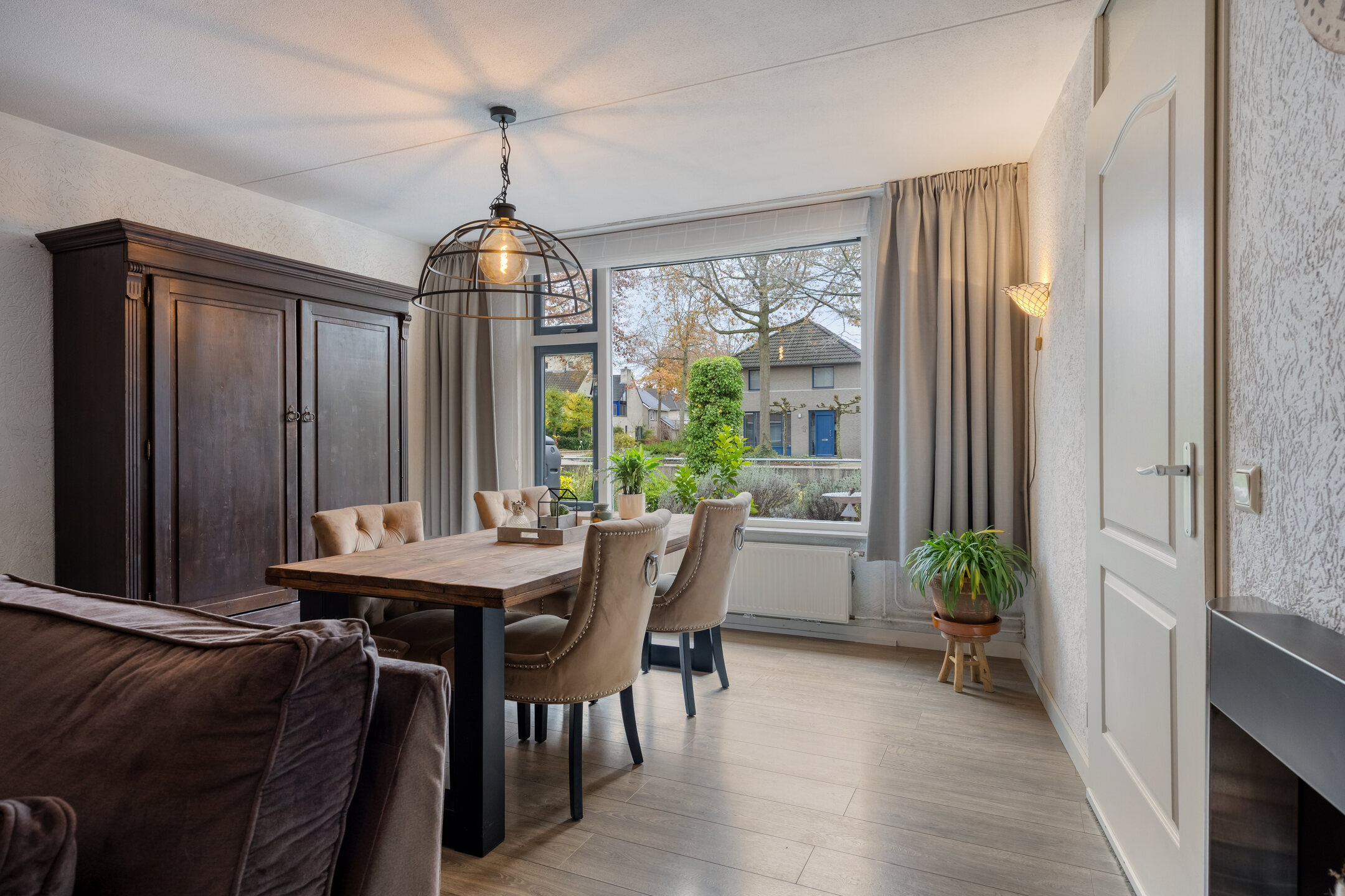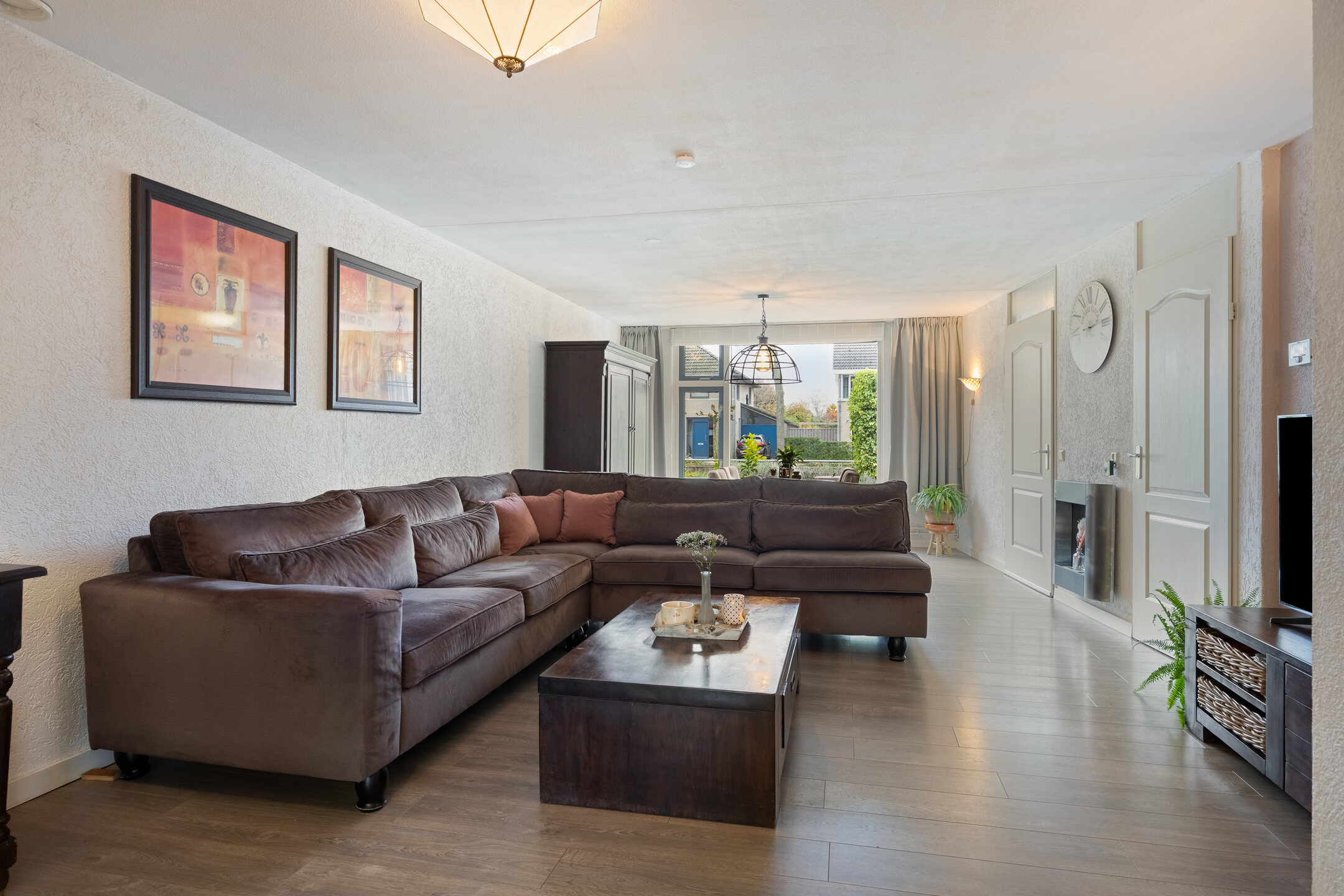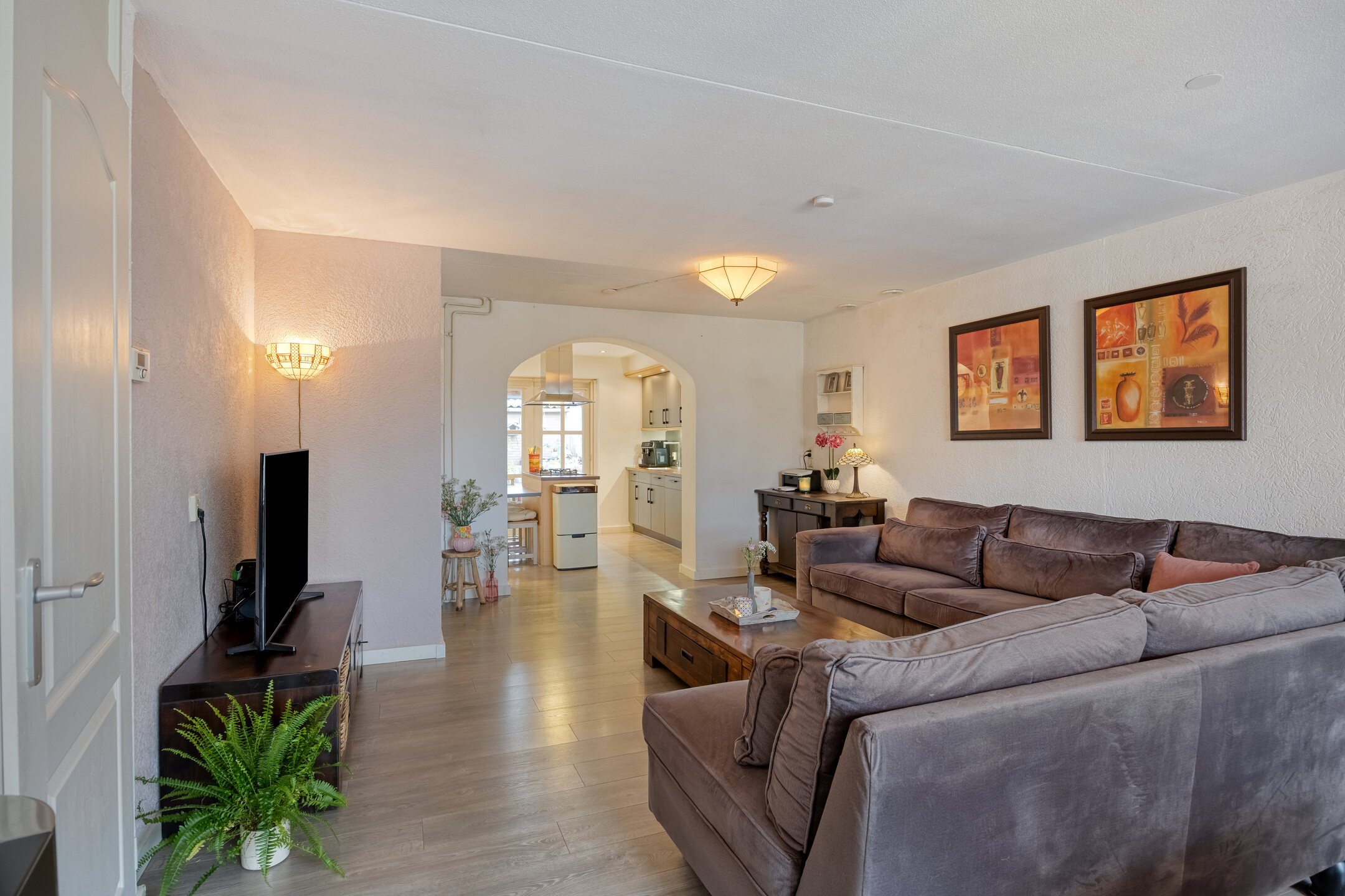 – de ruime woonkamer beschikt over veel lichtinval dankzij de grote raampartijen aan de voorzijde, is voorzien van een doorlopende laminaatvloer en staat in open verbinding met de keuken, wat zorgt voor een ruimtelijk geheel;