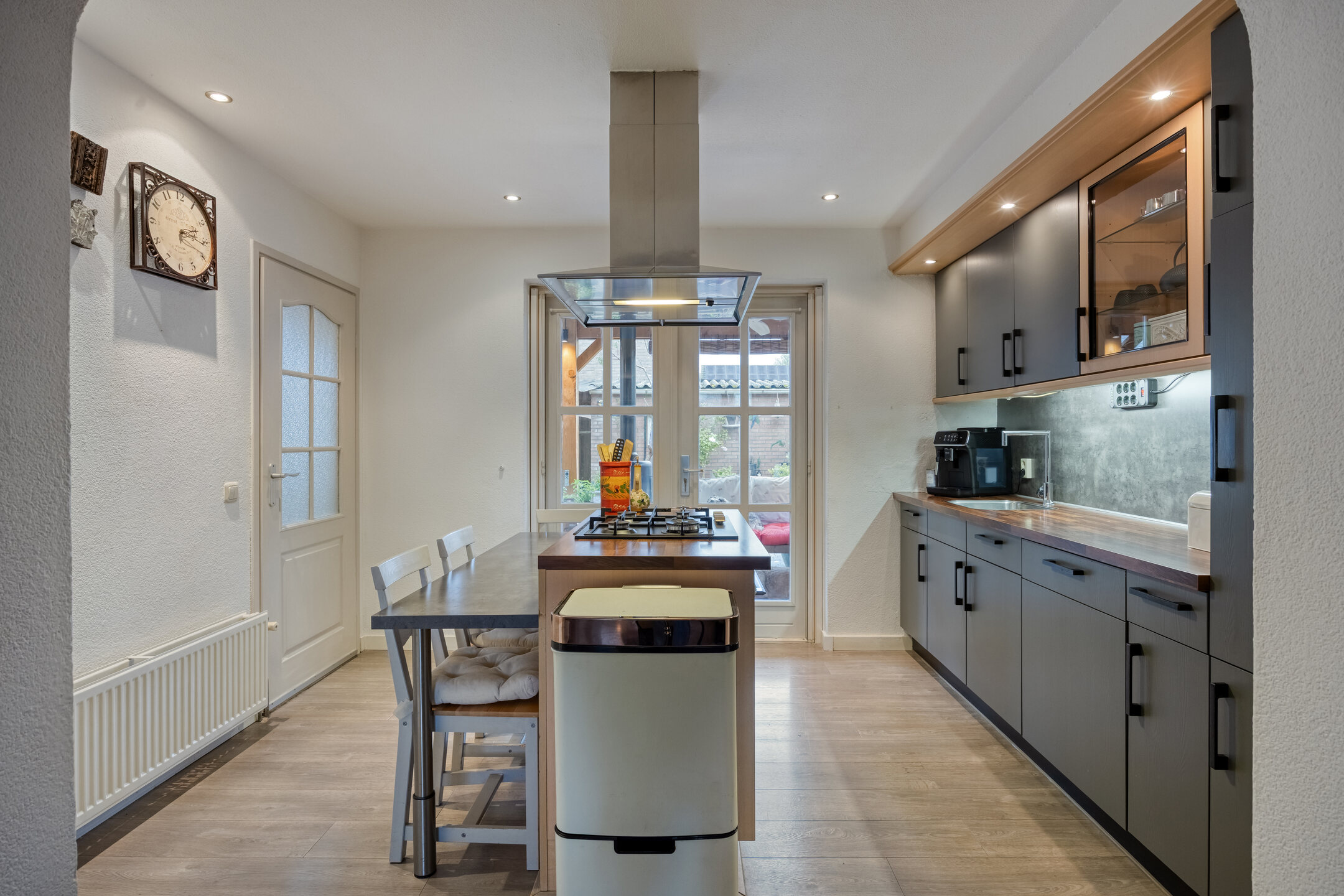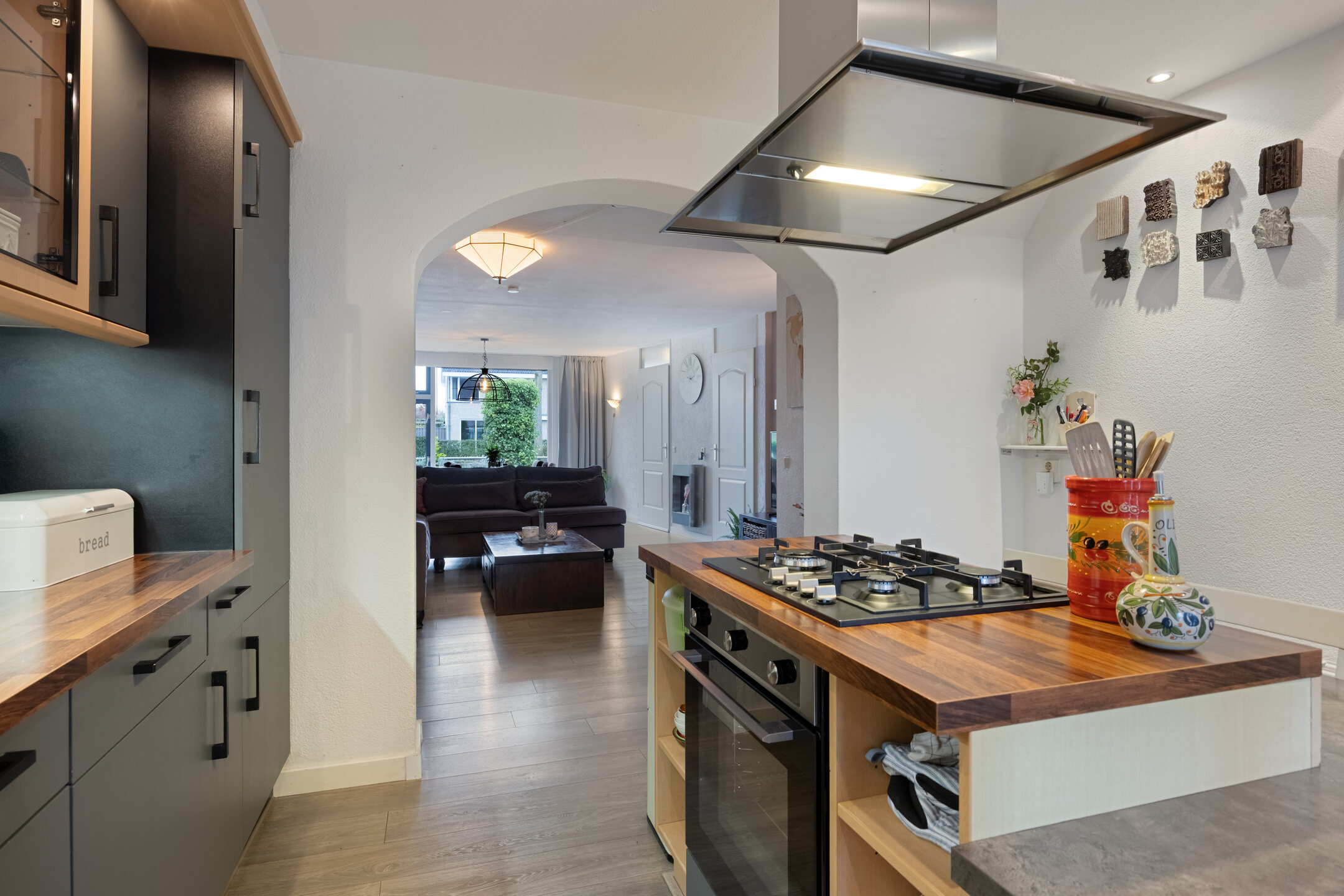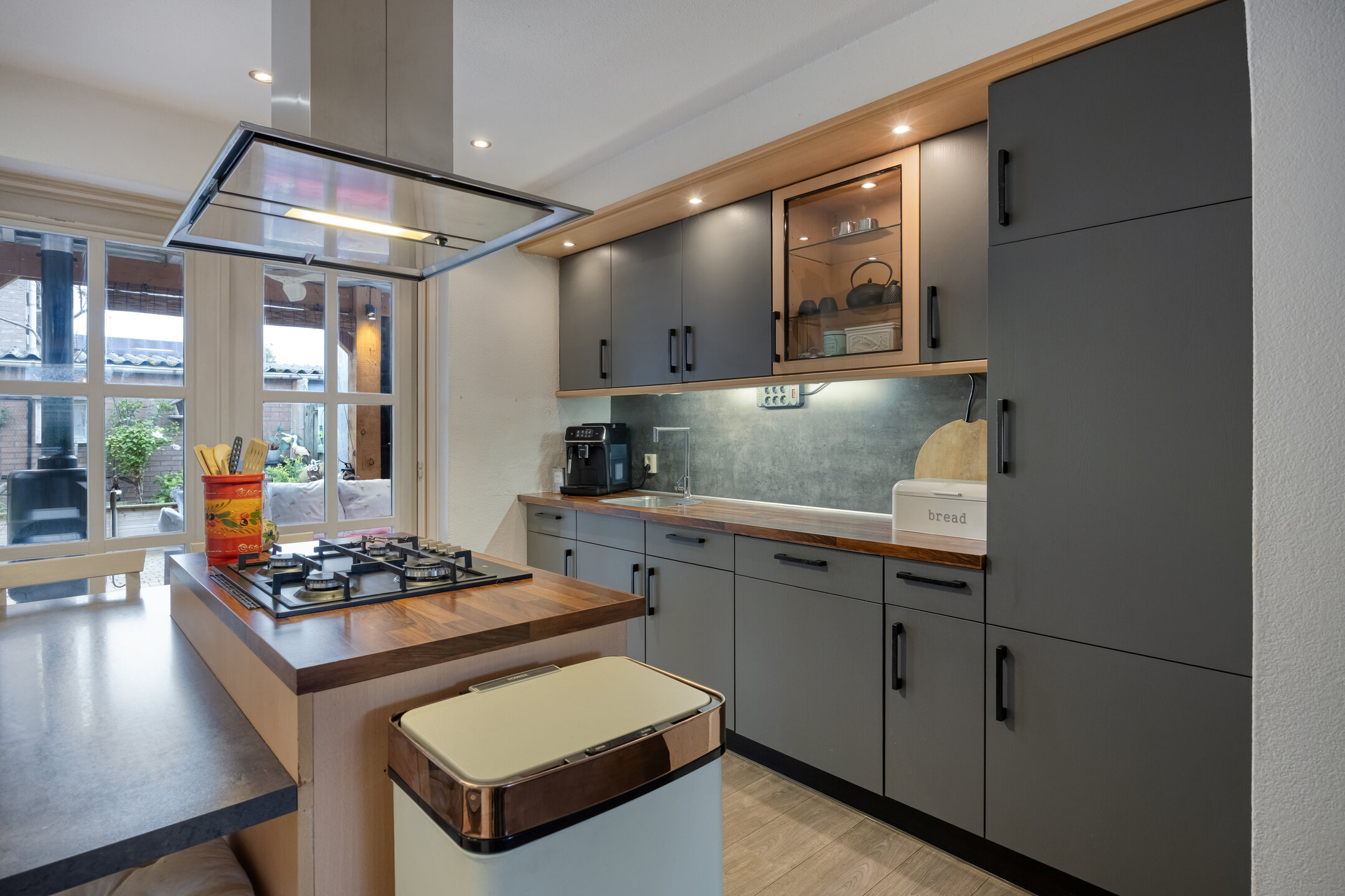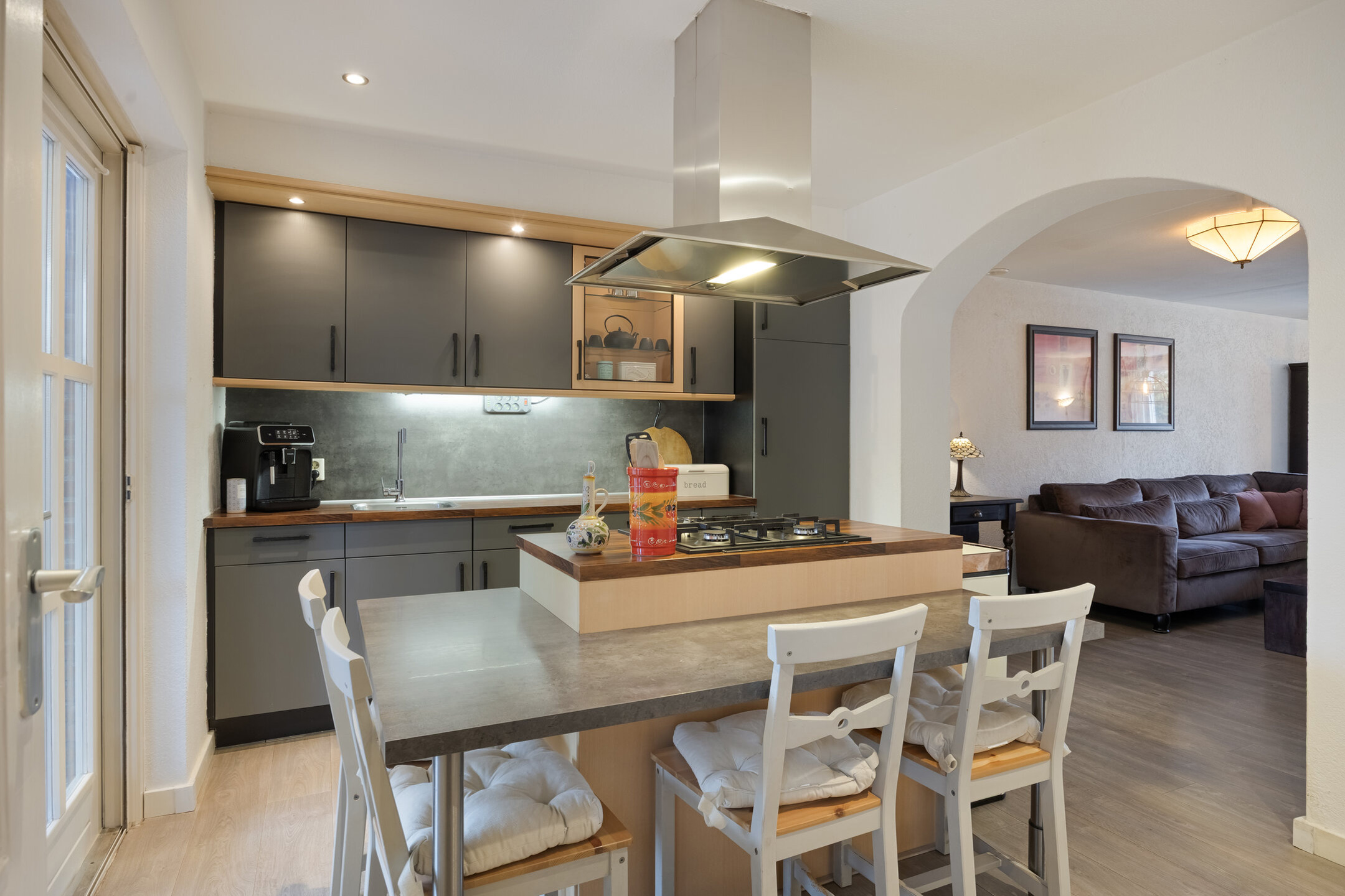 – de keuken aan de achterzijde in moderne stijl is uitgevoerd en beschikt over een kookeiland, gaskookplaat, afzuigkap, oven, koelkast en vaatwasser, waarbij het eetgedeelte direct grenst aan de openslaande tuindeuren;