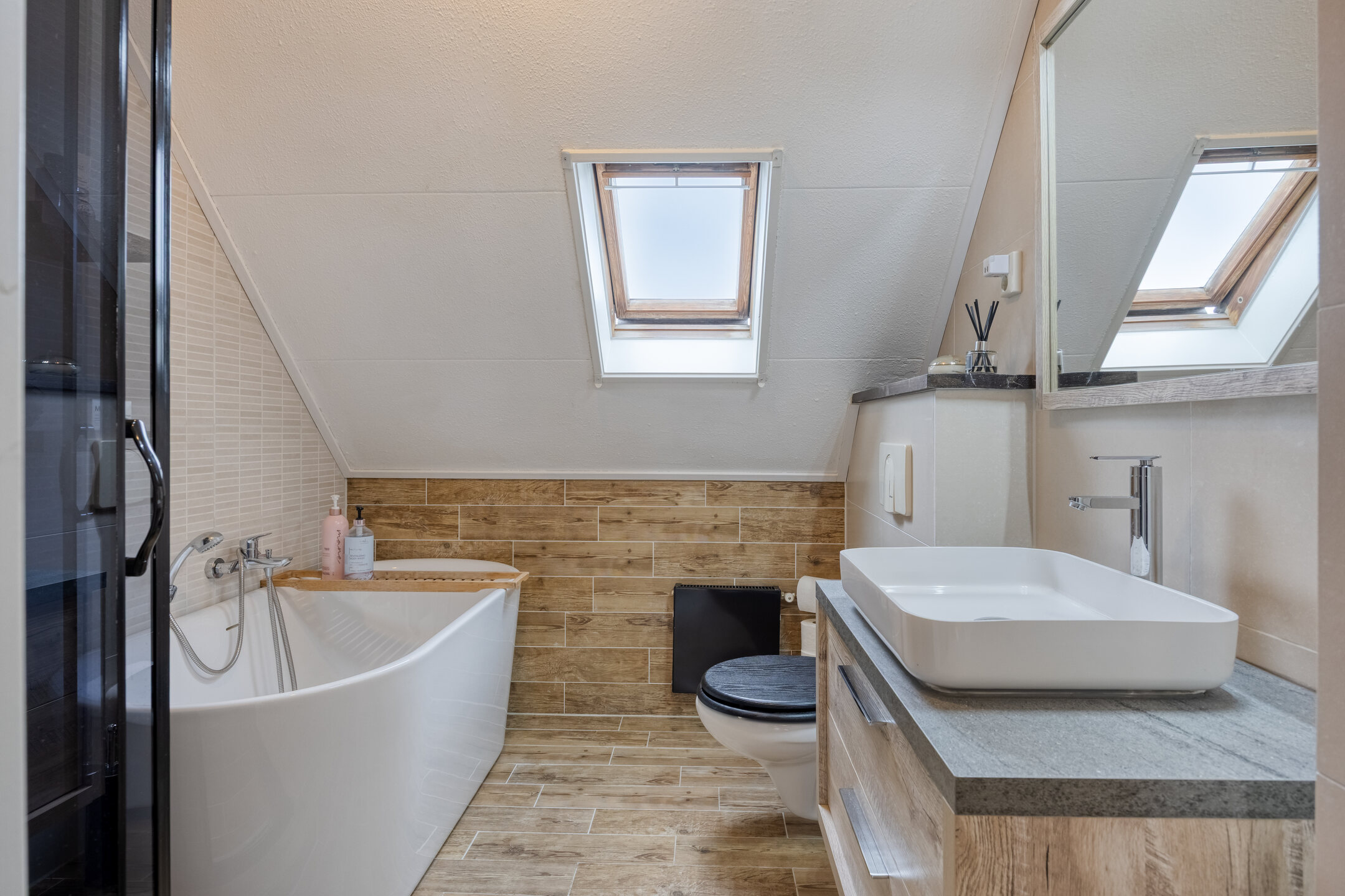 – de moderne, recent gerenoveerde badkamer een verzorgde en eigentijdse uitstraling heeft en is ingericht met een ligbad, inloopdouche, wastafelmeubel en tweede toilet;
