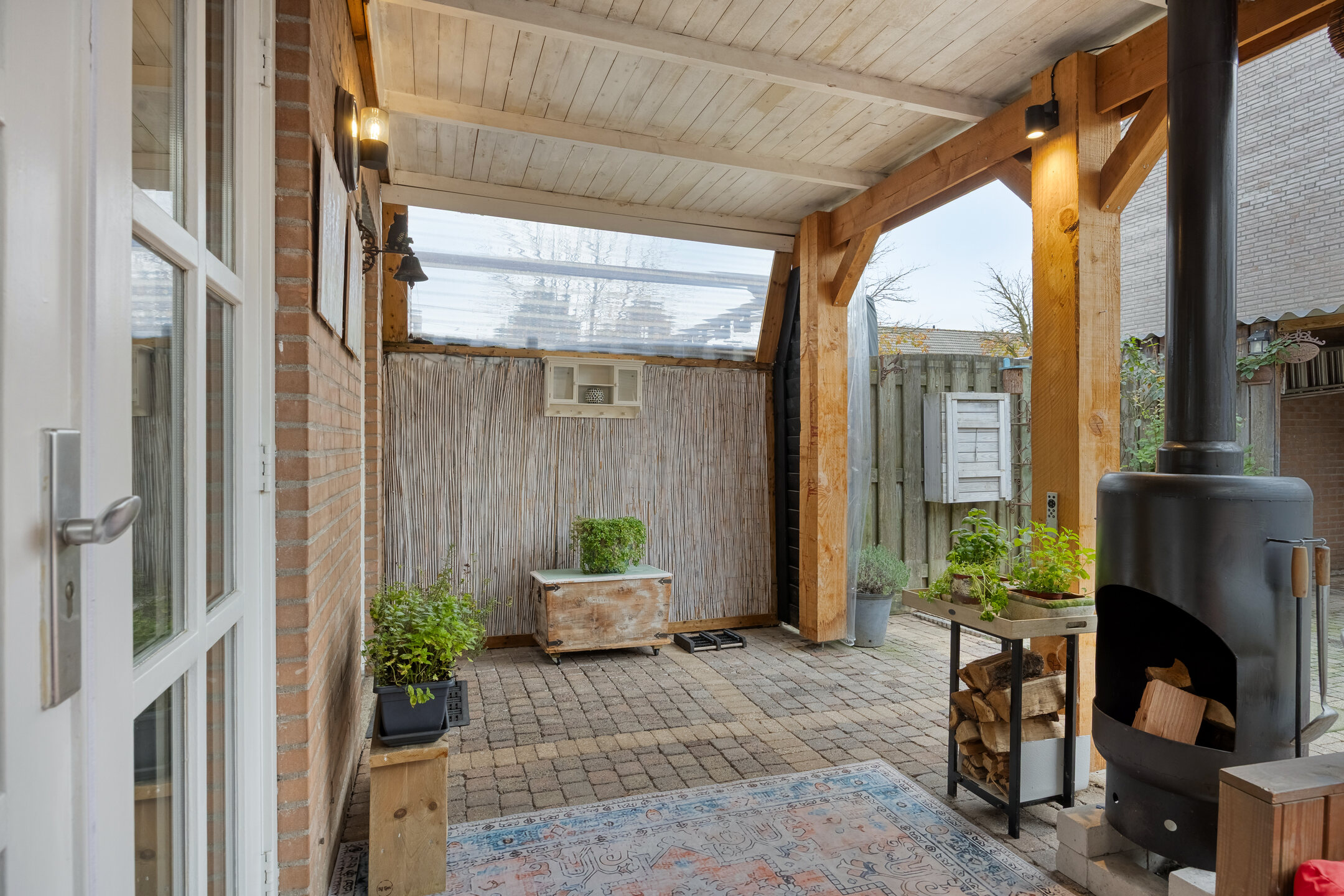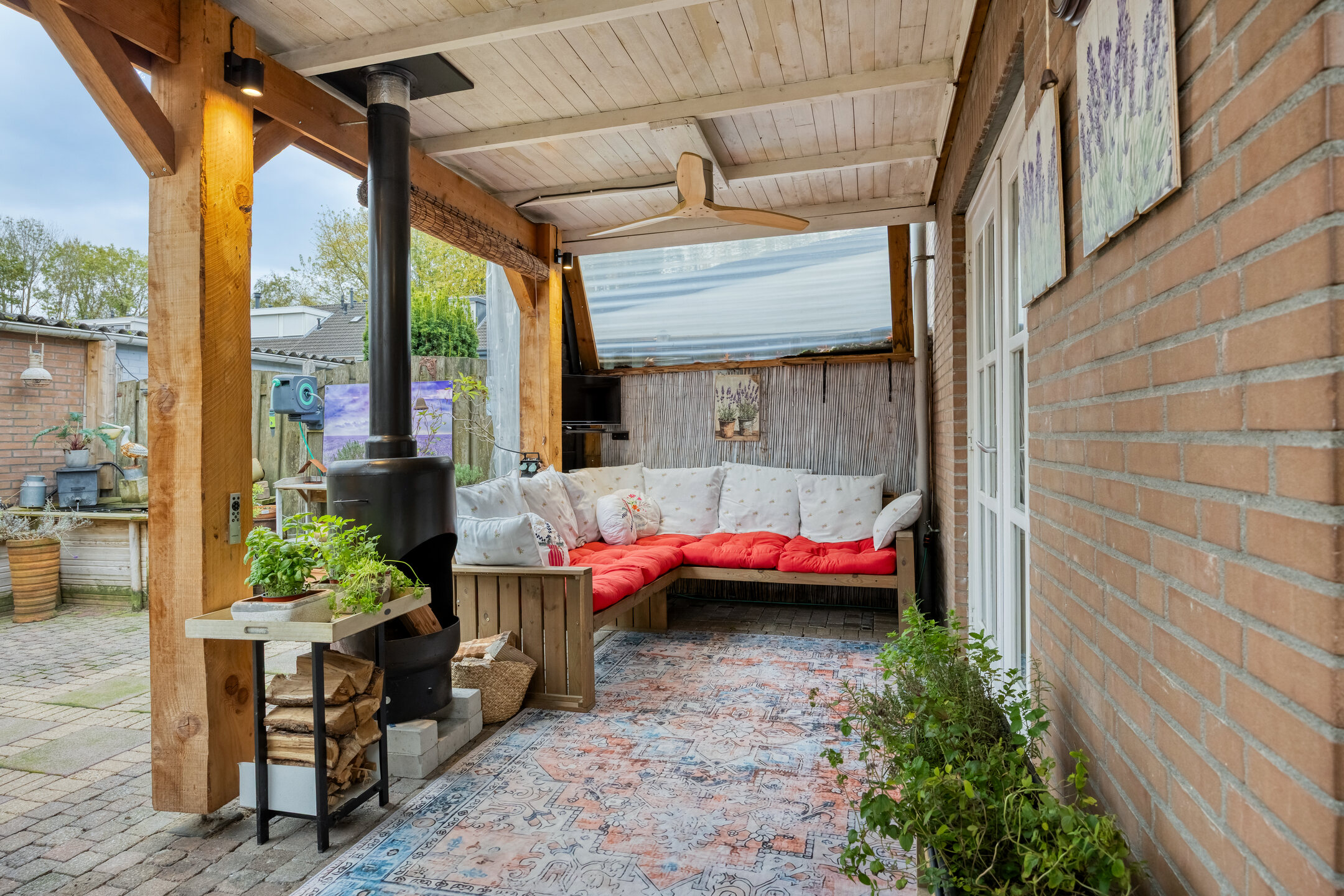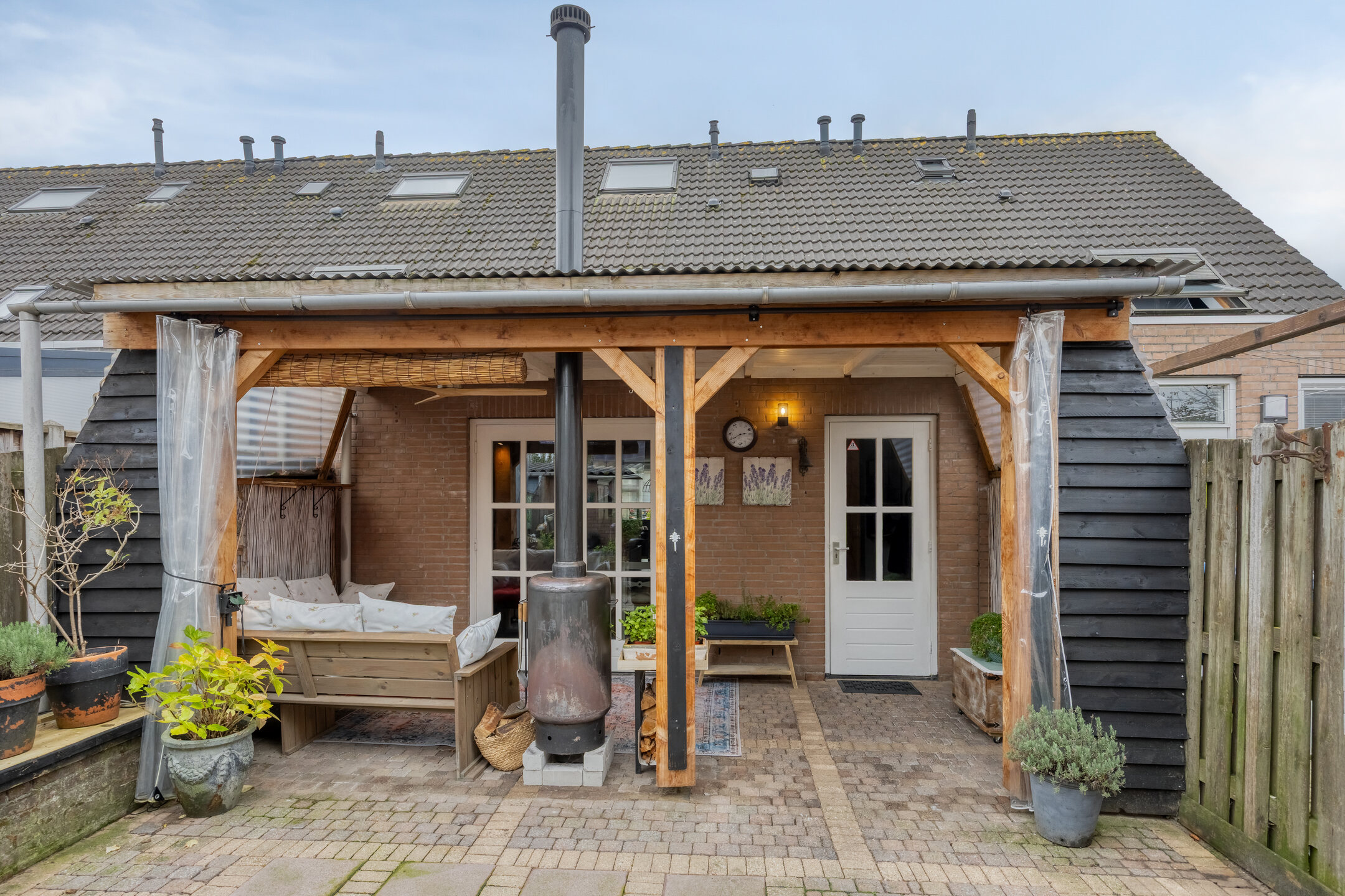 – de ruime achtertuin op het noordoosten onderhoudsvriendelijk is aangelegd en beschikt over een stenen berging en een sfeervolle houten overkapping met houtkachel, waar je zowel in de zomer als in de koelere maanden heerlijk kunt zitten;