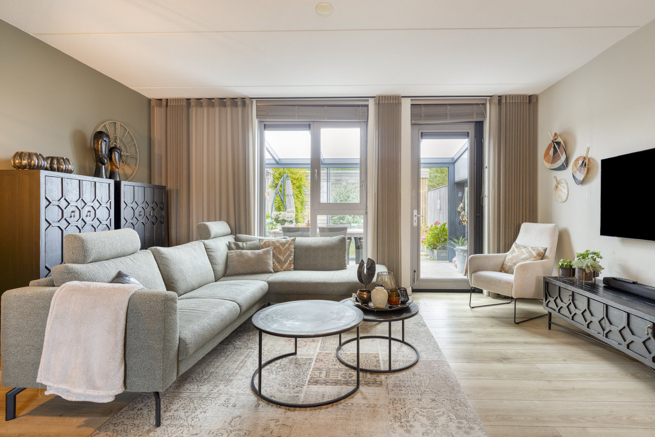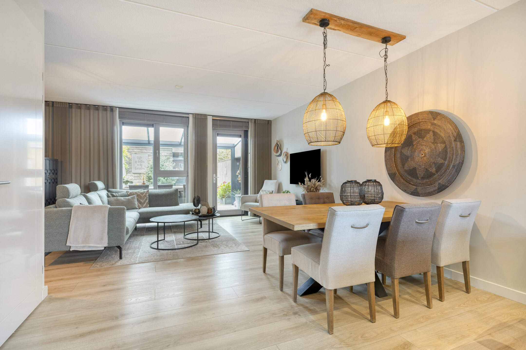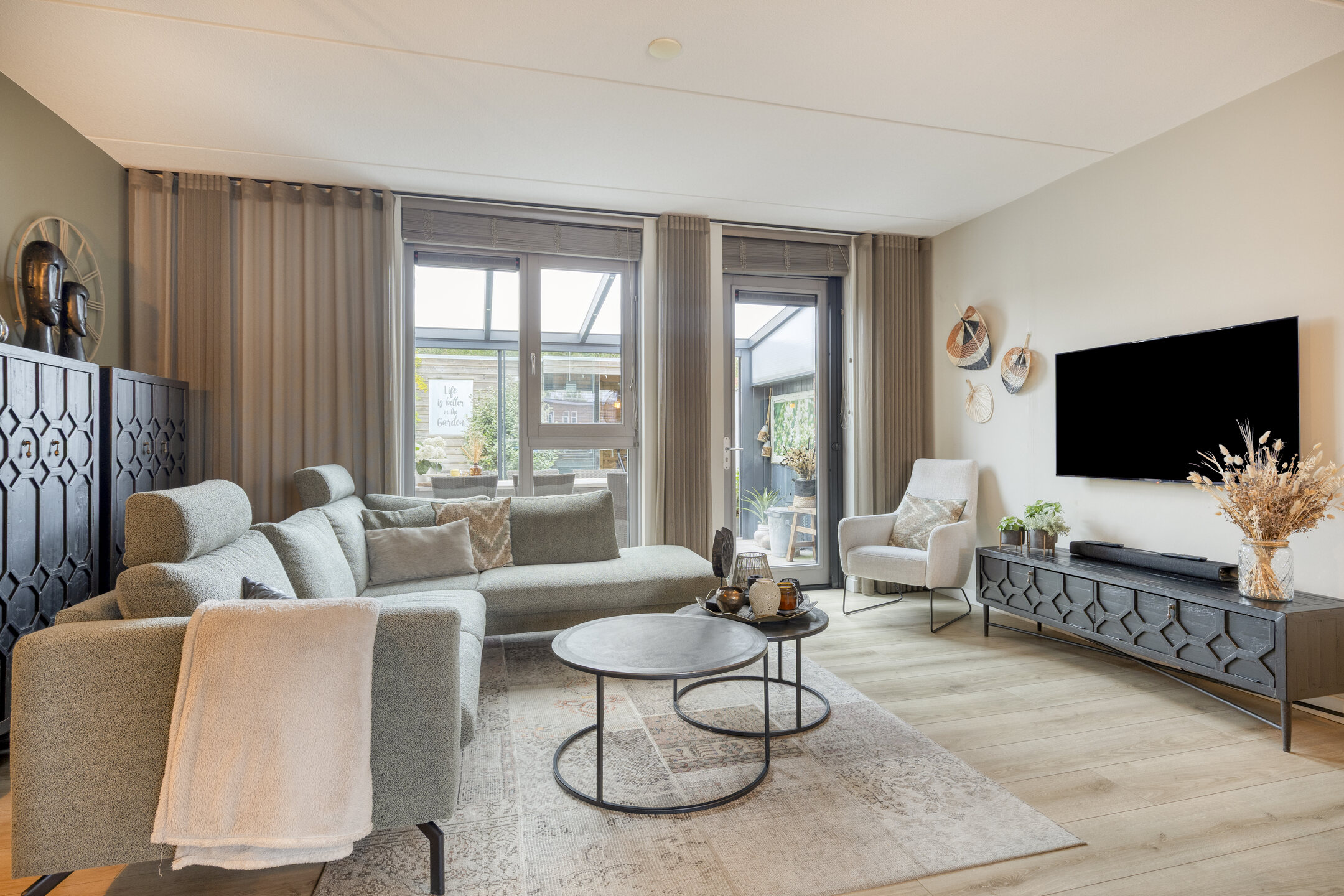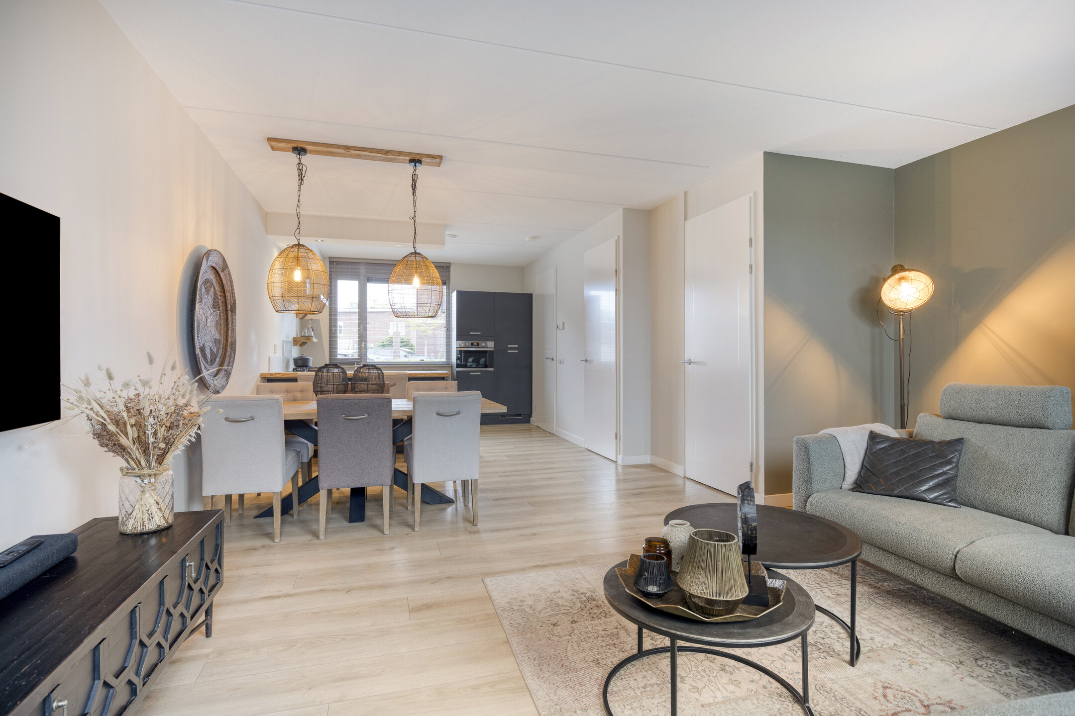 – de uitgebouwde woonkamer beschikt over een moderne laminaatvloer met comfortabele vloerverwarming, een stucwerk wandafwerking en grote raampartijen met veel lichtinval;
