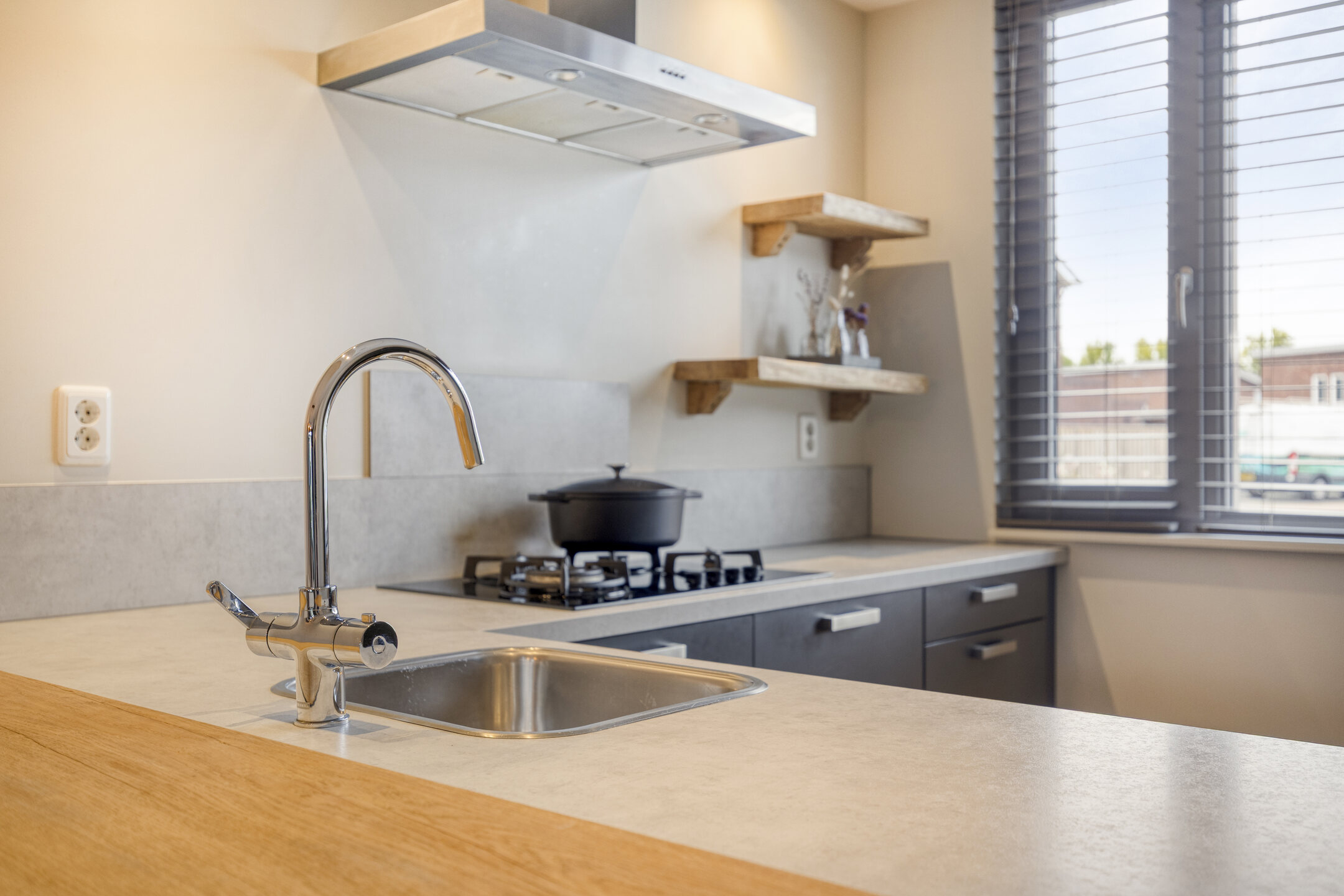 – de open keuken aan de voorzijde is voorzien van een moderne keukeninrichting met ingebouwde gaskookplaat, afzuigkap, vaatwasser en een kokend waterkraan. In een los blok bevinden zich de combi-oven en de koelkast;