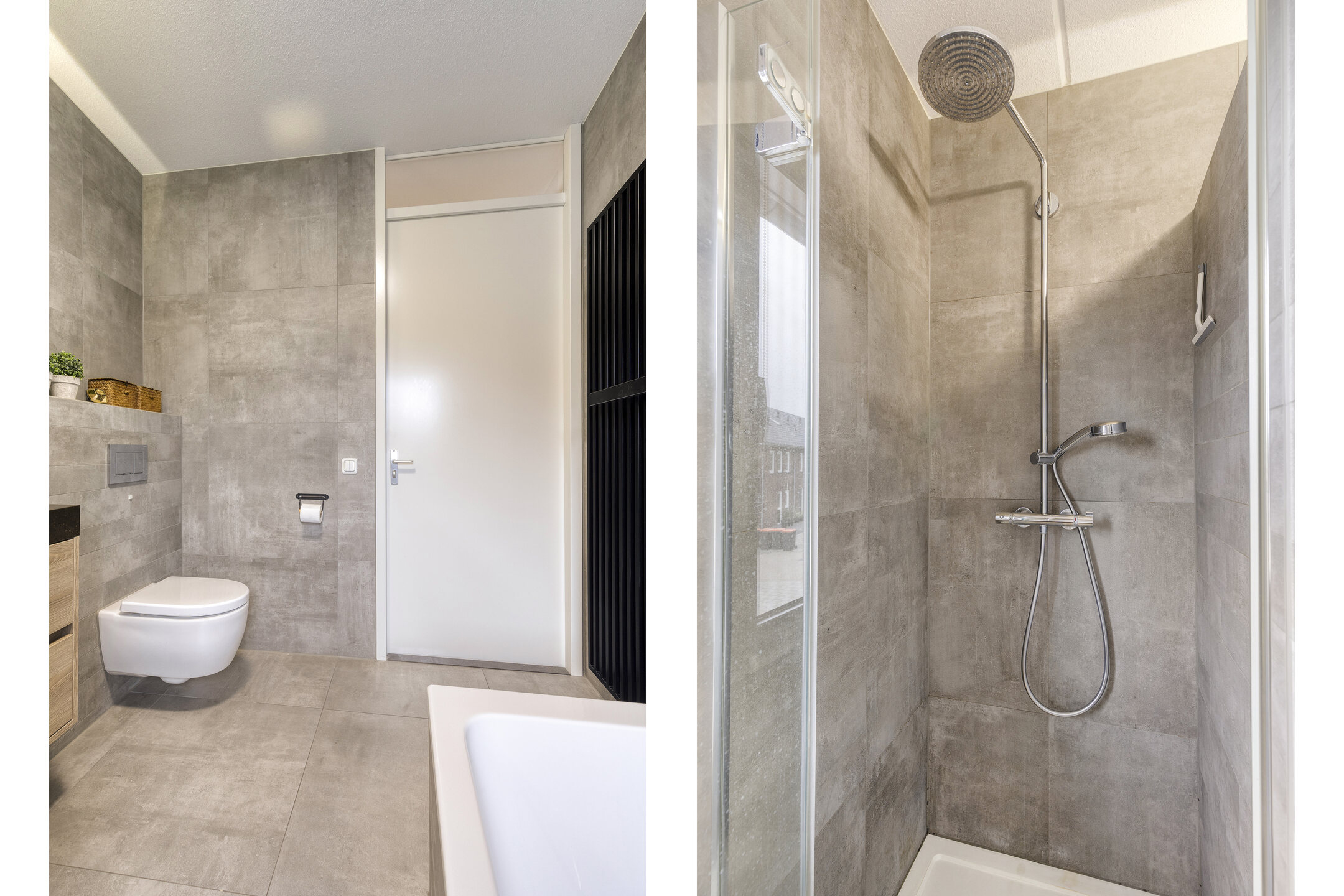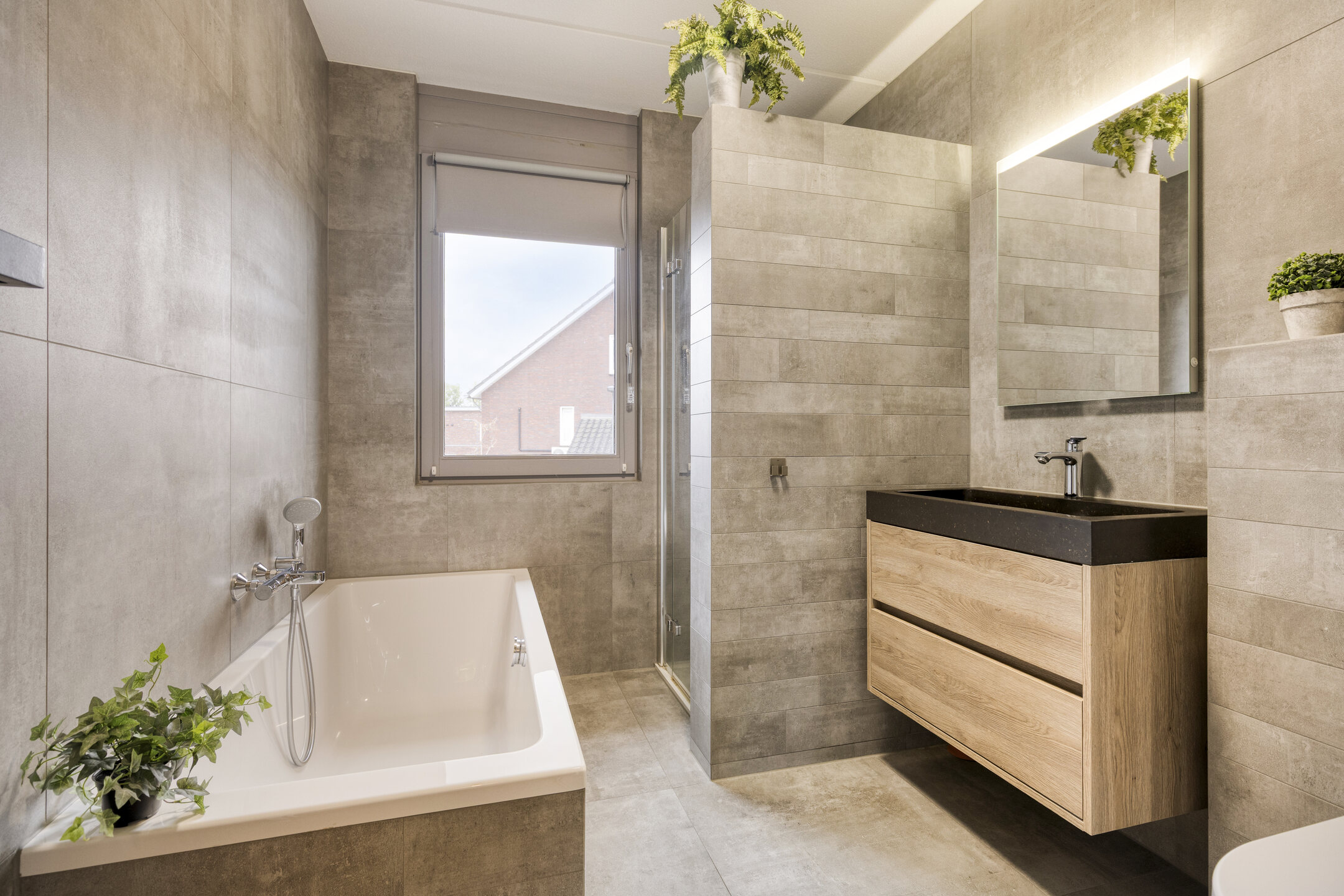 – de badkamer modern is afgewerkt en ingericht met een ligbad, inloopdouche, badkamermeubel met wastafel, toilet en een designradiator;