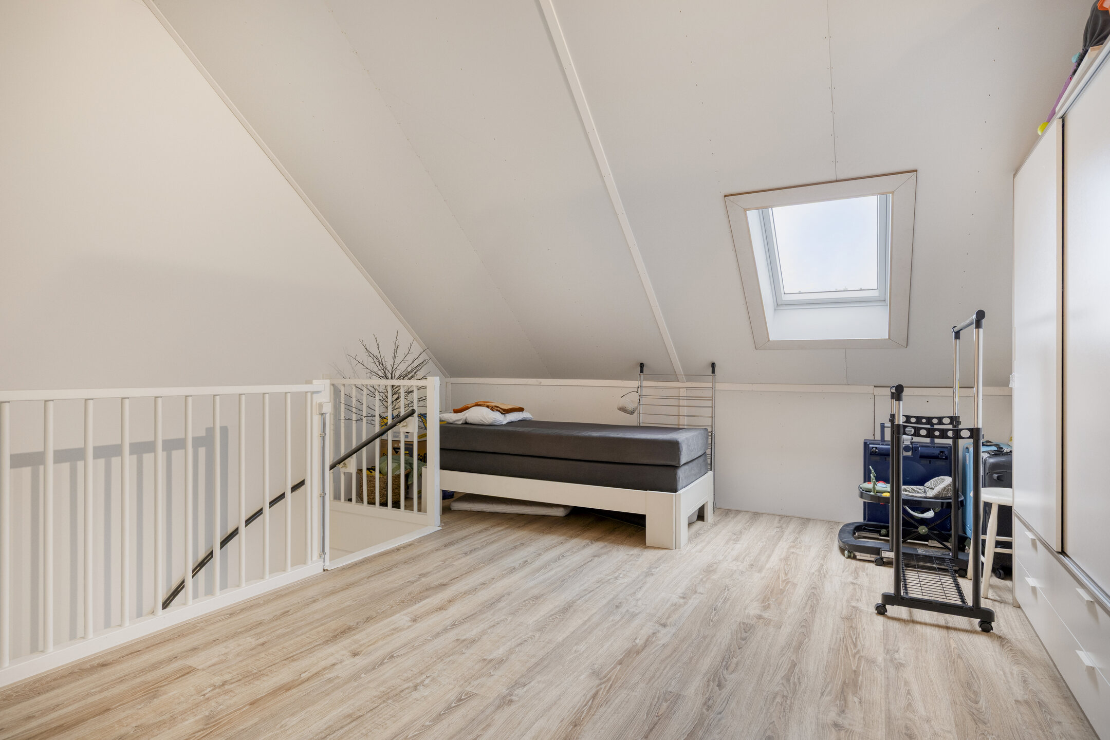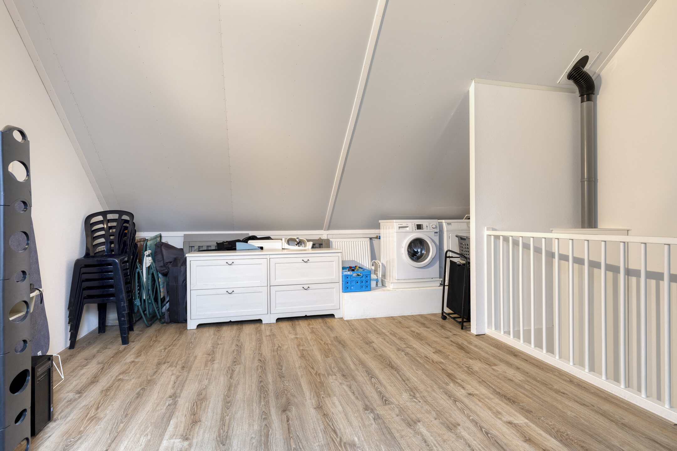 – de tweede verdieping is ingericht als royale zolderkamer met dakraam, wasmachineaansluiting en bergruimte achter de knieschotten;