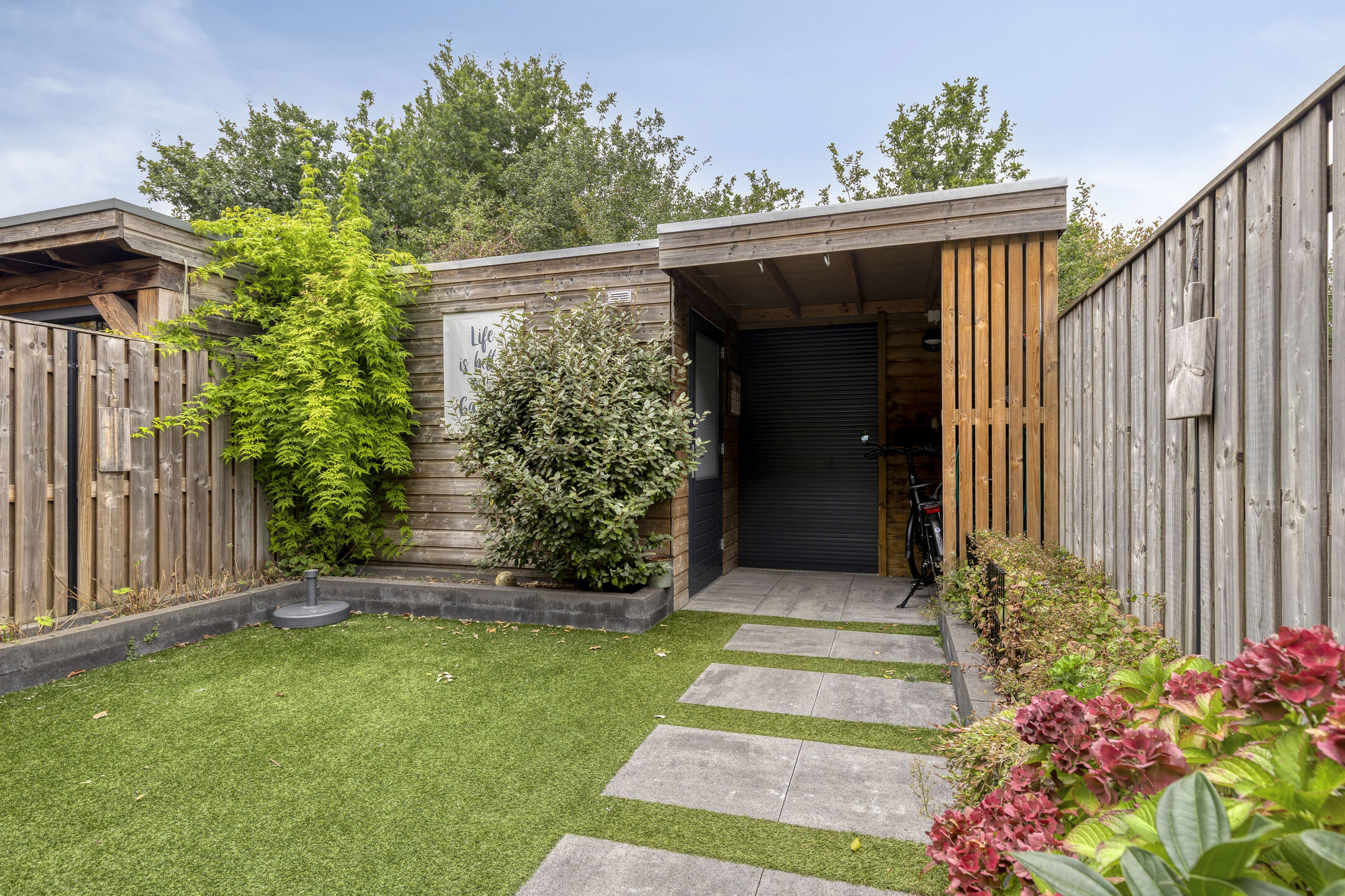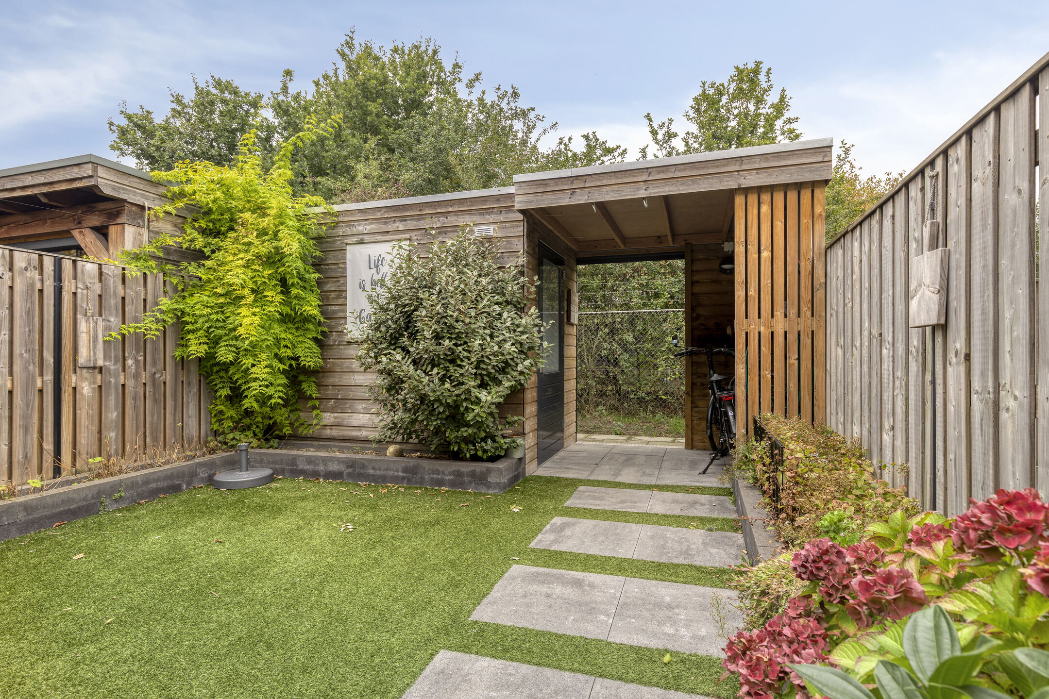 – de achtertuin is gelegen op het noordwesten, onderhoudsvriendelijk is aangelegd met kunstgras, borders en een houten berging met overkapping;