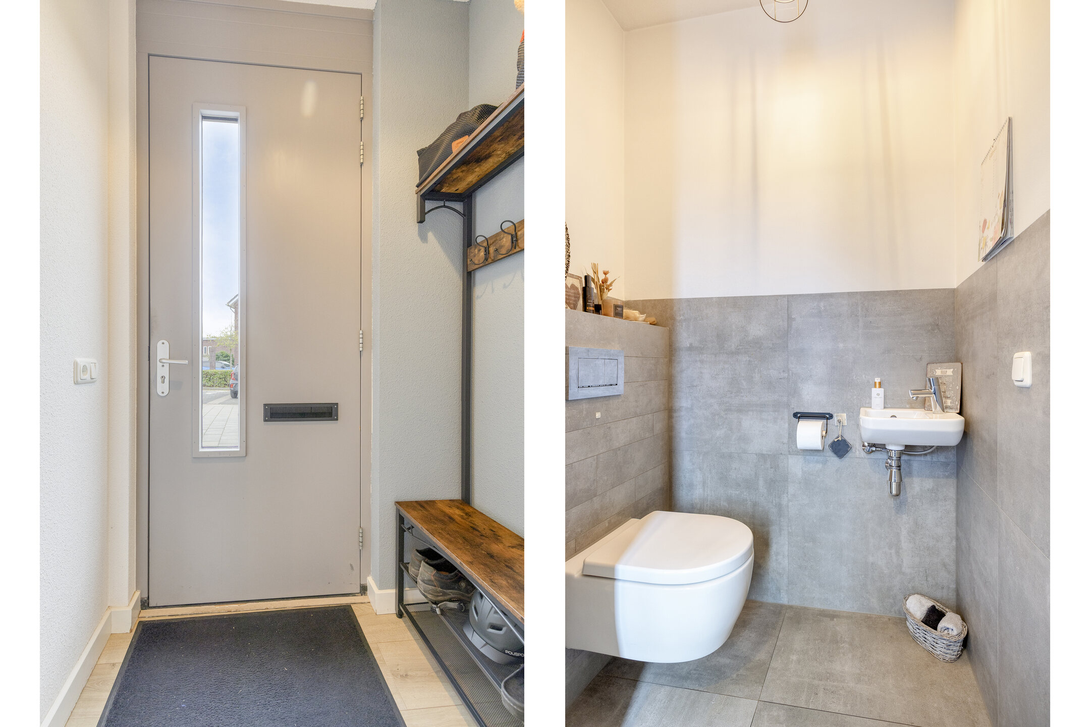 – de hal toegang biedt tot de meterkast, toiletruimte (met fonteintje) en de woonkamer;