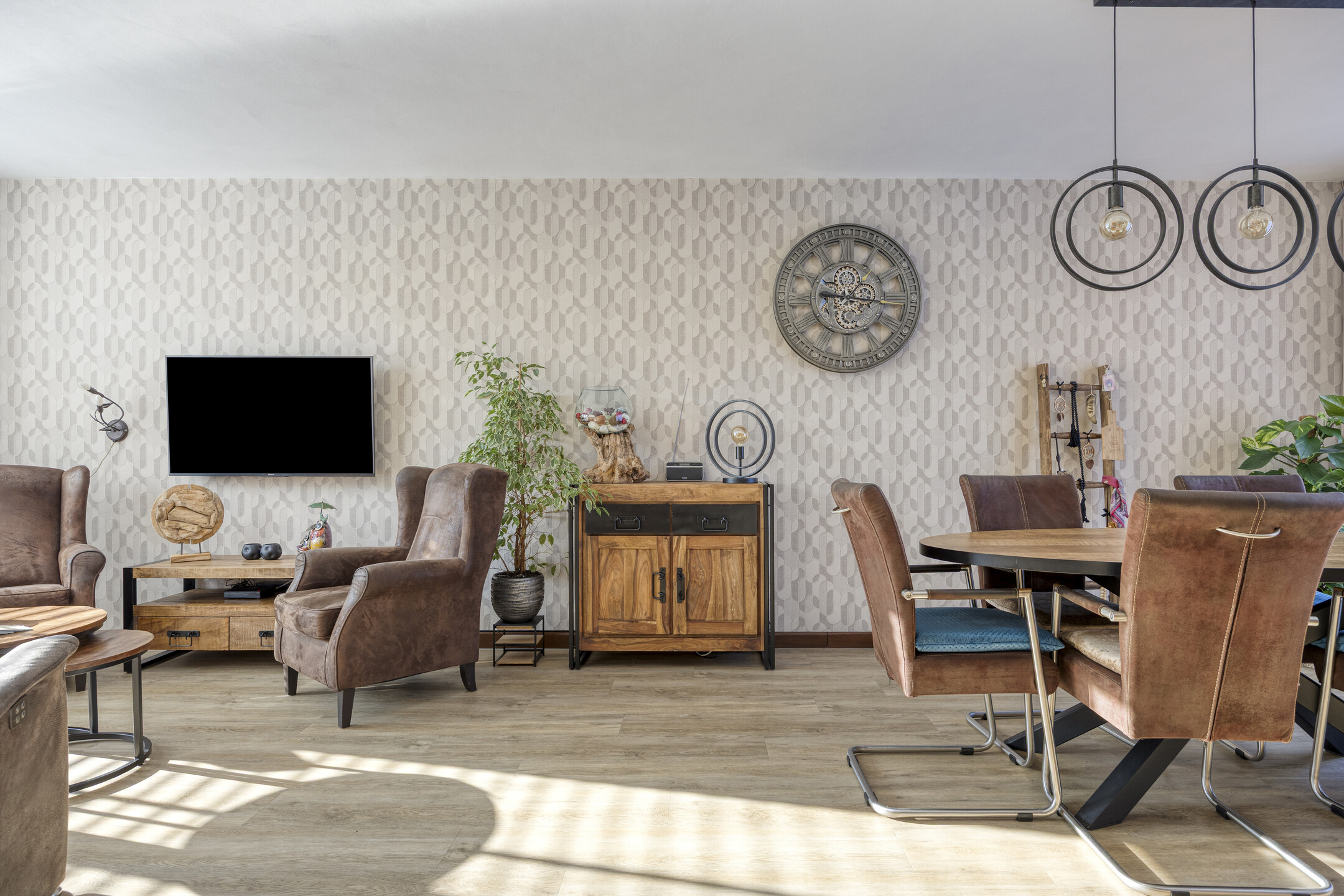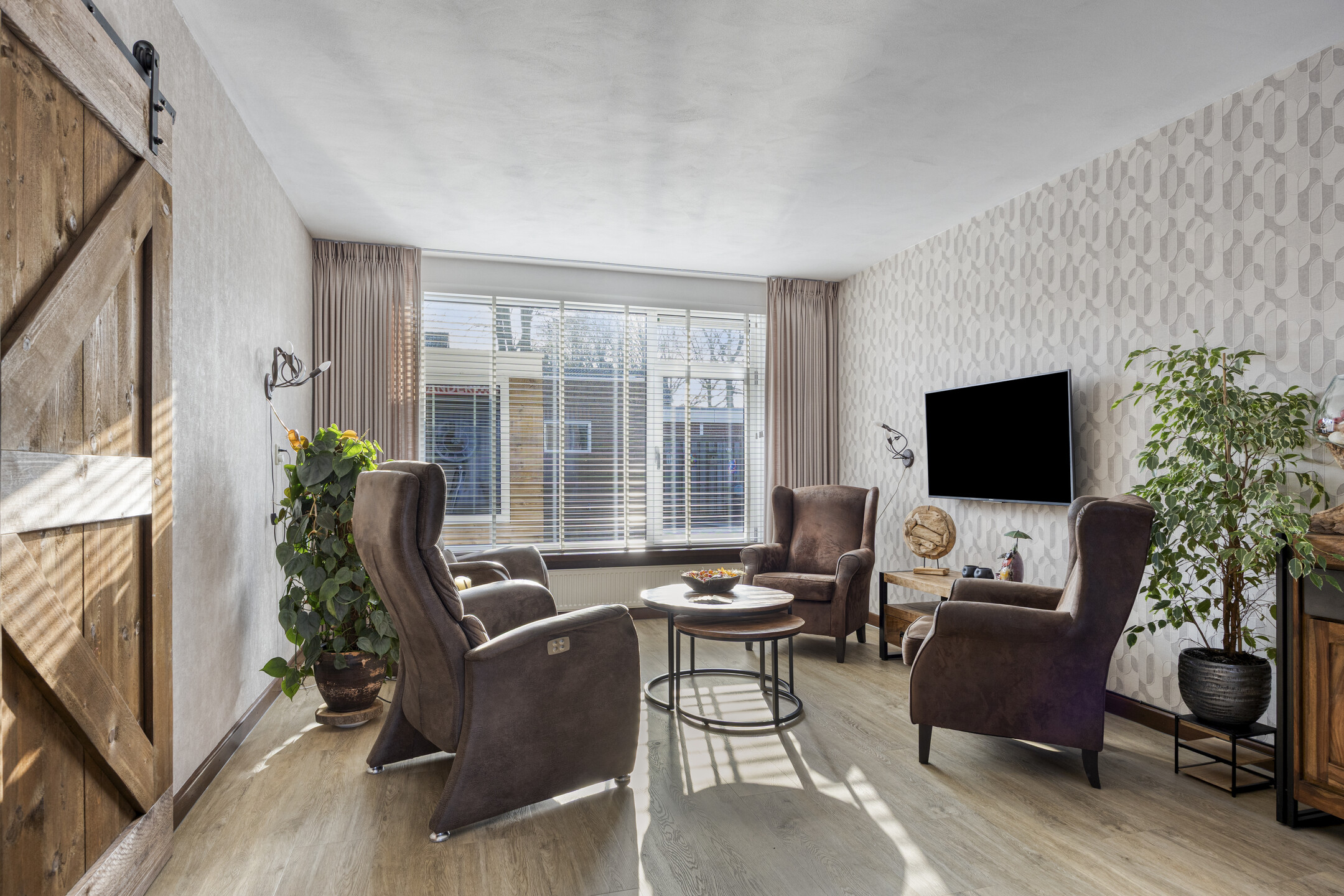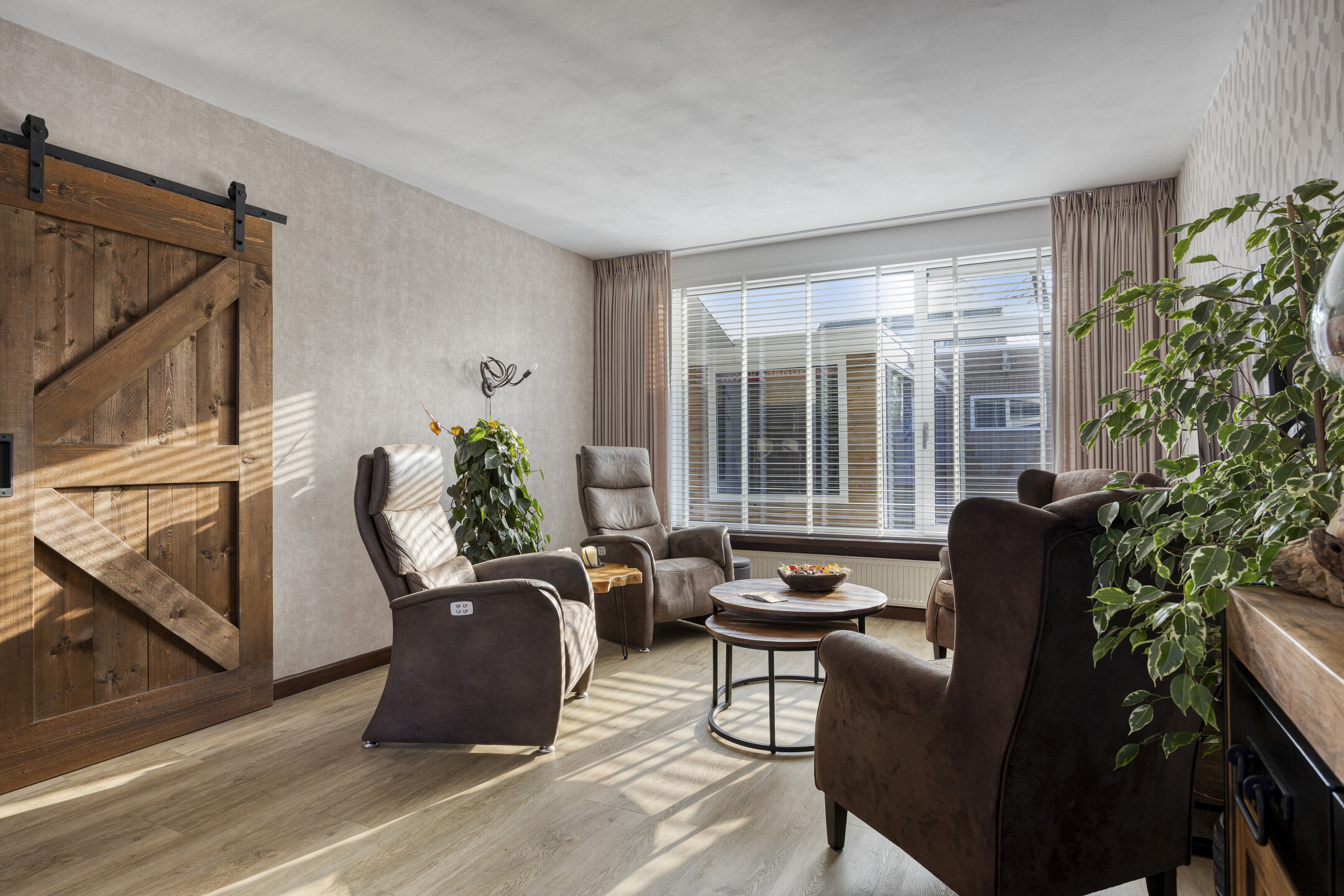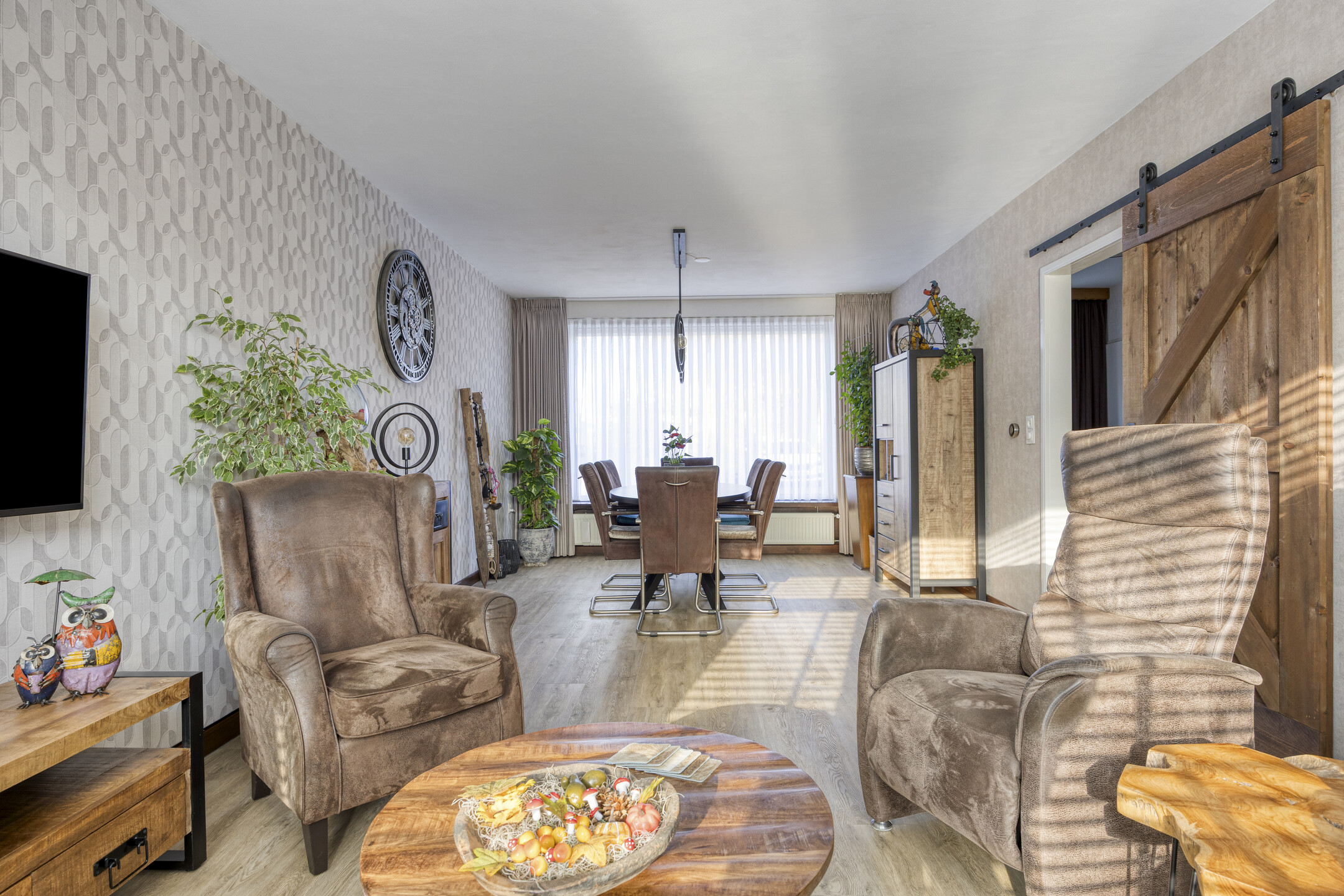 – de woonkamer is licht en ruim dankzij de grote raampartijen aan voor- en achterzijde en is afgewerkt met een nette PVC vloer;