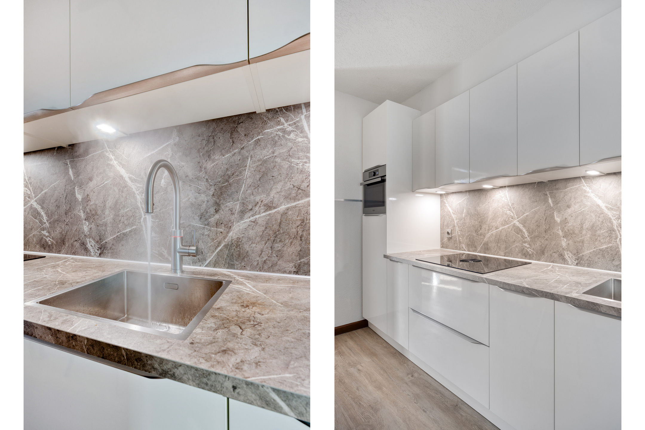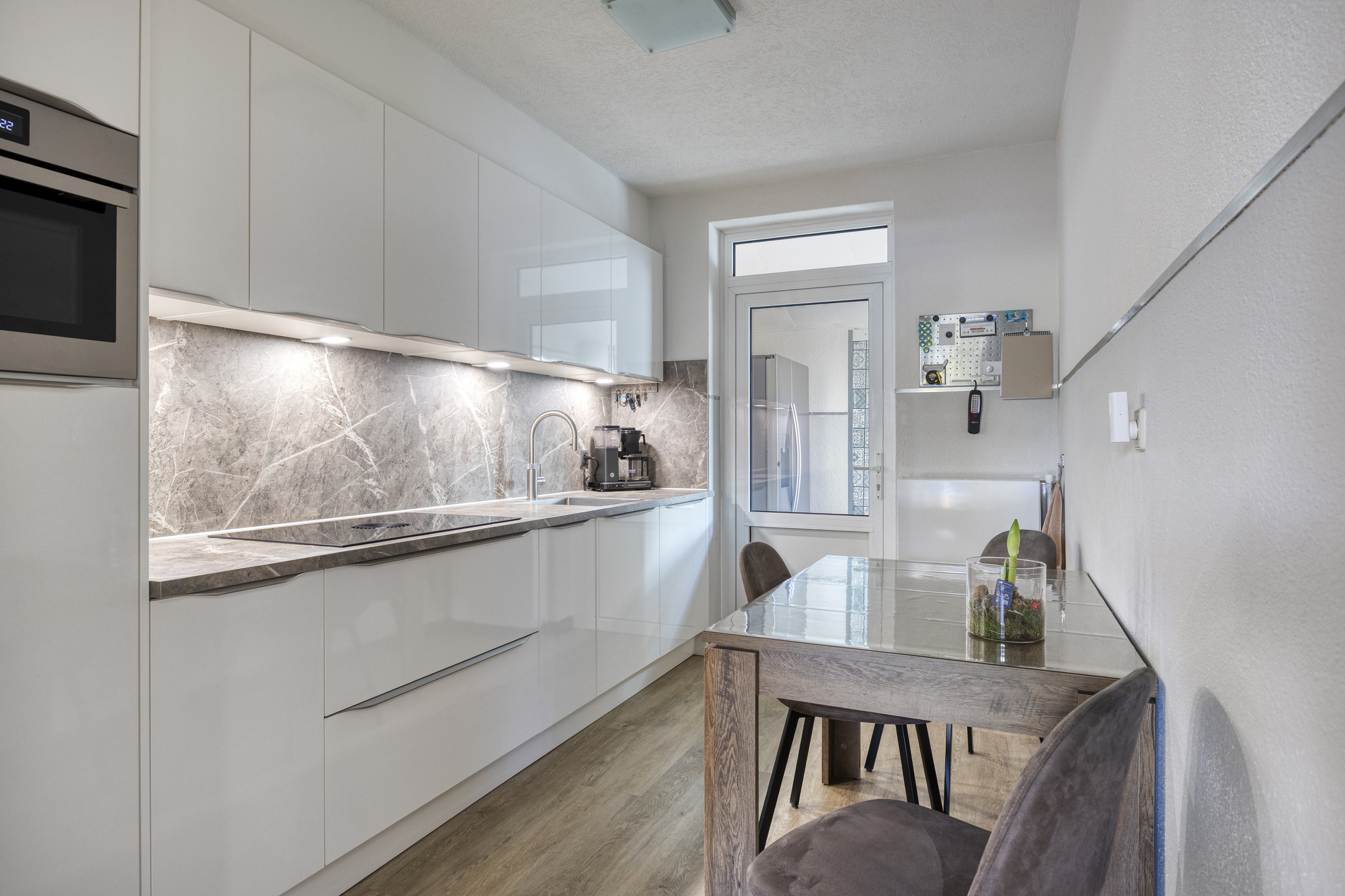 – de moderne keuken (2022) is uitgevoerd in hoogglans wit en voorzien van een inductiekookplaat met Bora afzuigsysteem, combioven, koelkast, vaatwasser en een kokendwaterkraan, een fijne plek om te koken en samen te eten;
