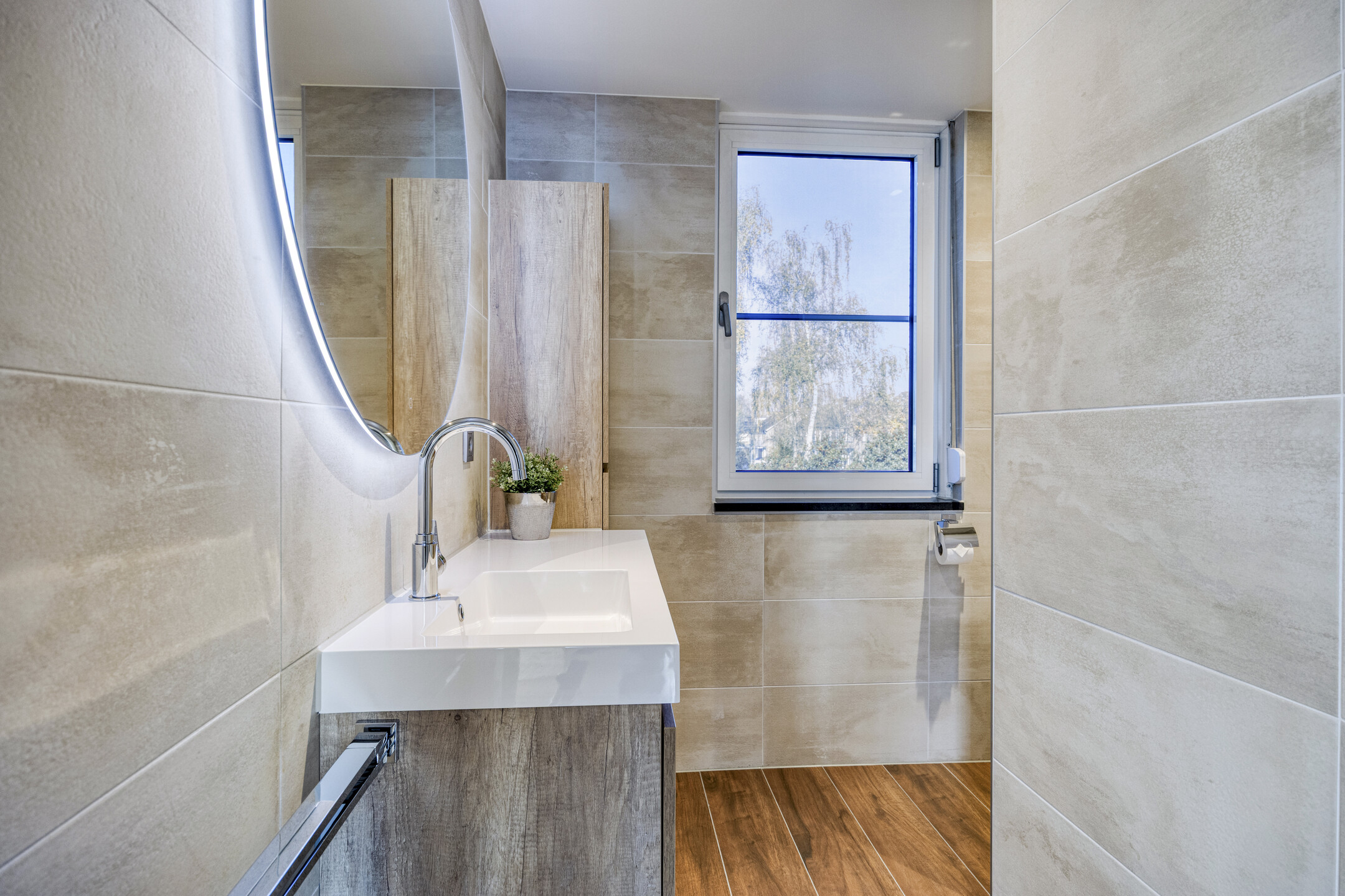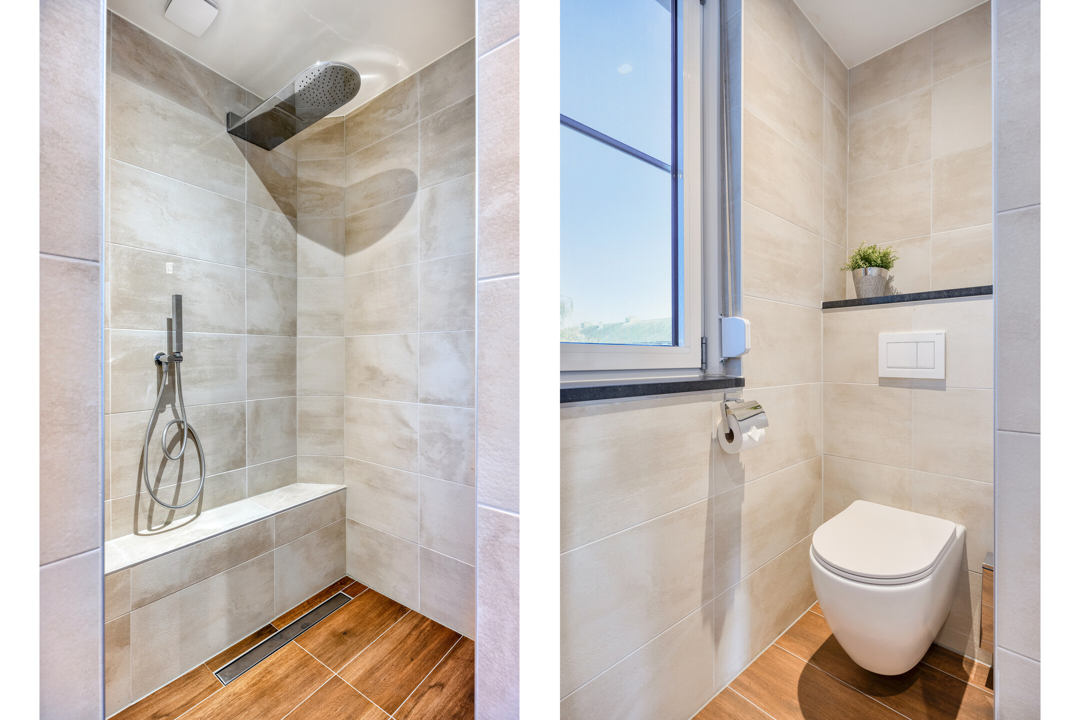 – de moderne badkamer (2022) is ingericht met een inloopdouche, wastafelmeubel en een tweede toilet;