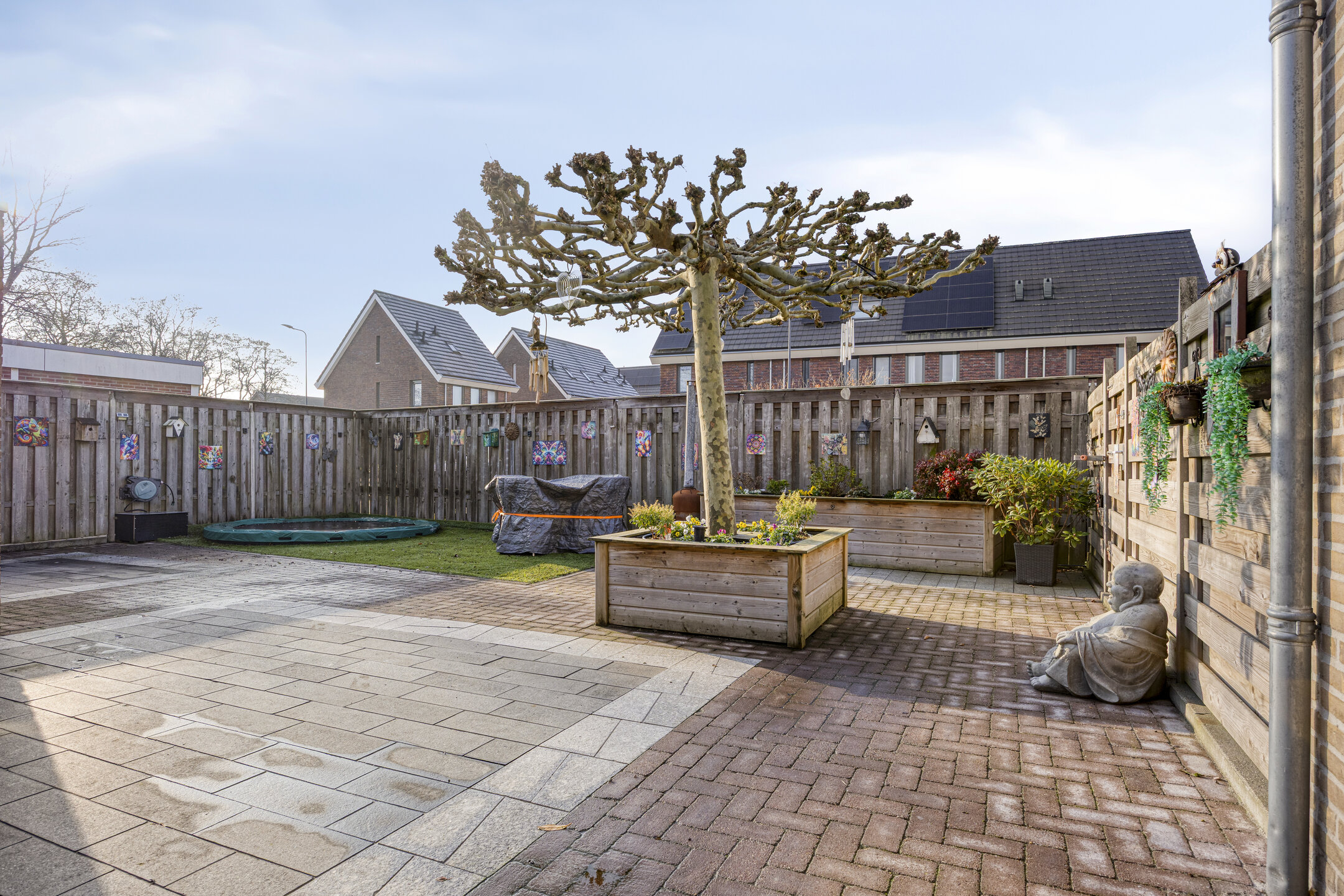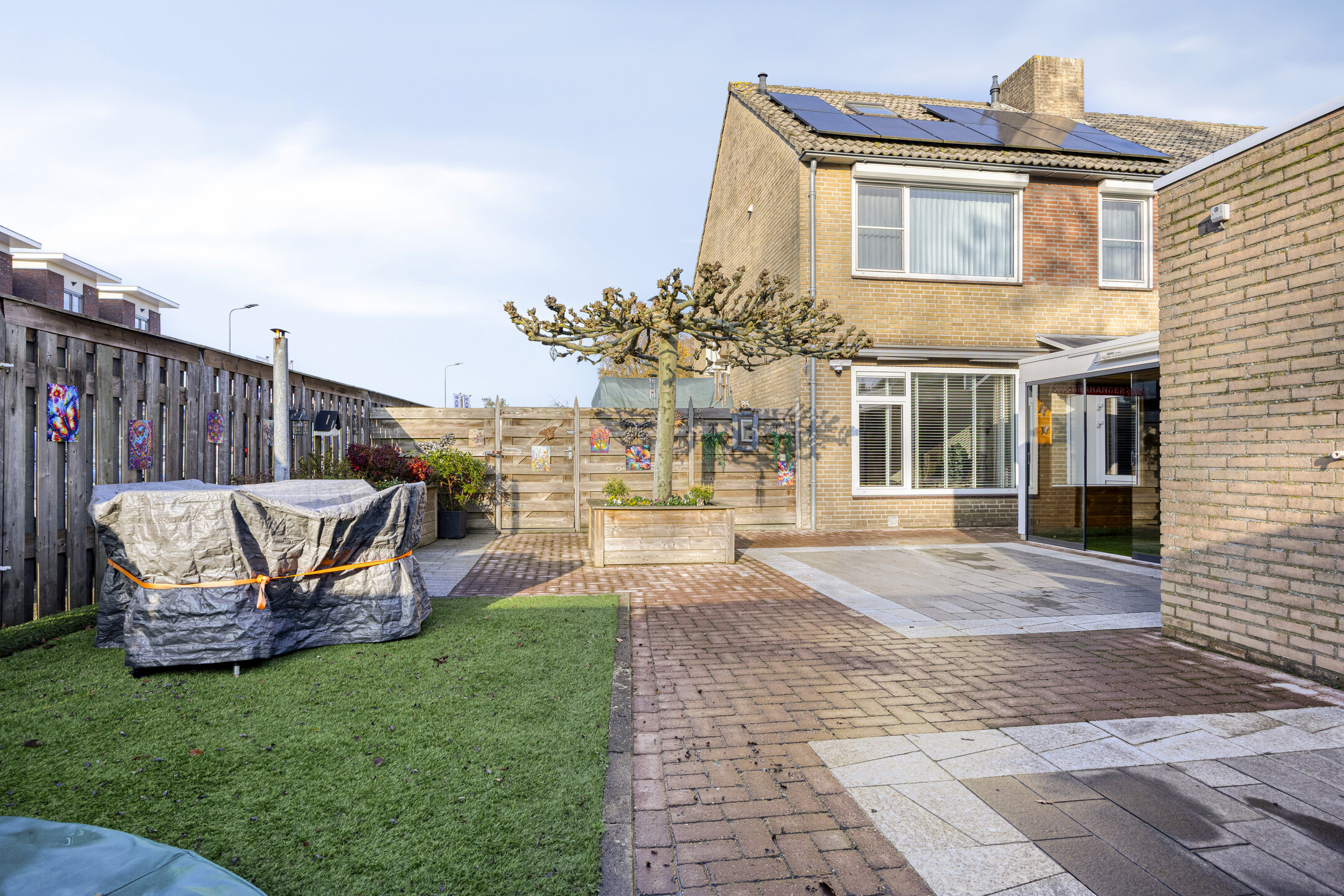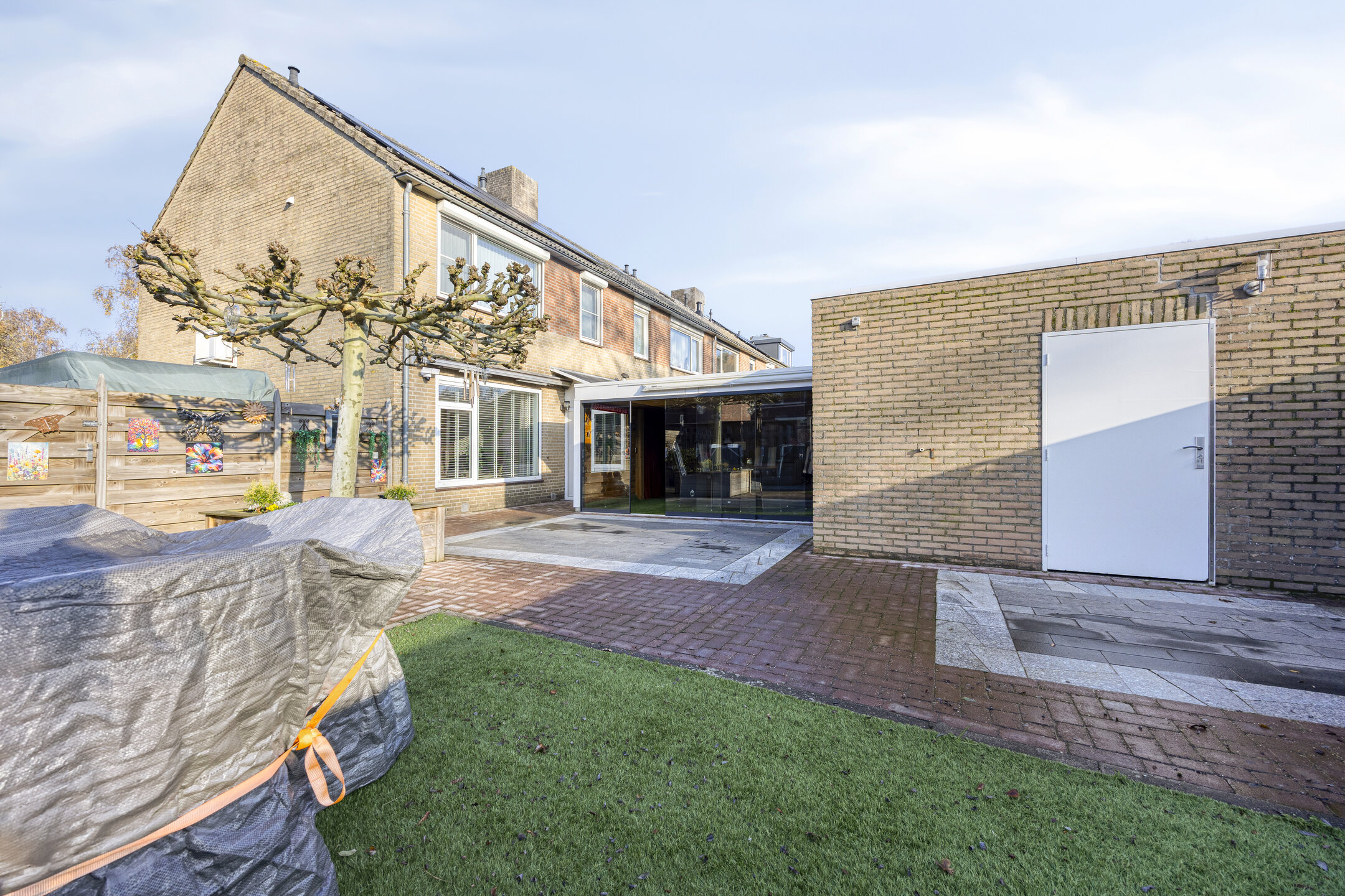 – de achtertuin is opvallend ruim, op het zuiden ligt en bestaat uit een mix van terrassen, kunstgras, een volwassen plataan en meerdere zitplekken;