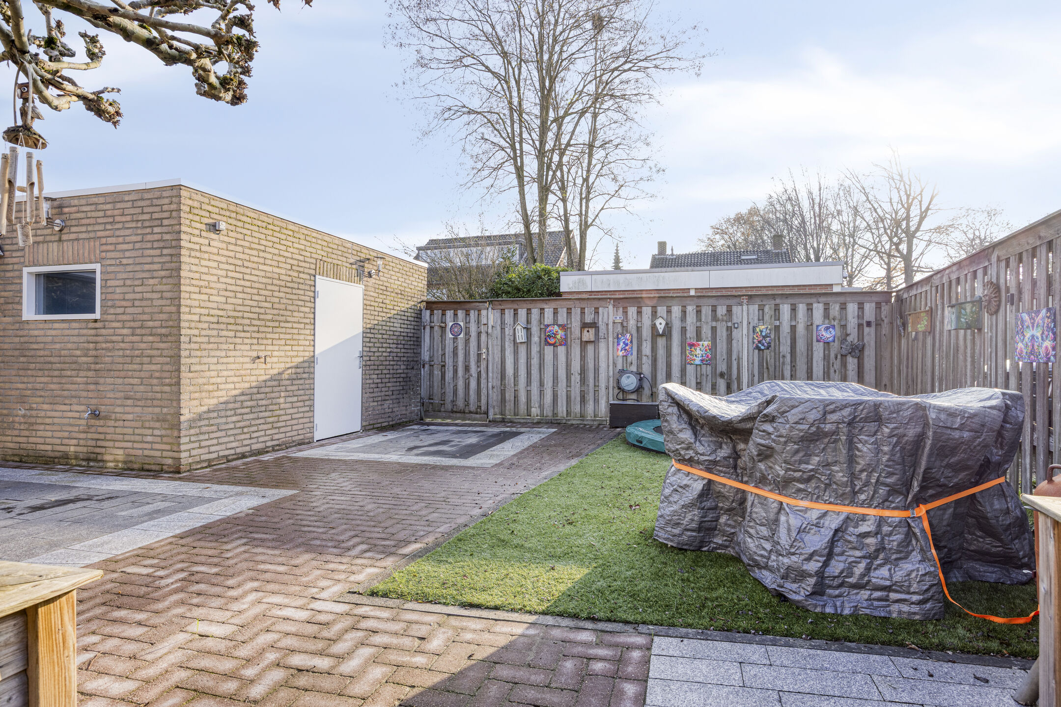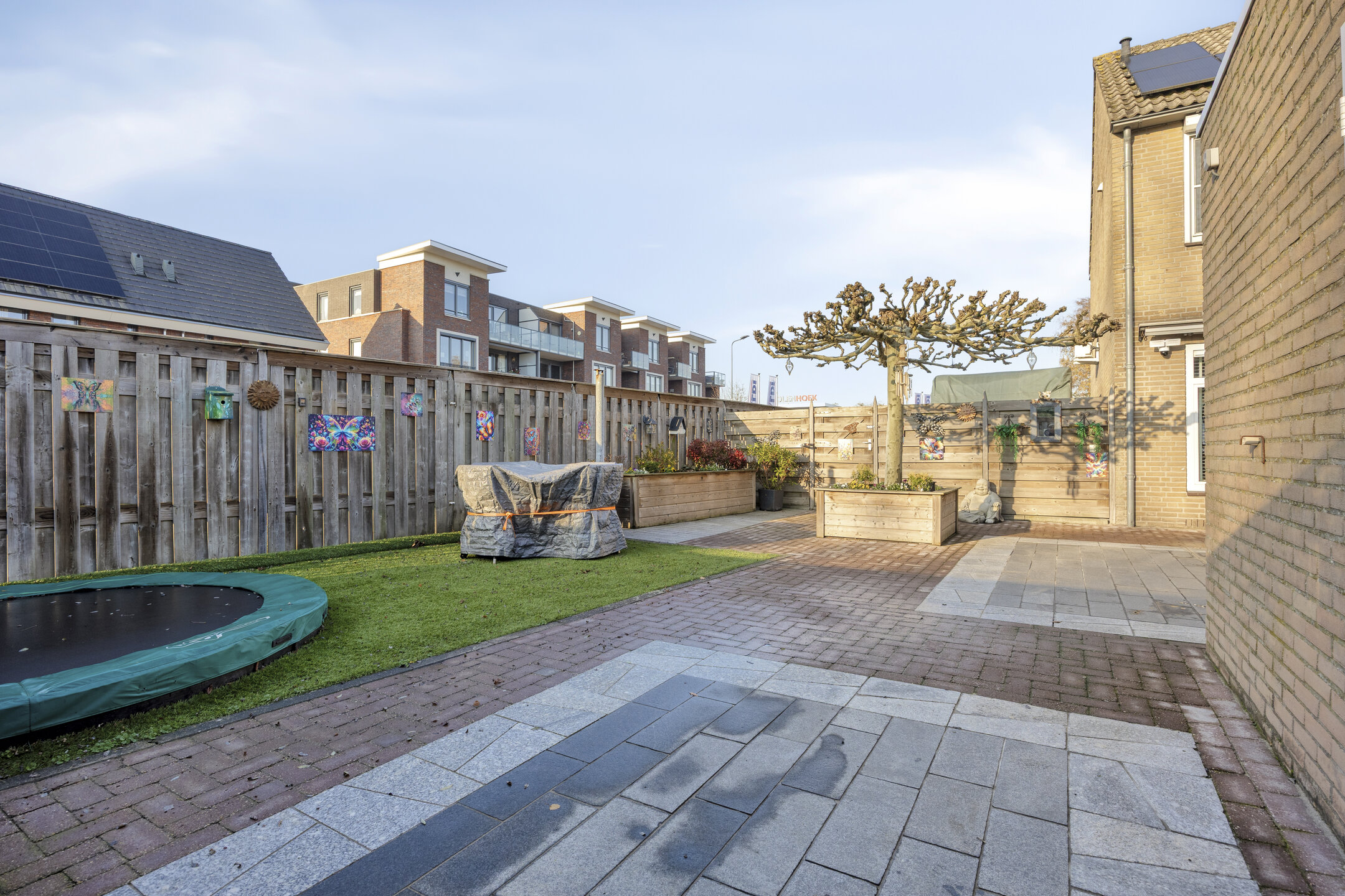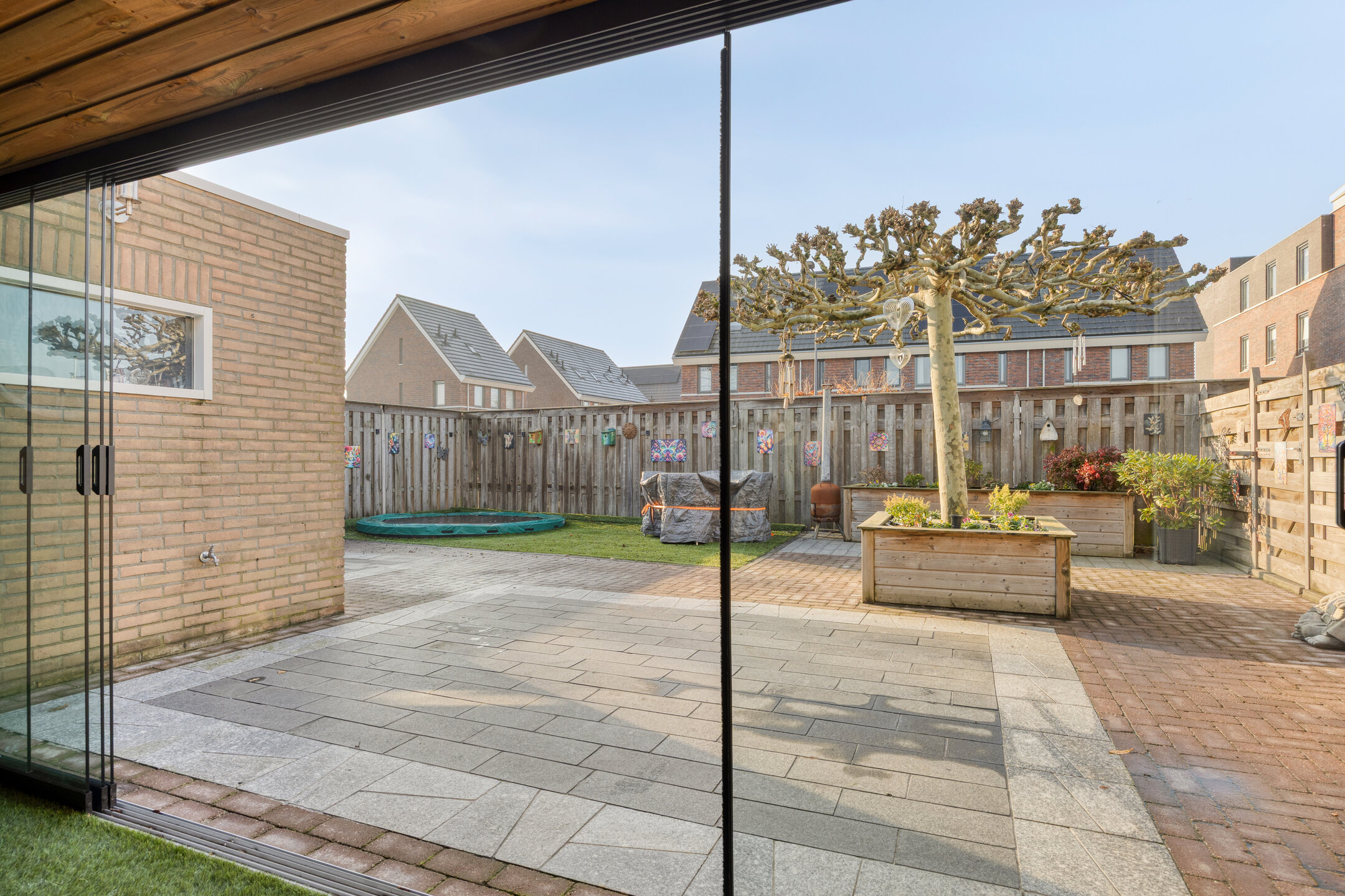 – de achtertuin is opvallend ruim, op het zuiden ligt en bestaat uit een mix van terrassen, kunstgras, een volwassen plataan en meerdere zitplekken;