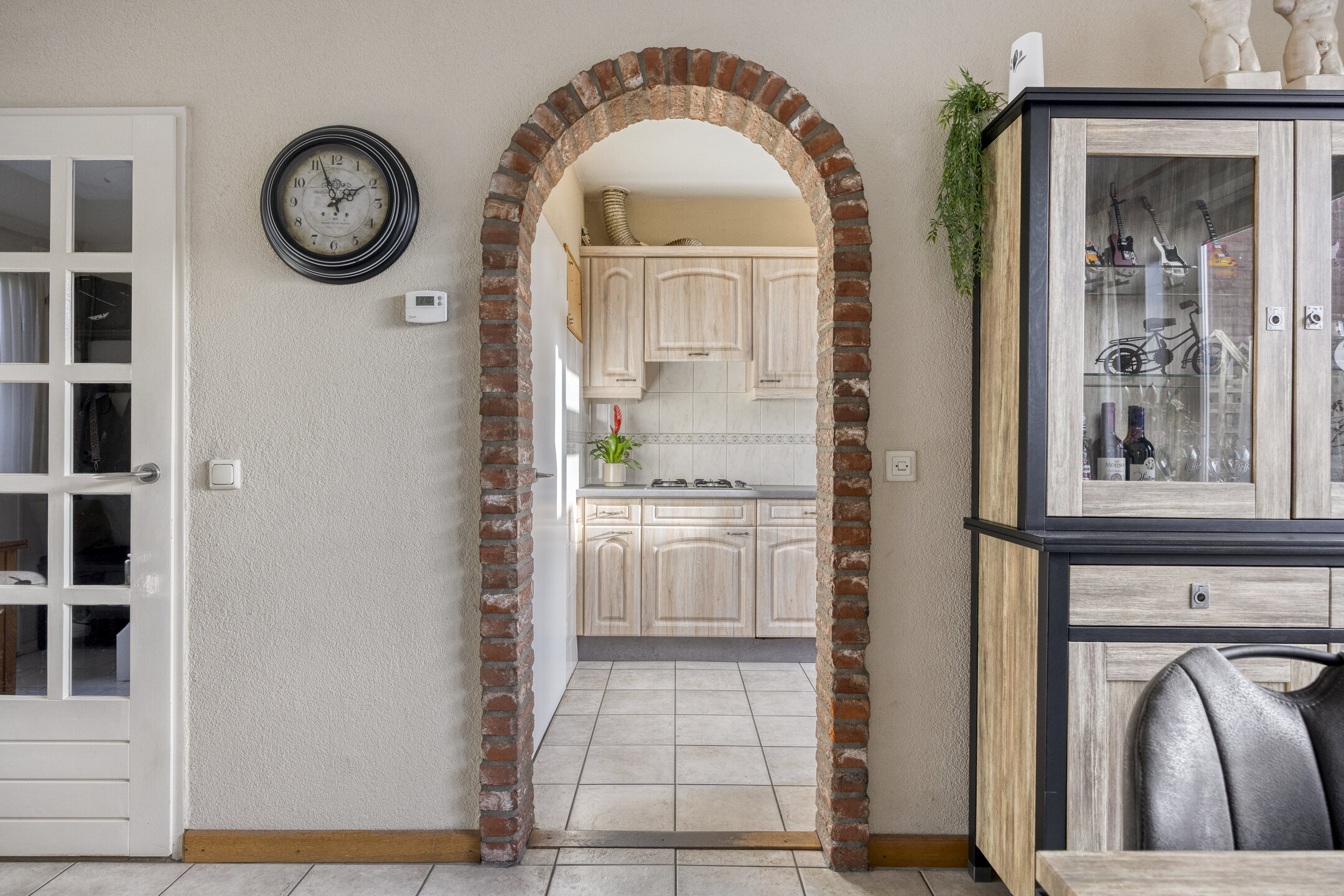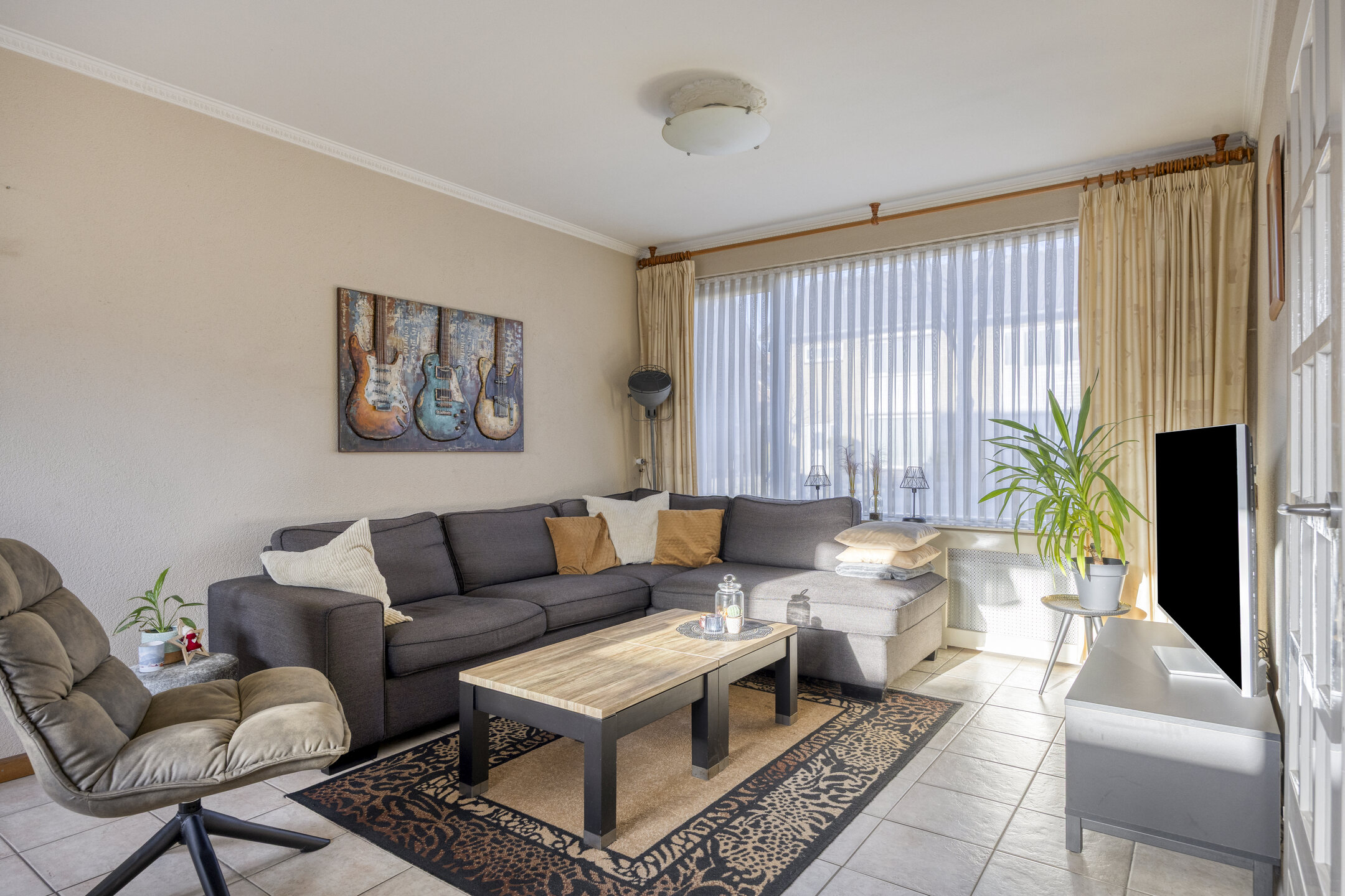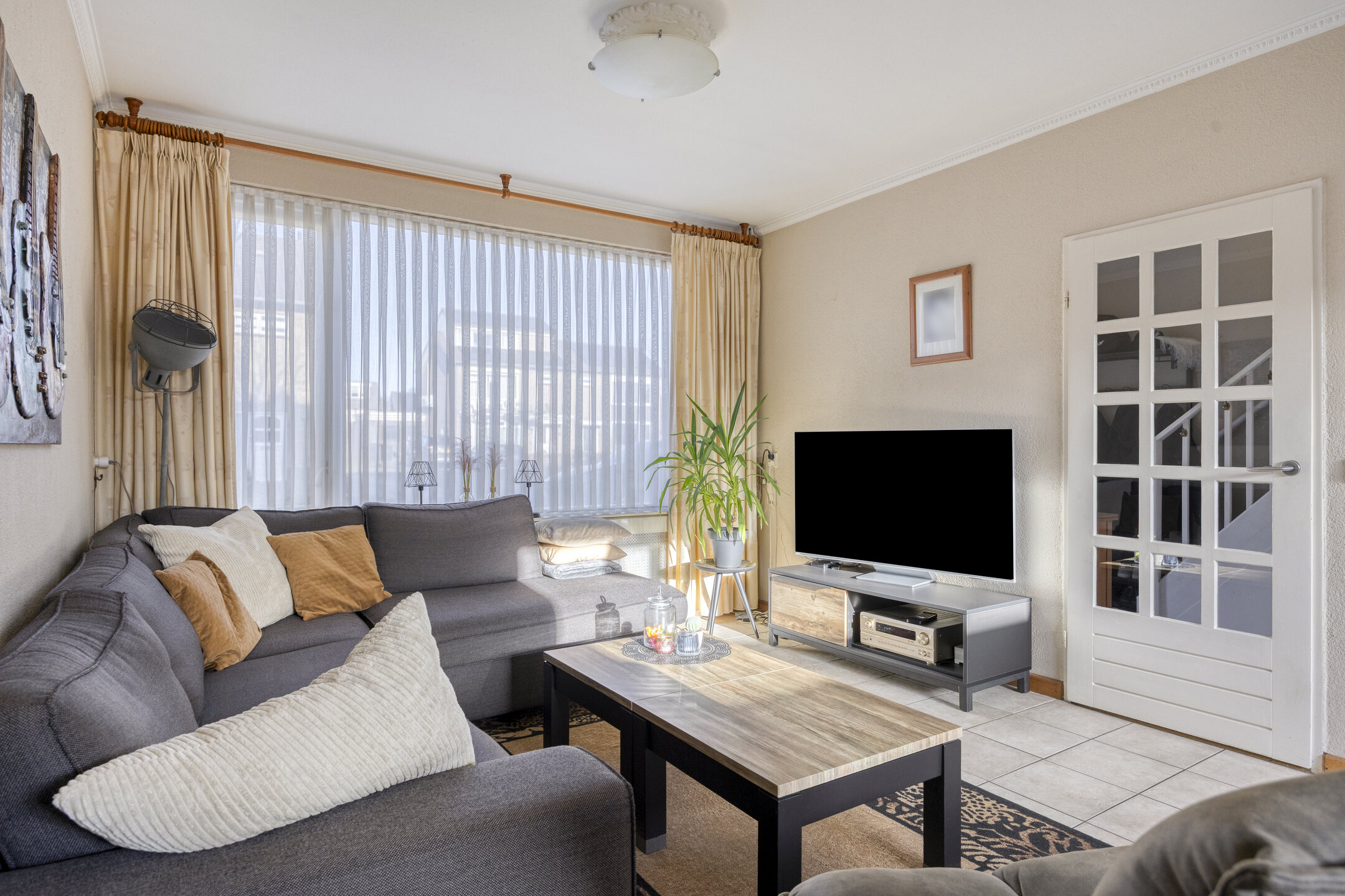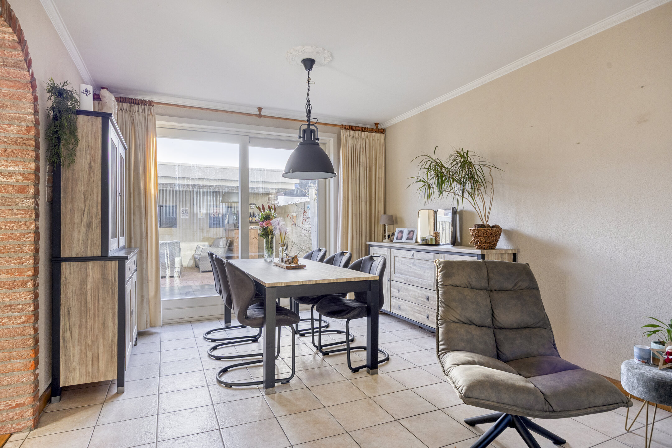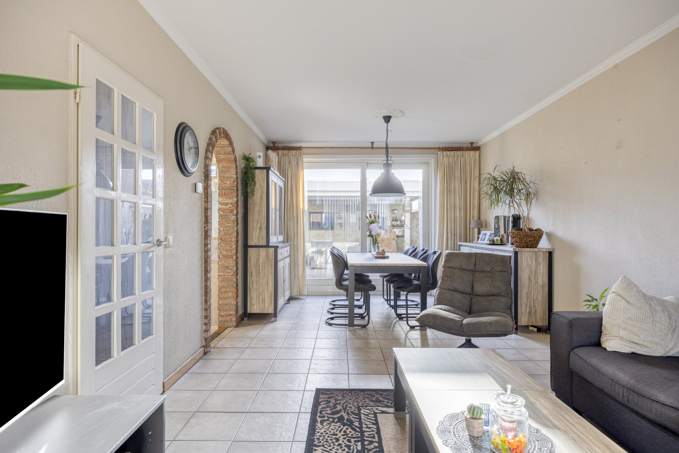 – de woonkamer is voorzien van een tegelvloer, een spachtelputz wandafwerking, een stucwerk plafond en een schuifpui naar de tuin;