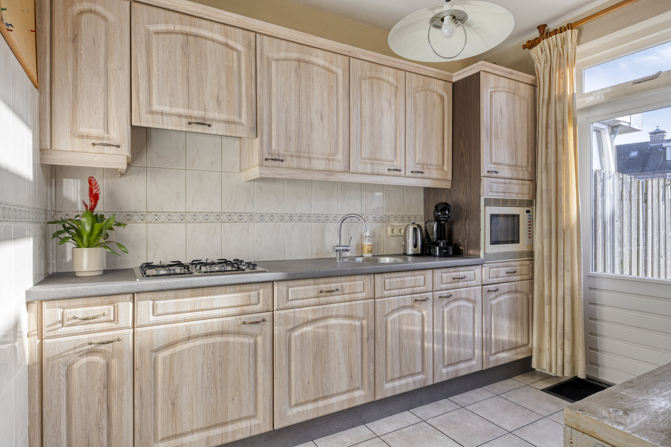 – de keuken is voorzien van een nette keukeninrichting met ingebouwde gaskookplaat, afzuigkap, magnetron en een vaatwasser;