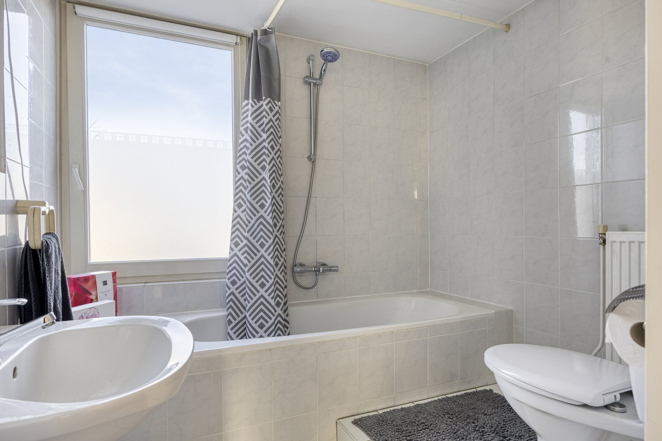 – de volledig betegelde badkamer is ingericht met een ligbad met douchescherm, een wastafel en een tweede toilet;