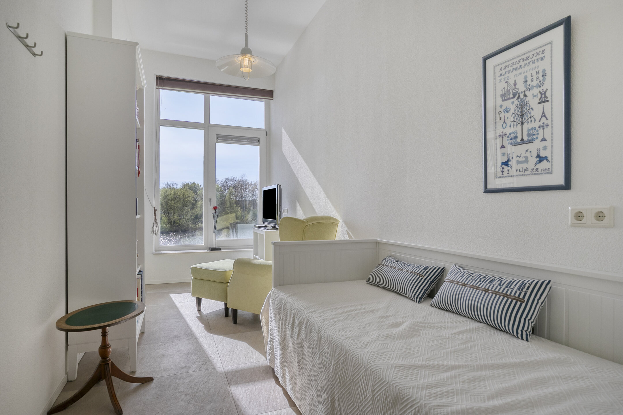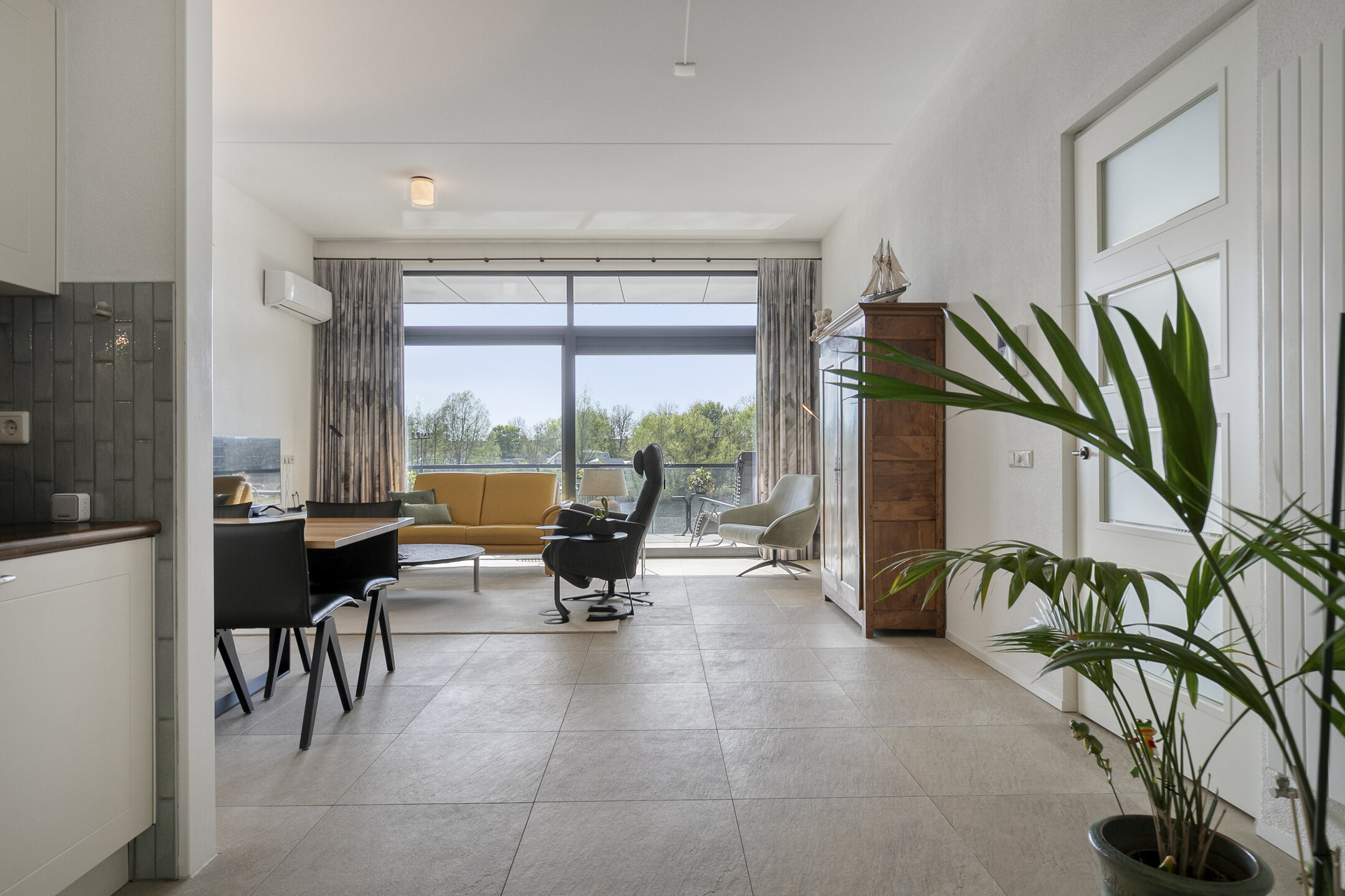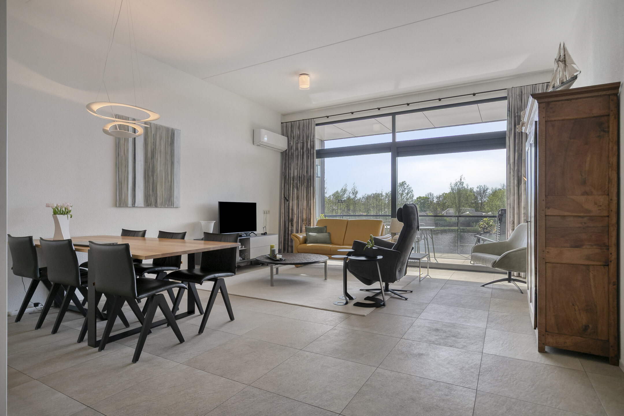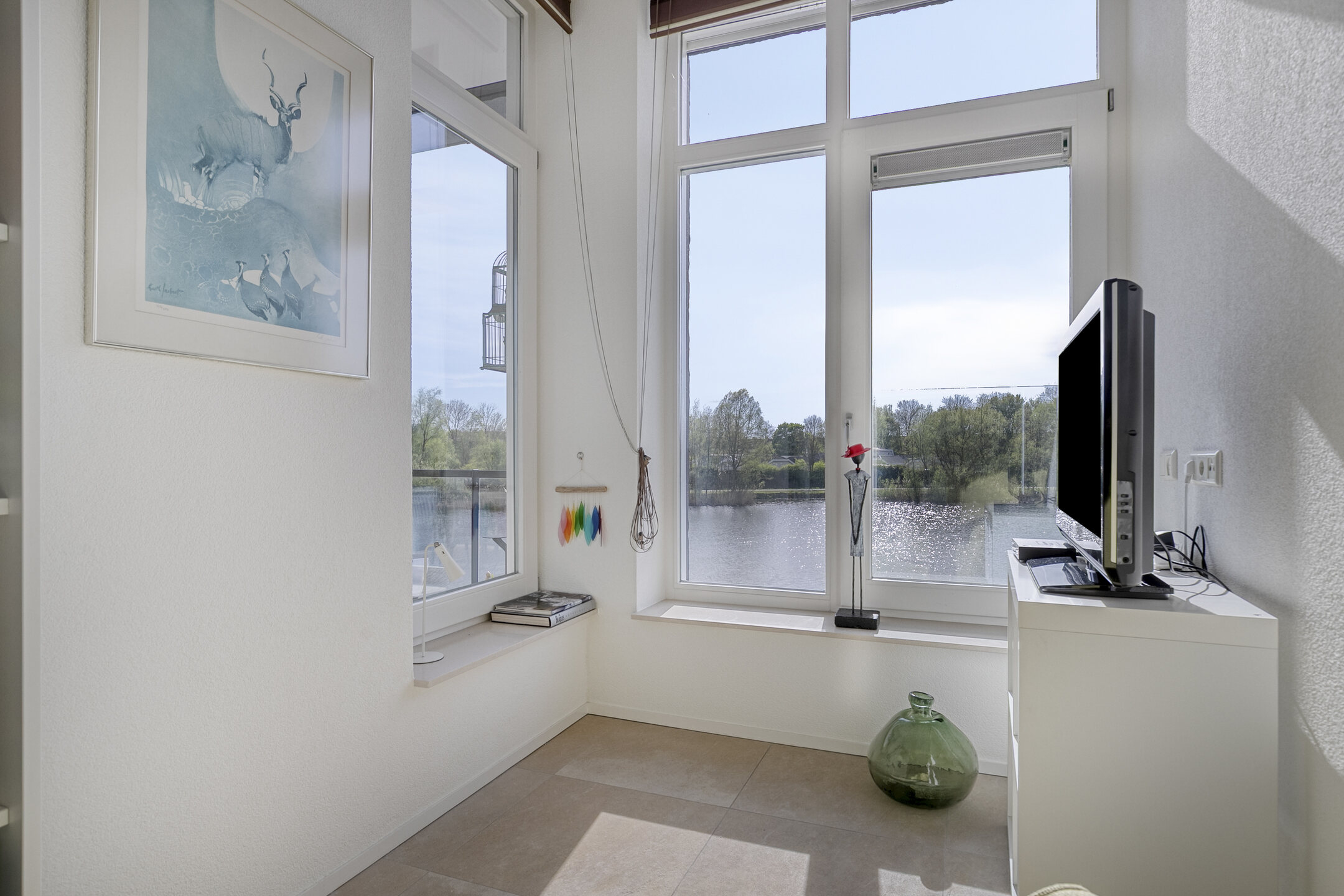 – de woonkamer over prettige lichtinval beschikt door de kamerbrede schuifpui van waar uit u geniet van een prachtig uitzicht over het water;