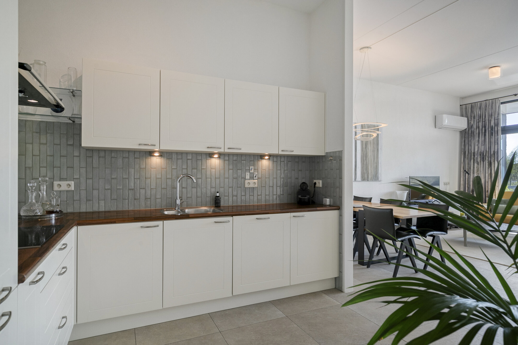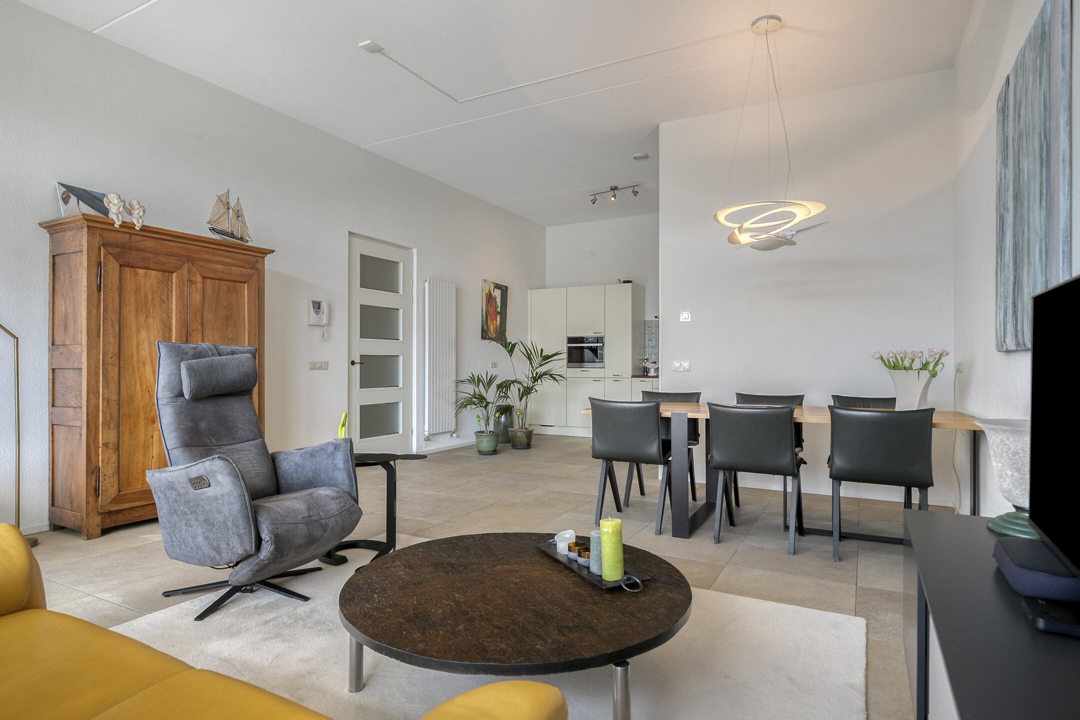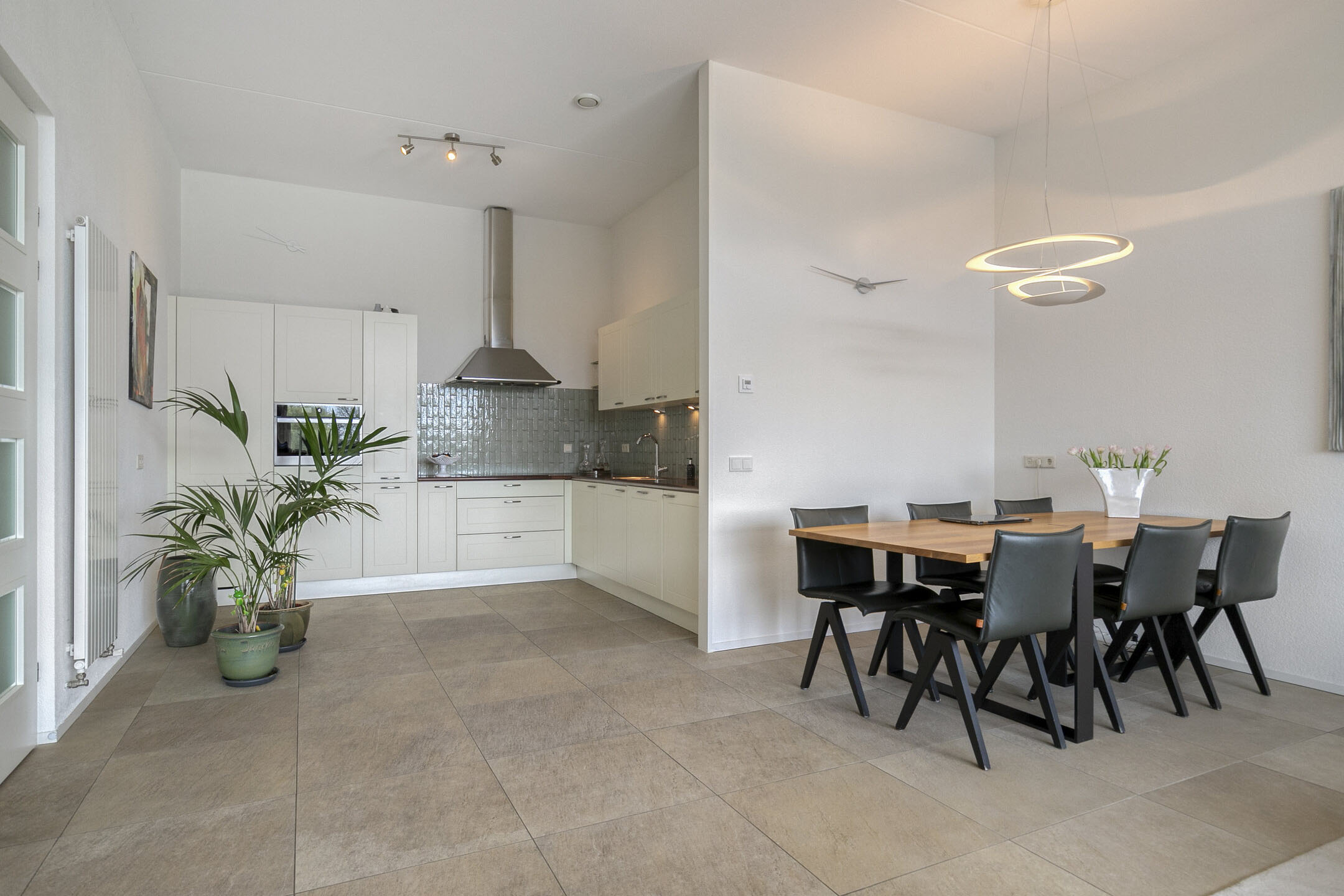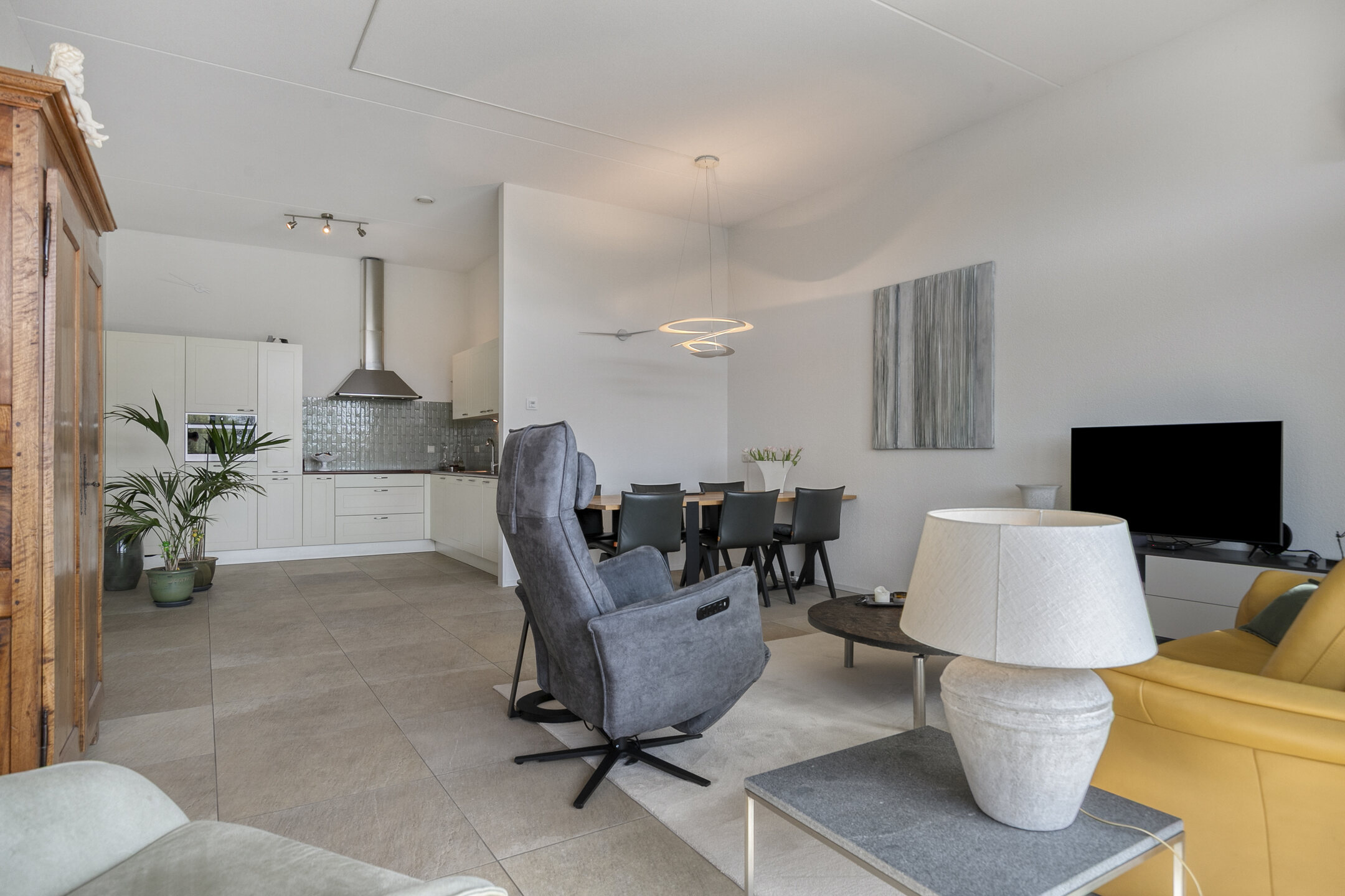 – de woonkamer is voorzien van een lichte tegelvloer en een spachtelputz wand- en plafondafwerking;