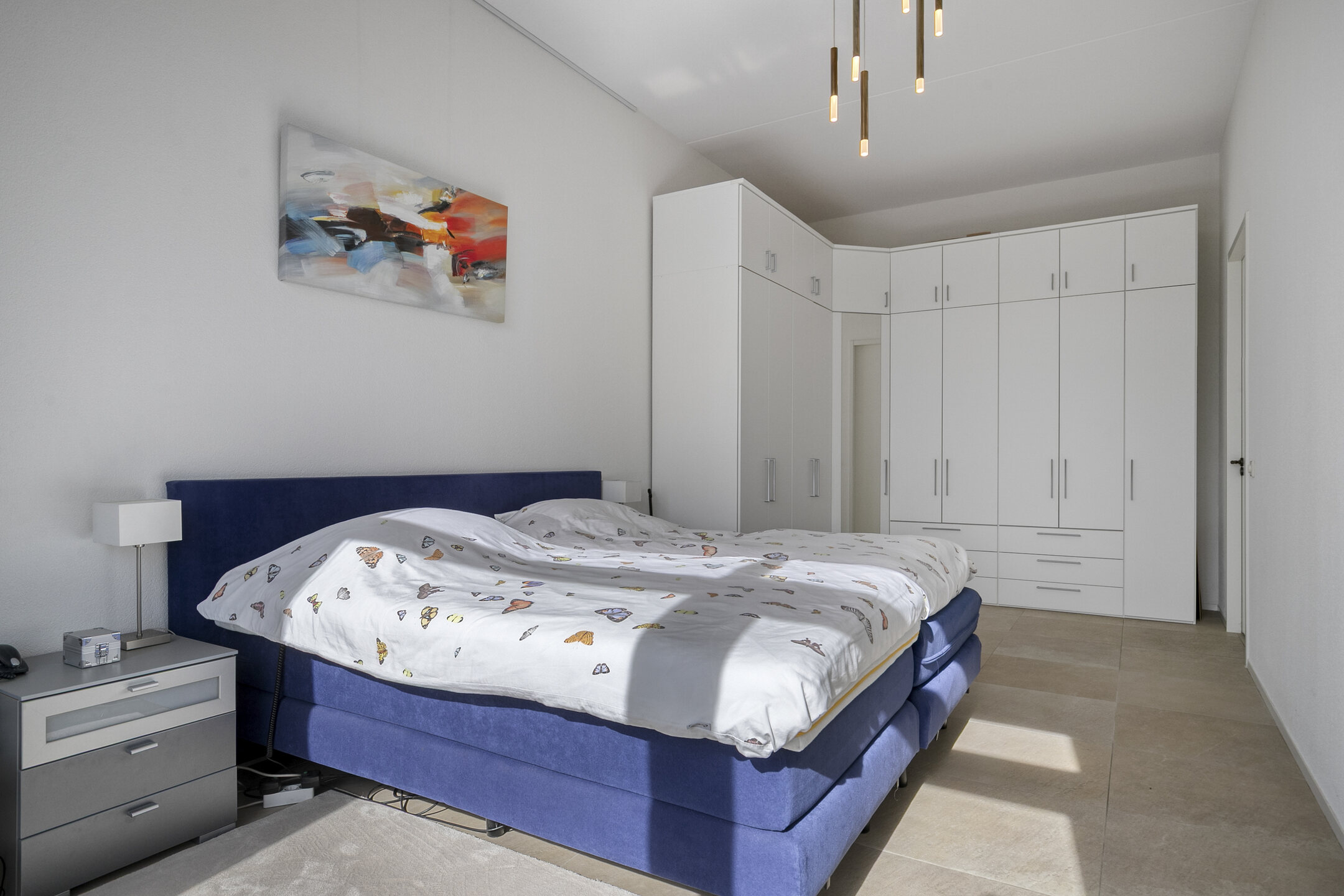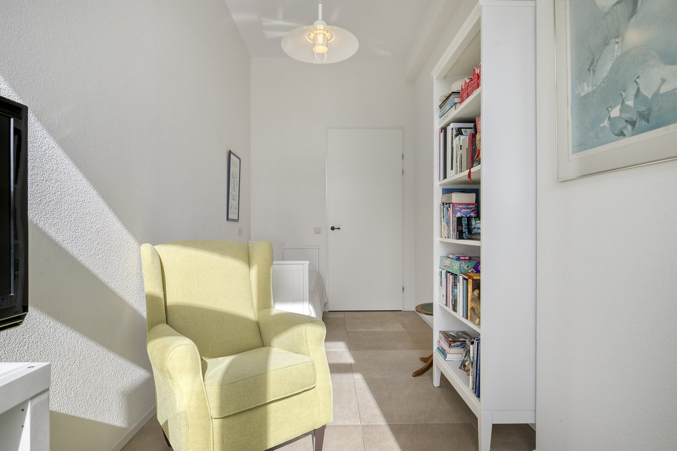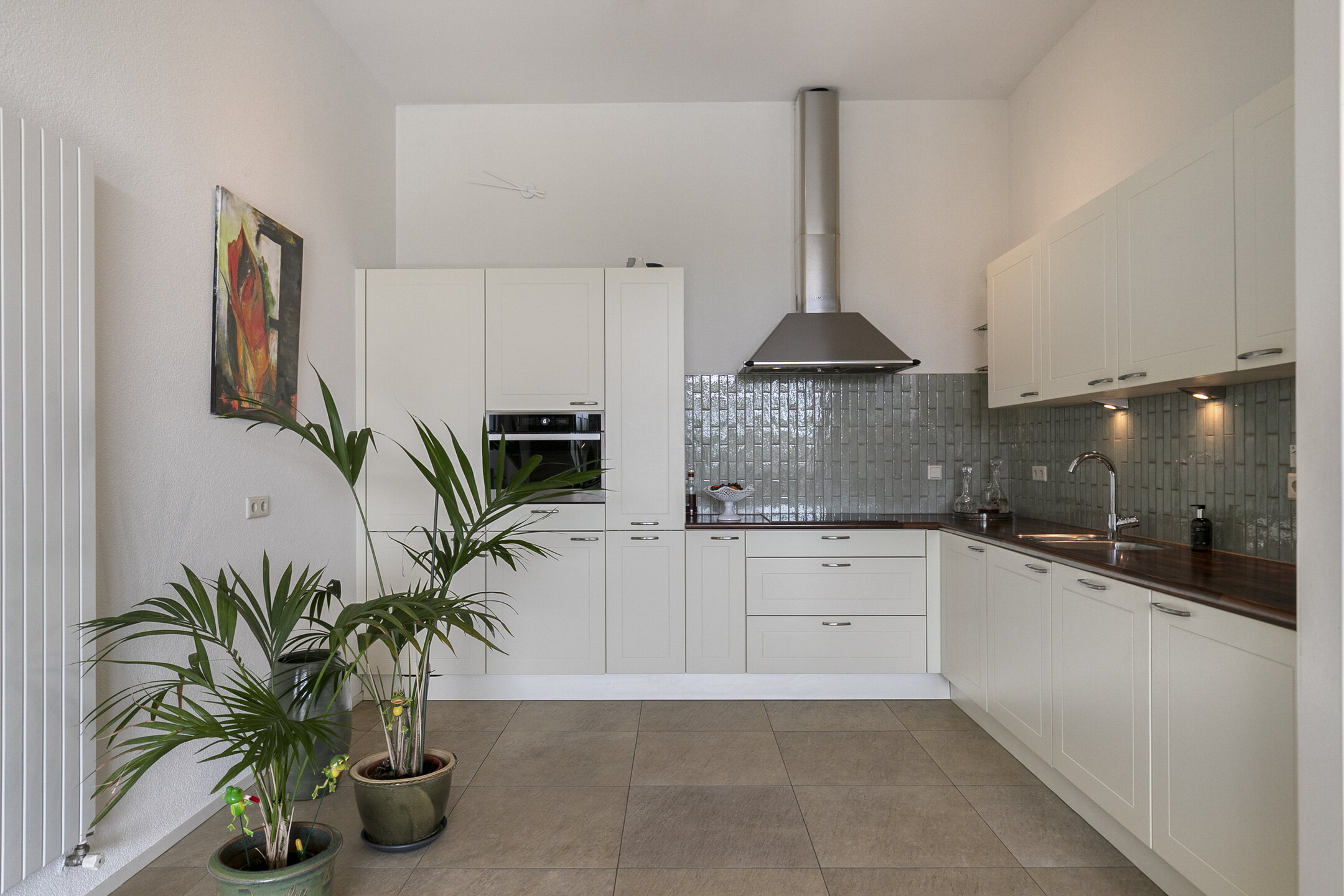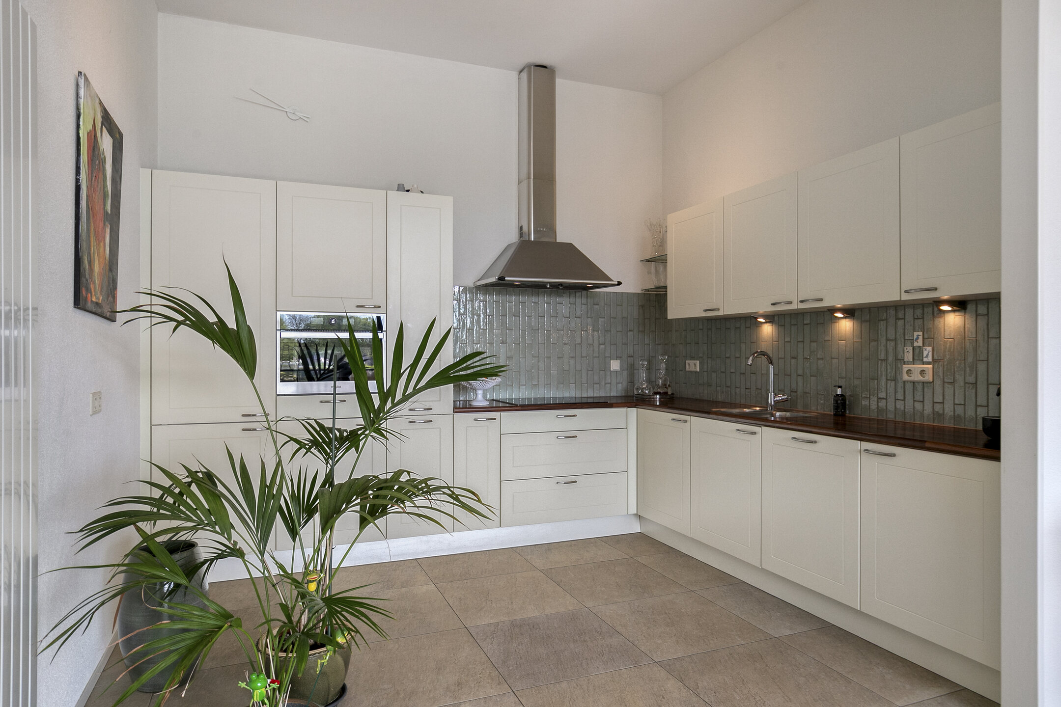 – de woonkamer is voorzien van een lichte tegelvloer en een spachtelputz wand- en plafondafwerking;