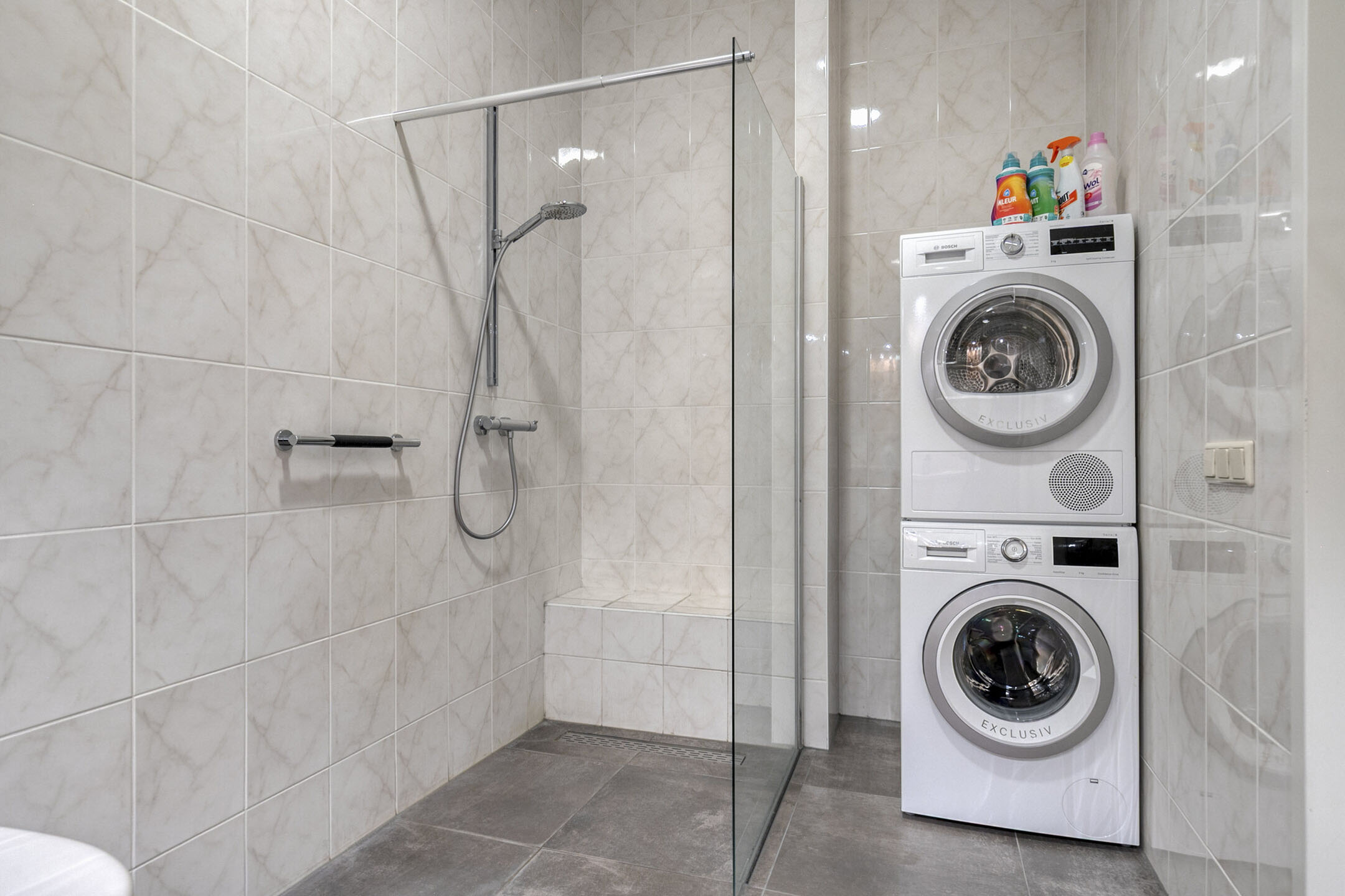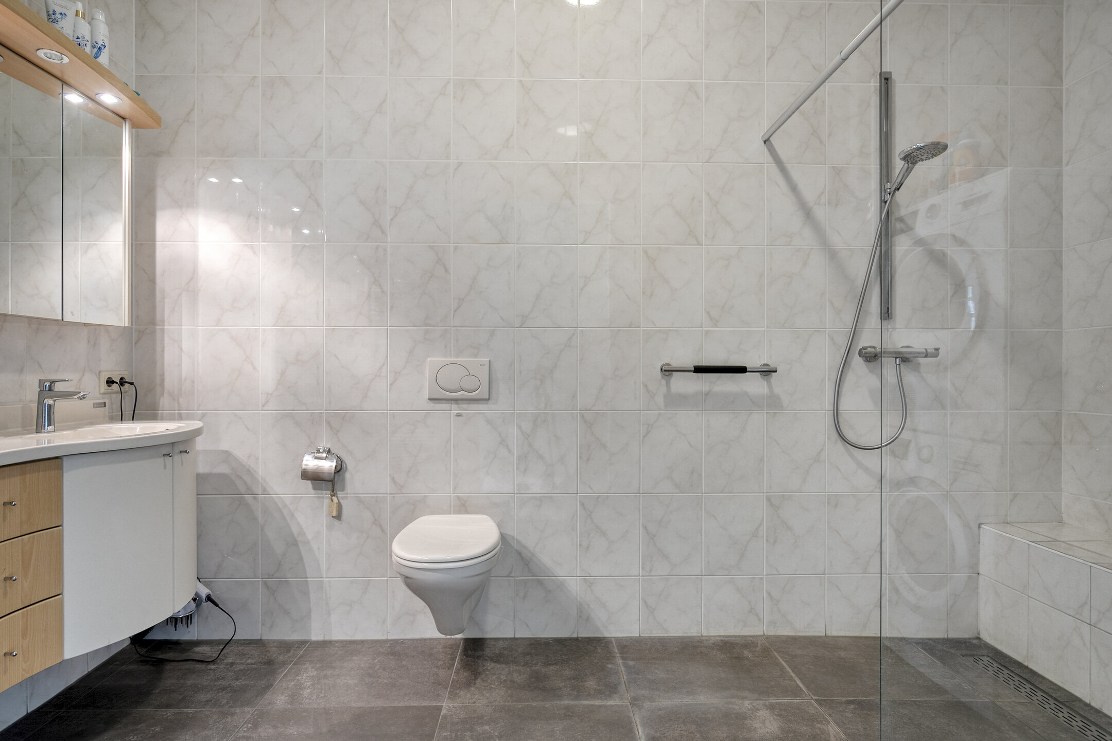 – de volledig betegelde badkamer is ingericht met een inloopdouche, tweede toilet en een dubbele wastafel met meubel. Tevens vindt u hier de aansluiting voor de wasapparatuur;