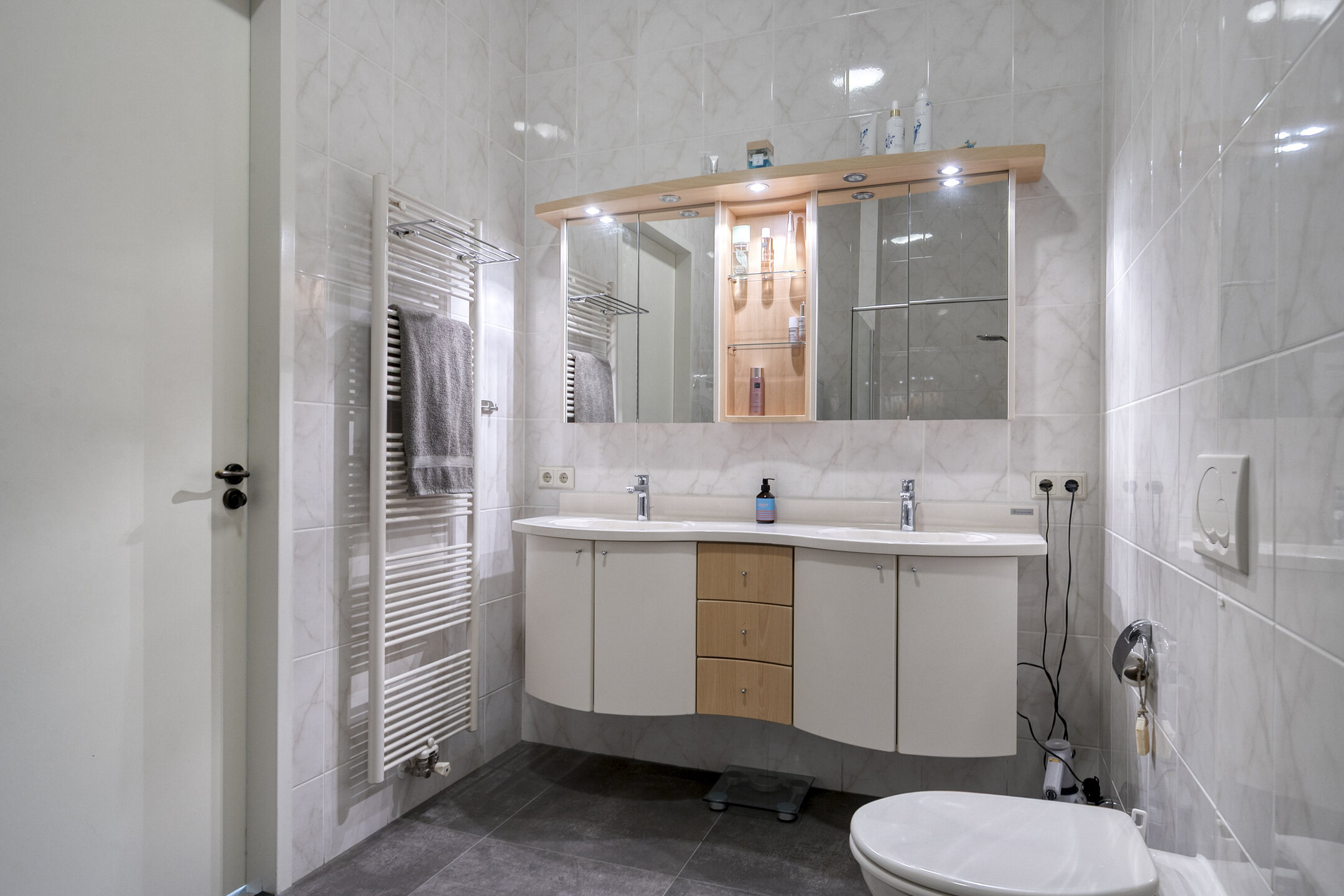 - Badkamervoorzieningen Toilet, dubbele wastafel, wastafelmeubel, inloopdouche, vloerverwarming