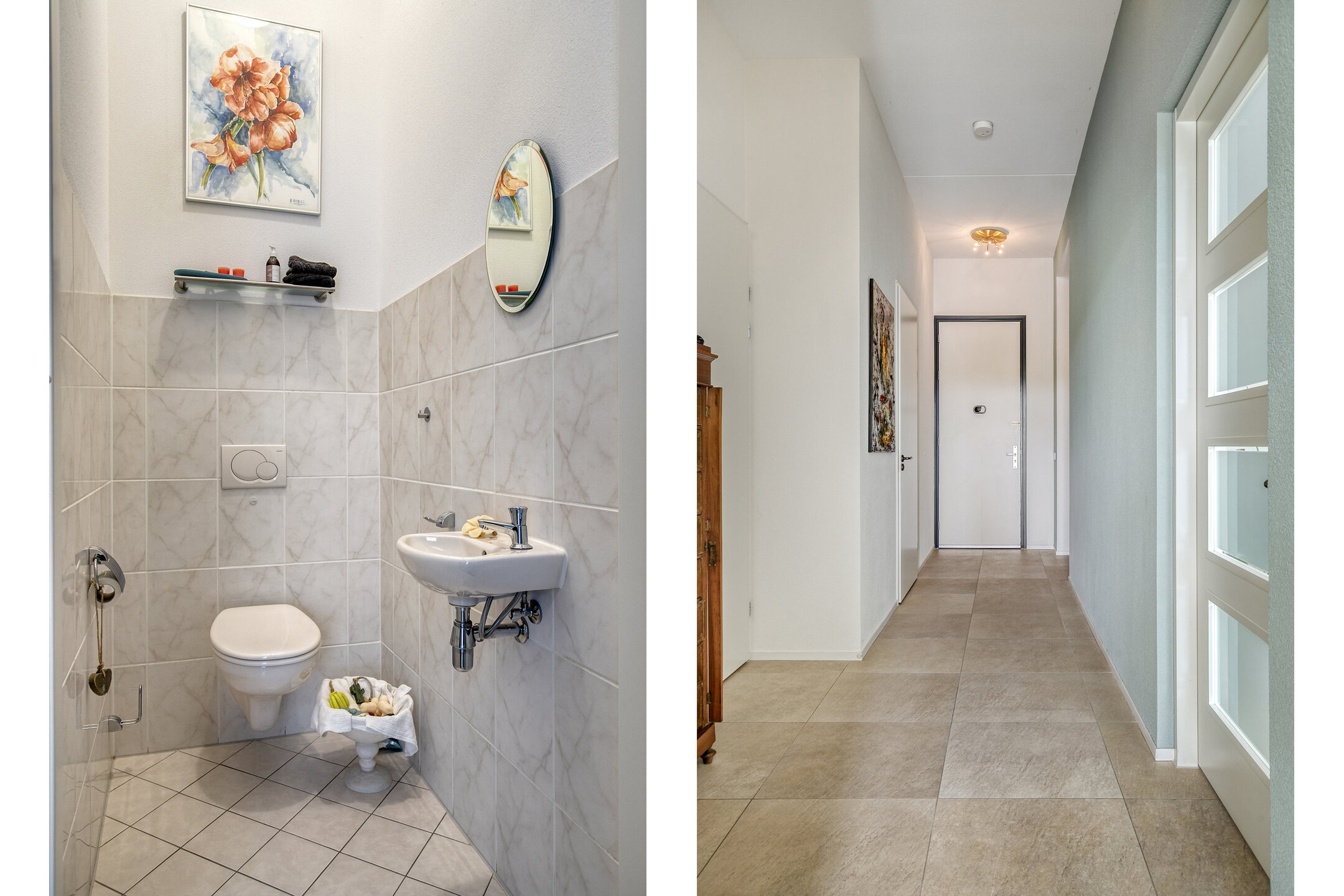– de separate toiletruimte deels is betegeld en is voorzien van een wandcloset en fonteintje;