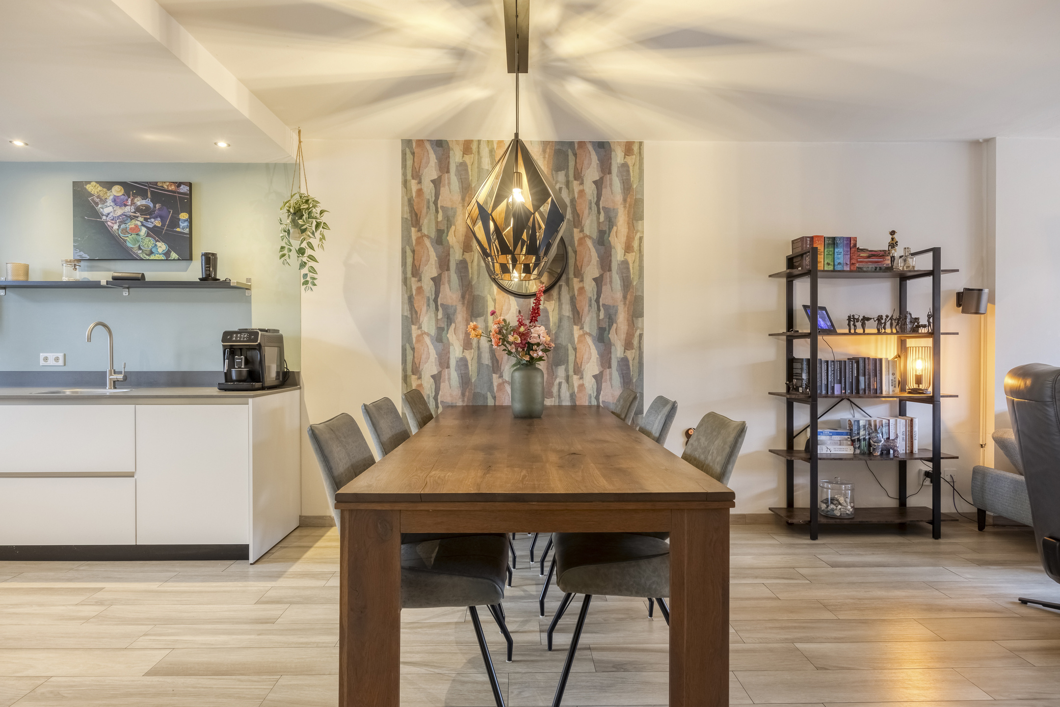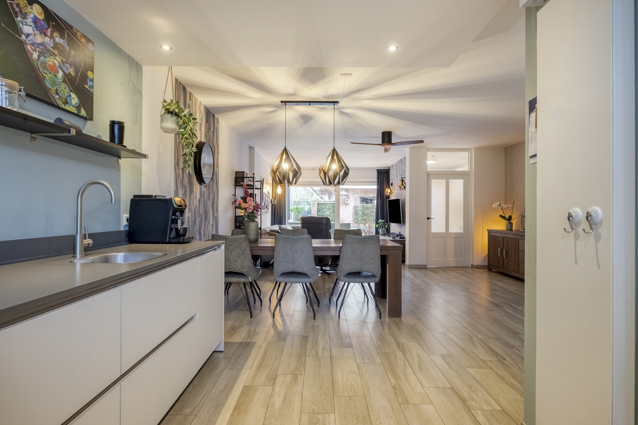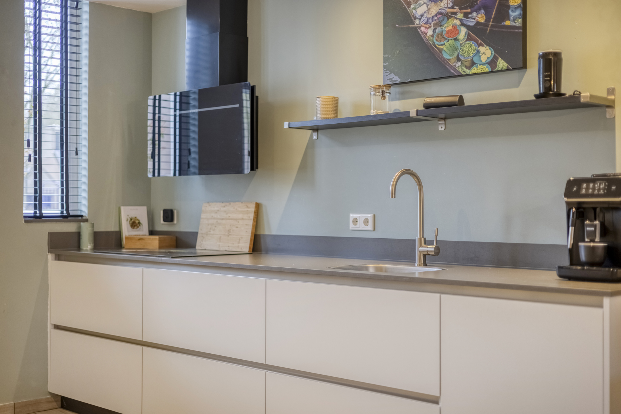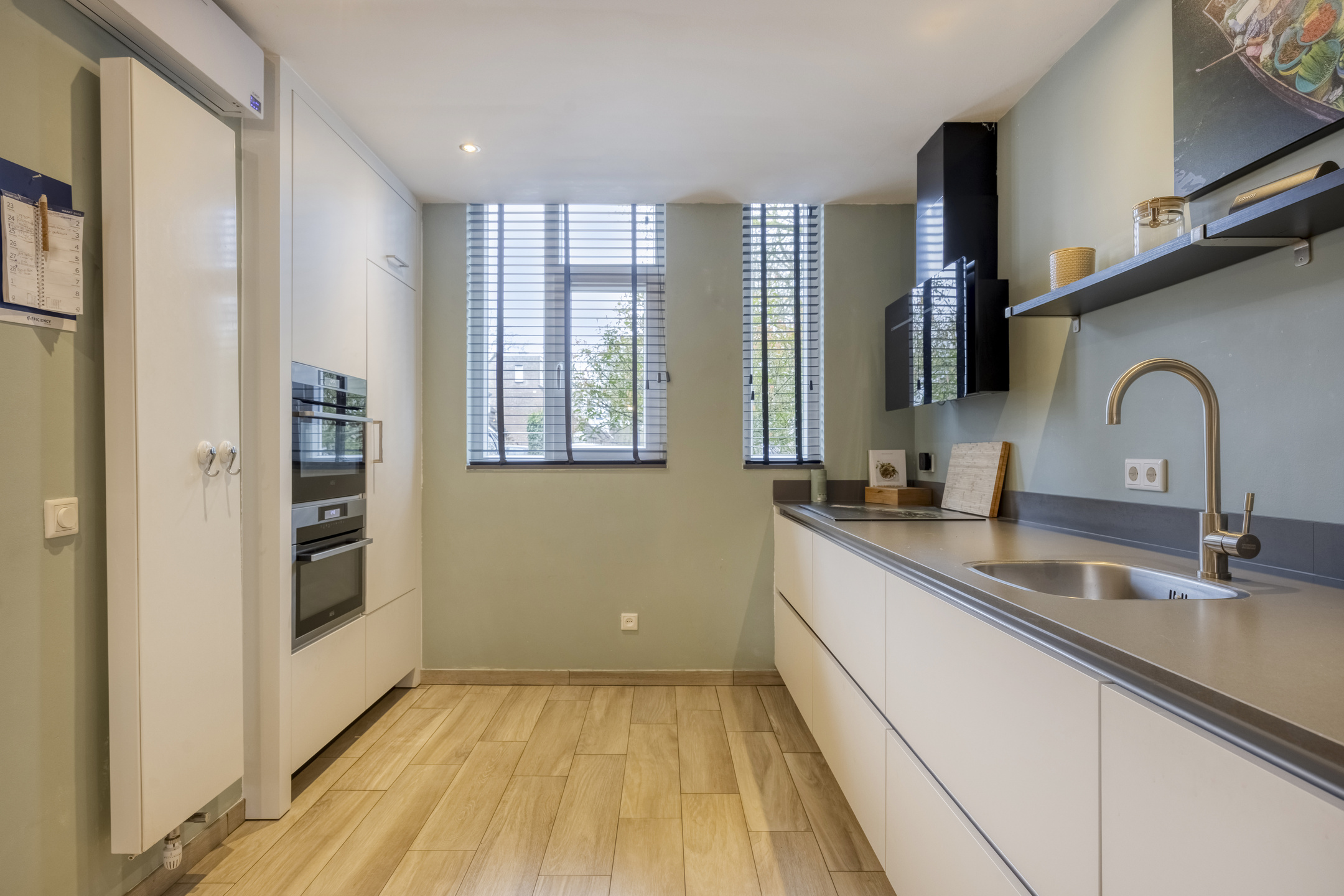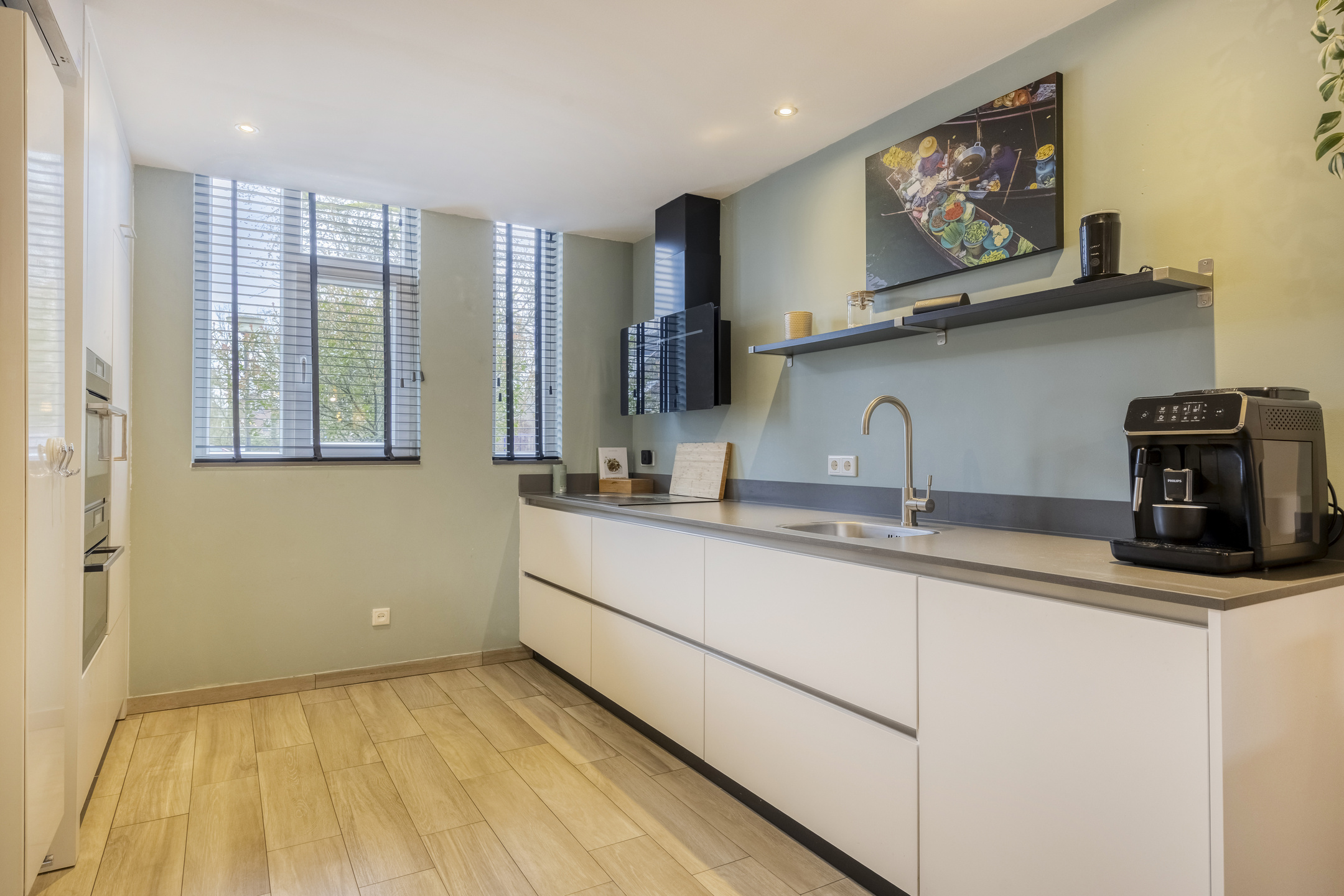– de moderne (open) keuken is strak uitgevoerd met greeploze kasten, een composiet werkblad, diverse inbouwapparatuur en veel werk- en bergruimte voor het hele gezin;