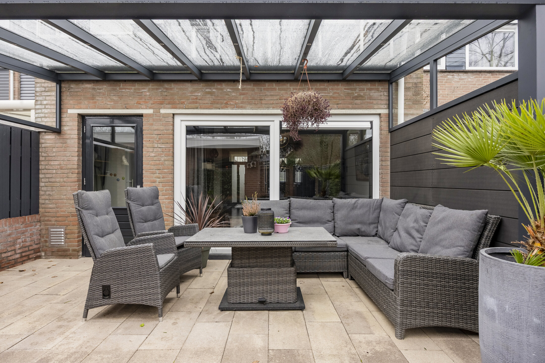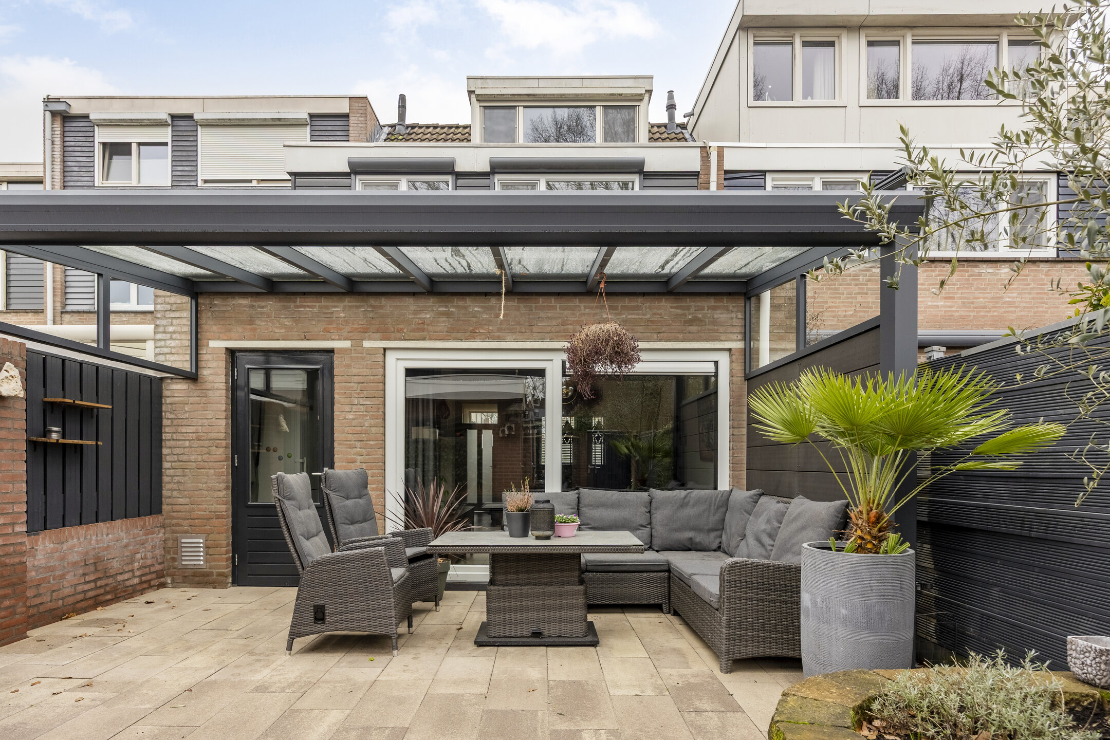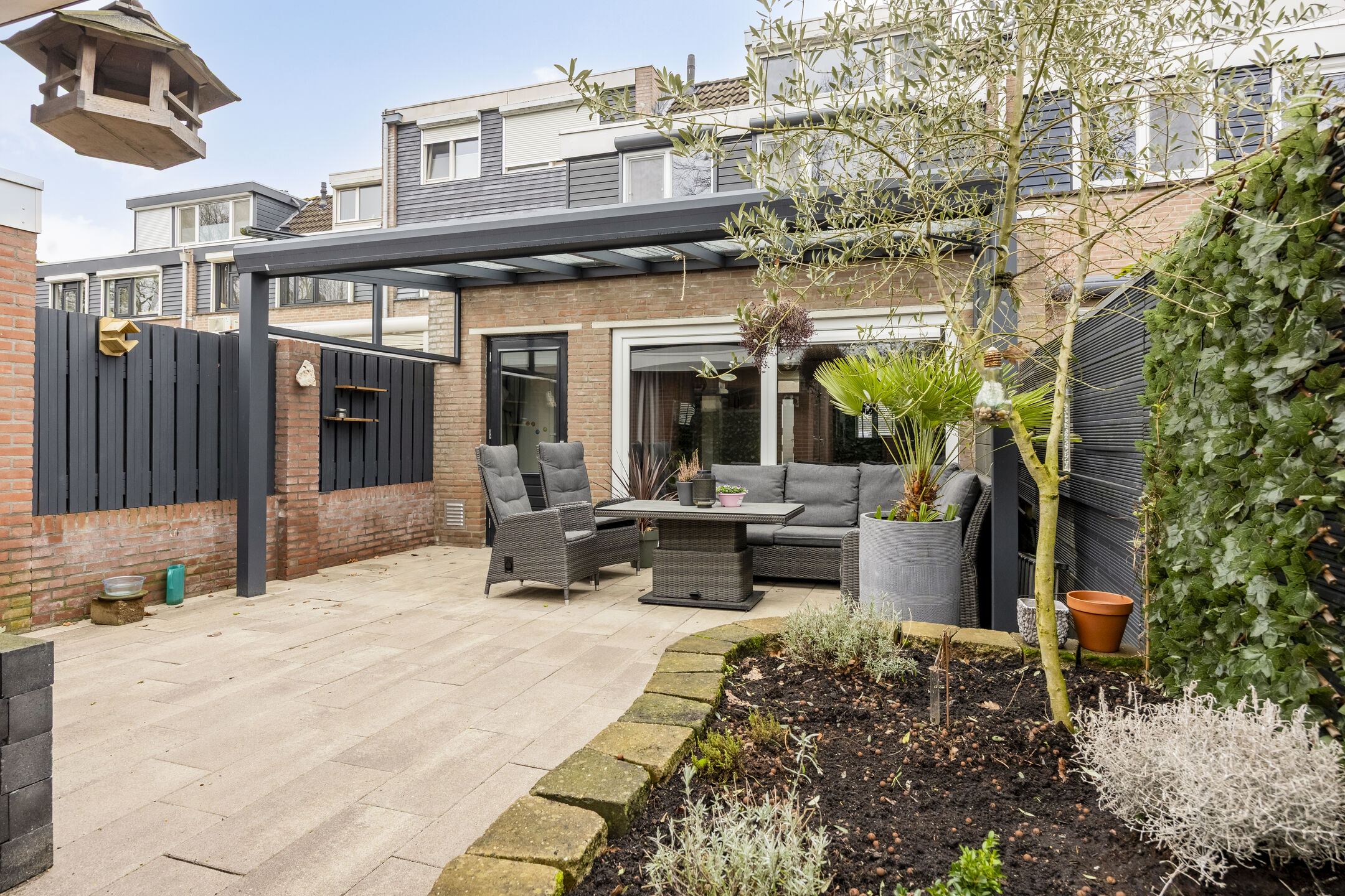 – de achtertuin is gunstig gelegen op het zuiden en is voorzien van een overkapping, bestrating, privacy biedende erfafscheidingen en een vrijstaande berging;