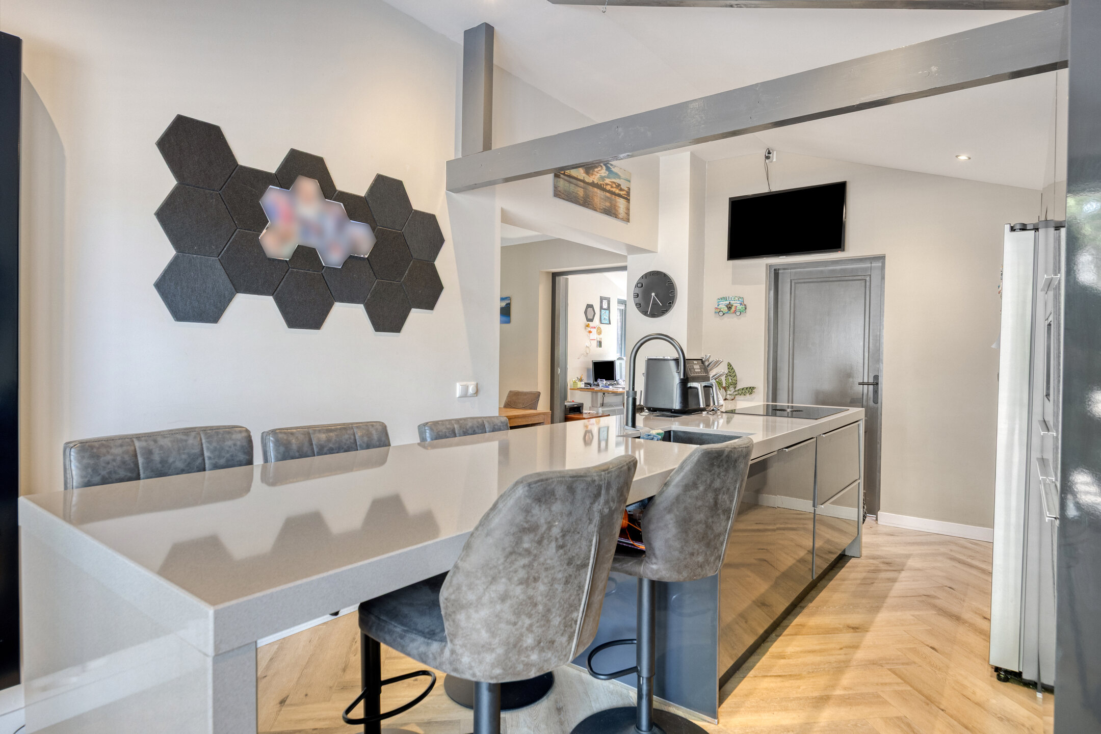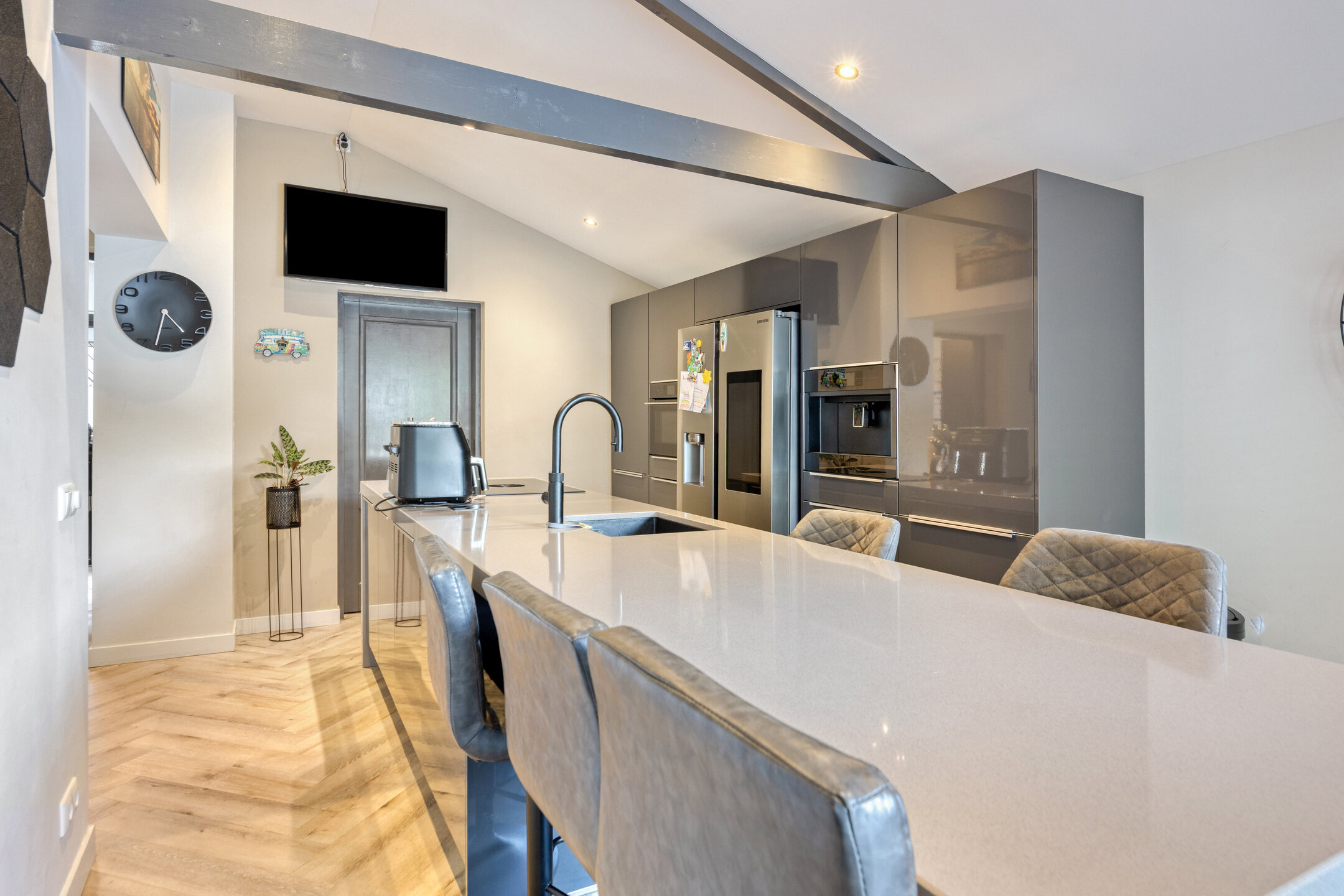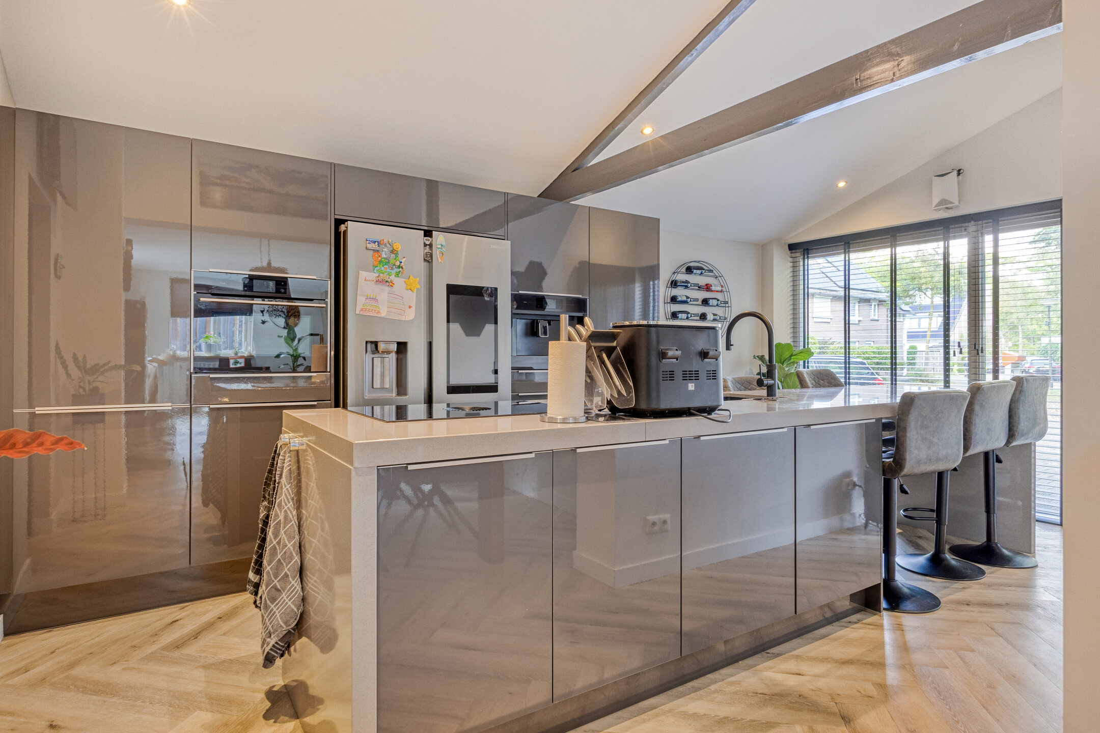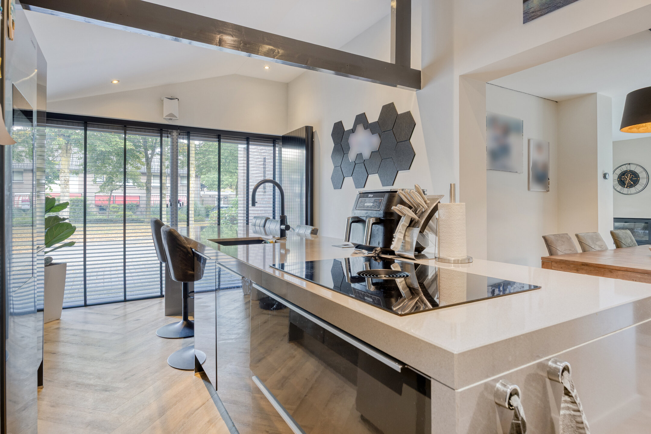 – de moderne keuken (2020) is ingericht met een kookeiland en kastenwand met veel bergruimte en complete inbouwapparatuur, waaronder een inductie (BORA) kookplaat, combi-oven magnetron (ATAG), koffiemachine (ATAG), American Family Hub internet-connected koelkast, vaatwasser (AEG) en een Quooker;