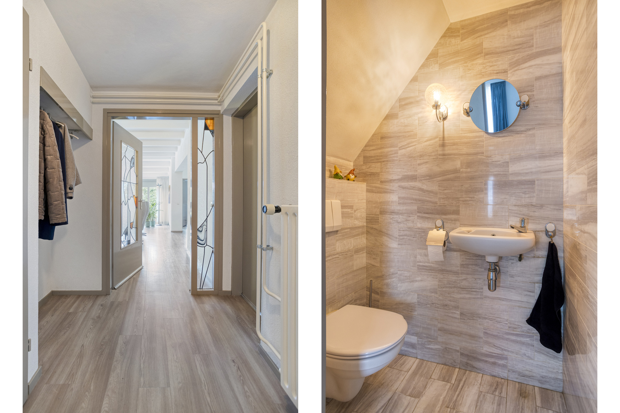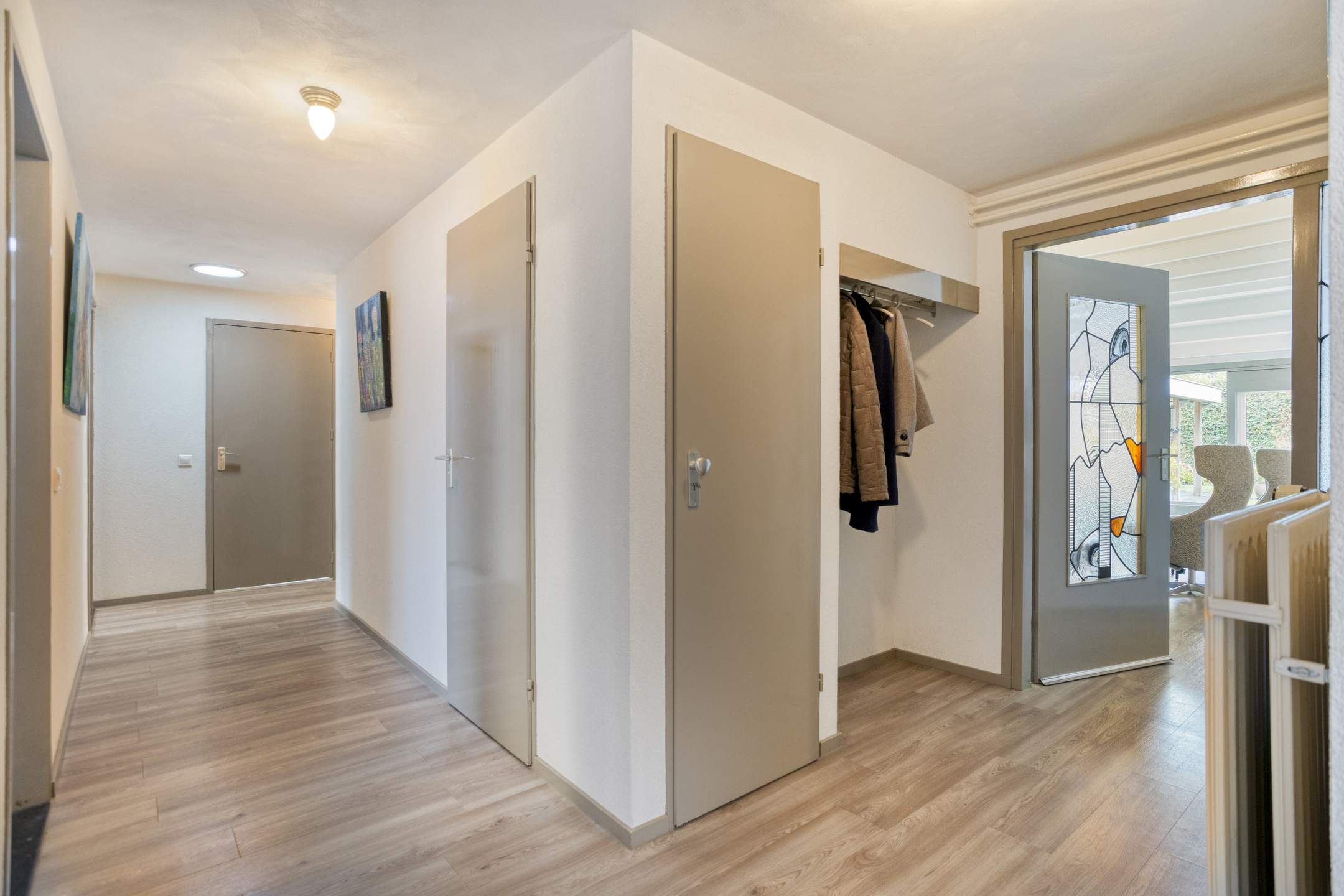 – de ruime hal direct prettig binnenkomt, dankzij het grote raamoppervlak veel licht ontvangt en toegang biedt tot de woonkamer, keuken, toiletruimte, meterkast en de slaapvleugel op de begane grond;