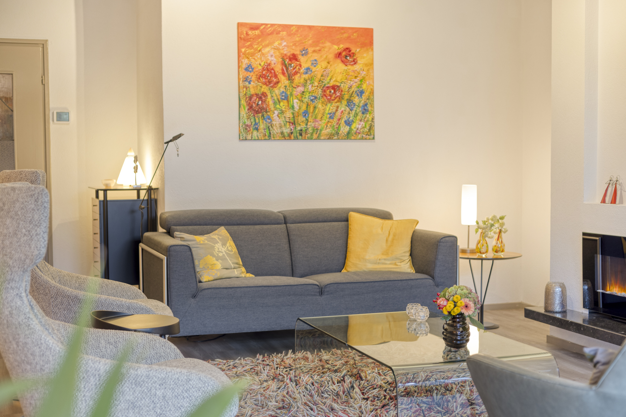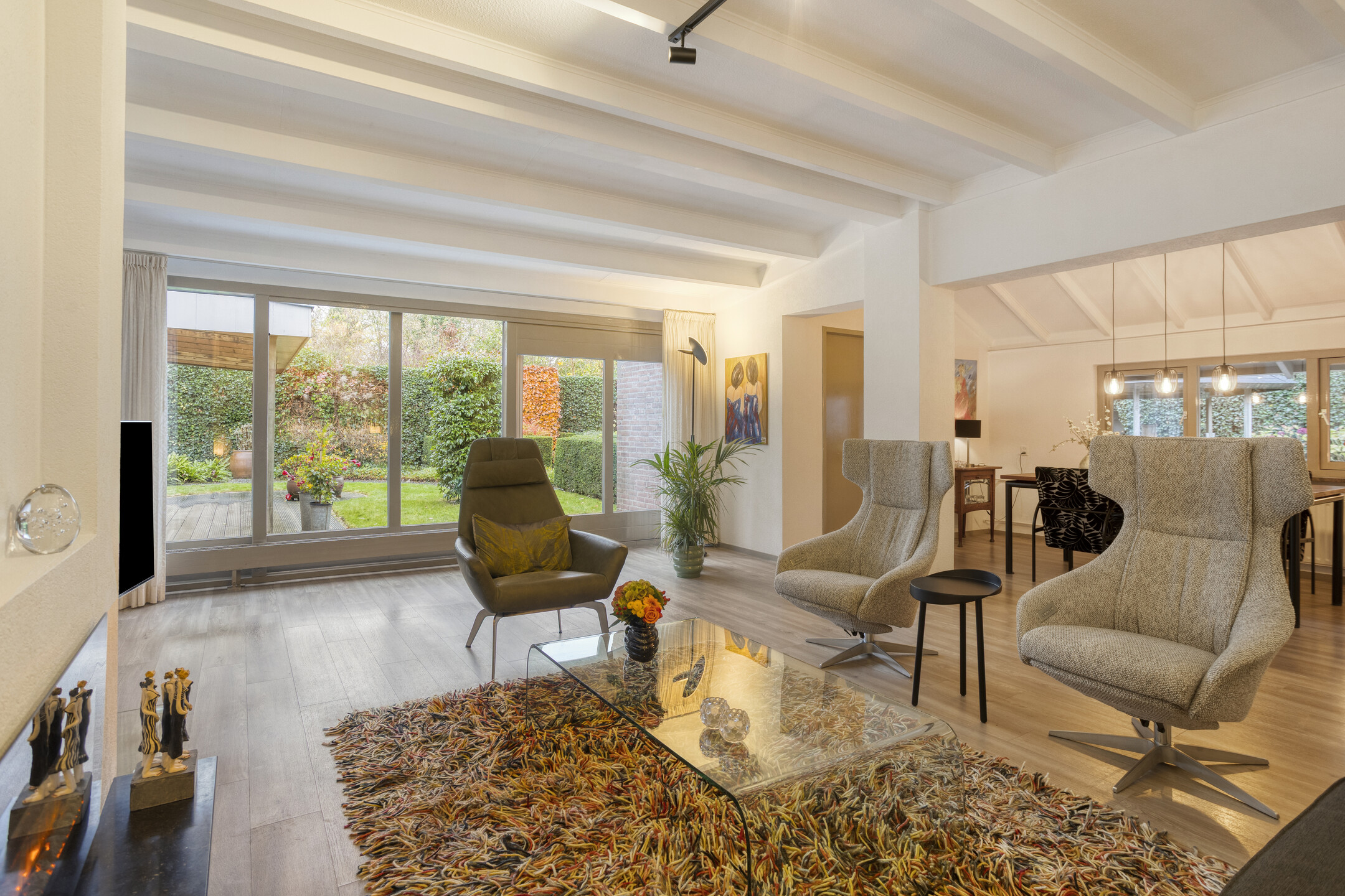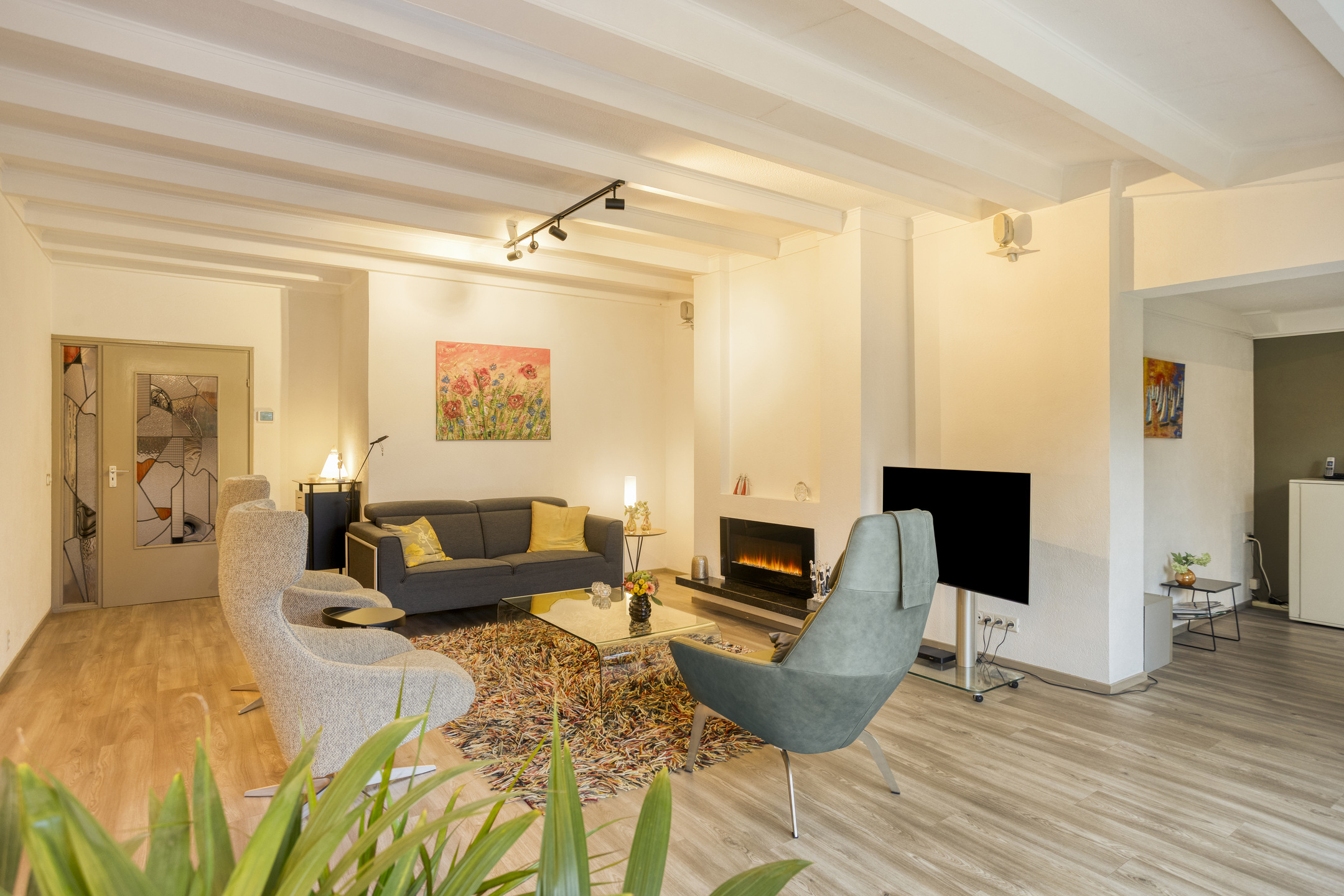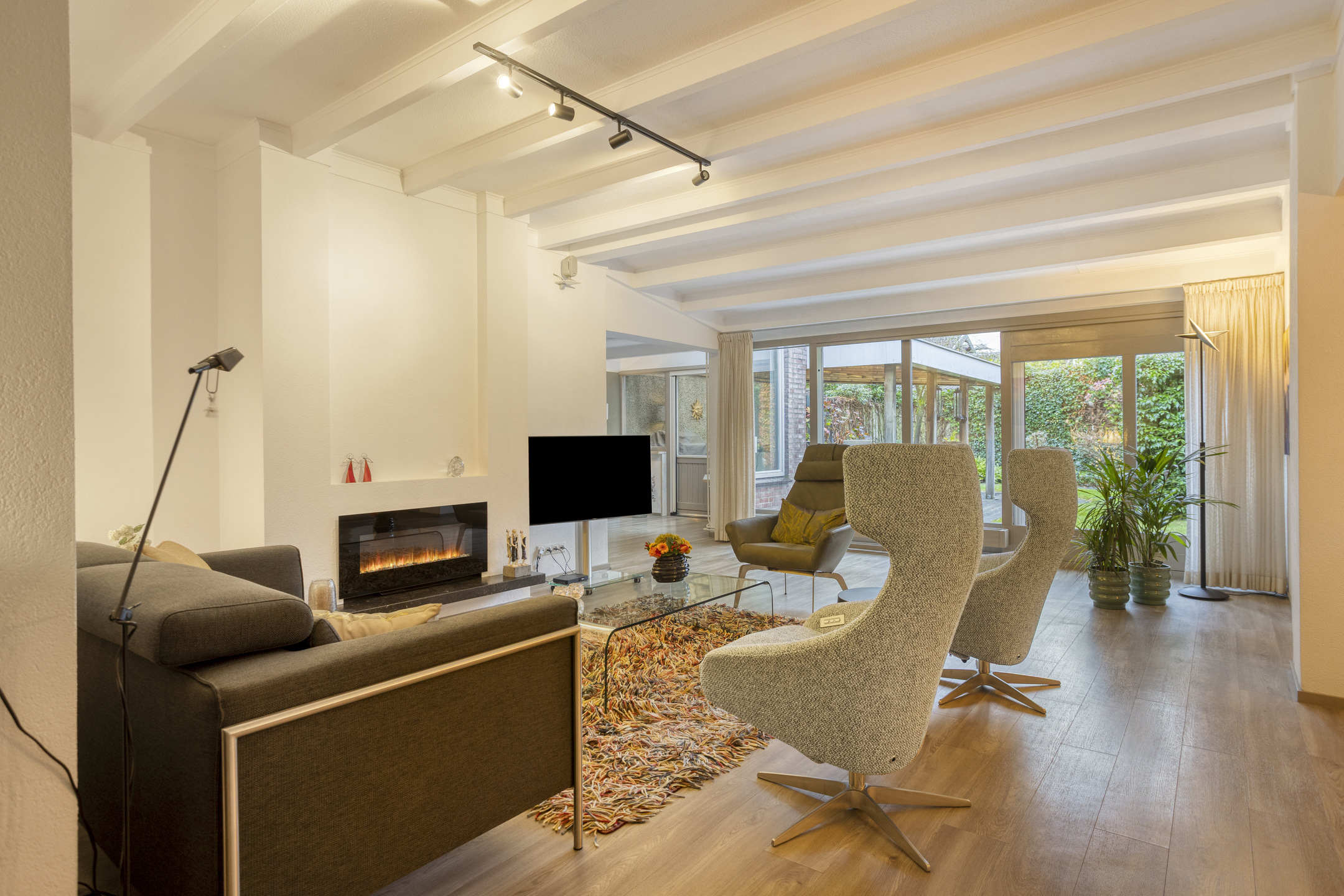 – de woonkamer opvallend groot is opgezet, voorzien is van een pvc-vloer, brede raampartijen en een sfeervolle haard, waardoor je meerdere zit- en leefhoeken mooi kwijt kunt en een fijne verbinding hebt met de tuin;