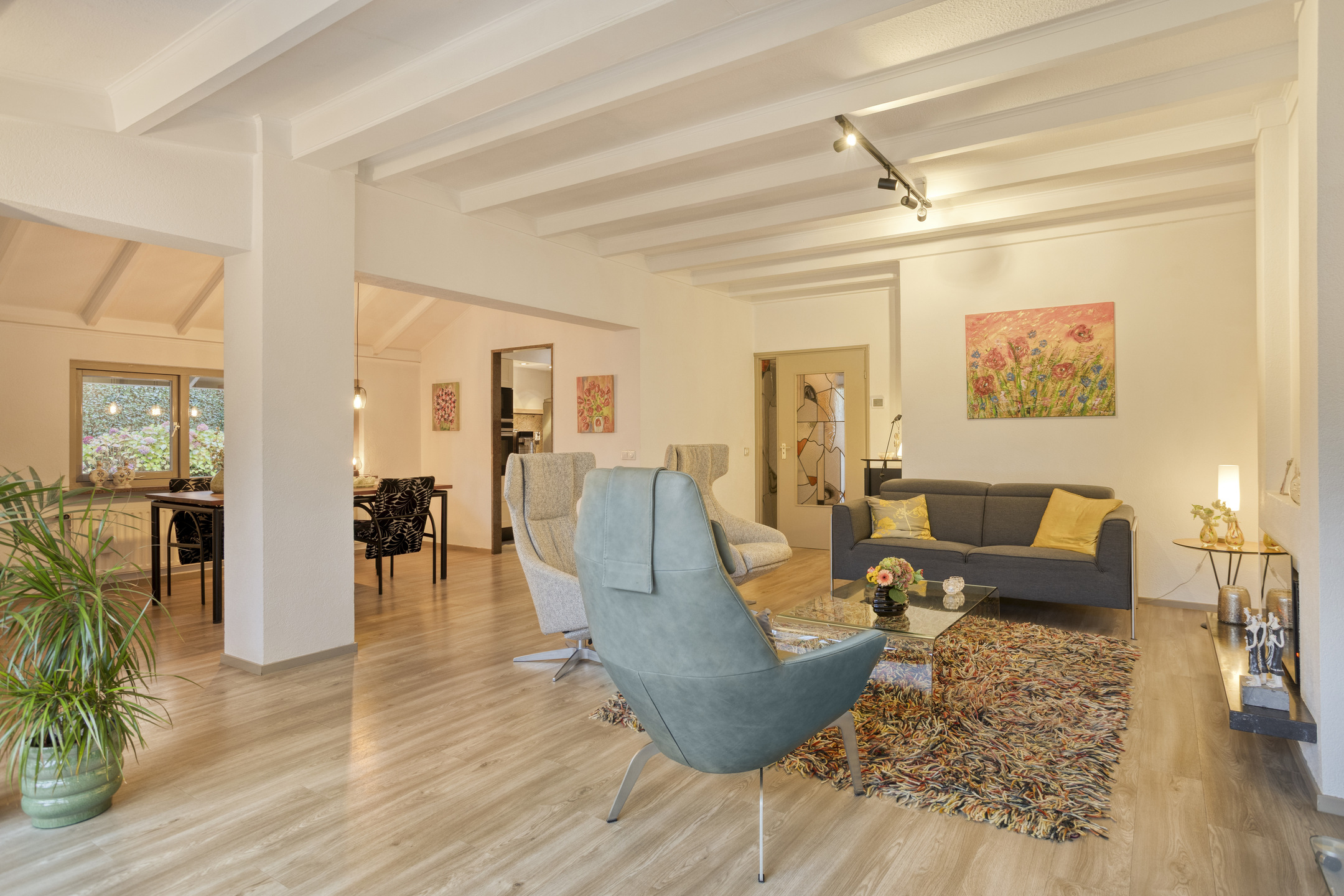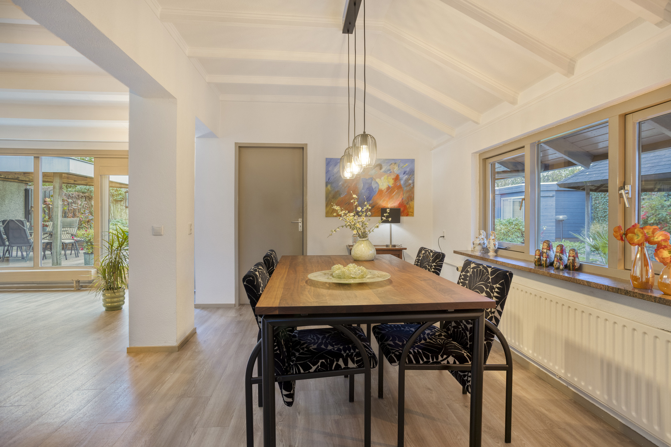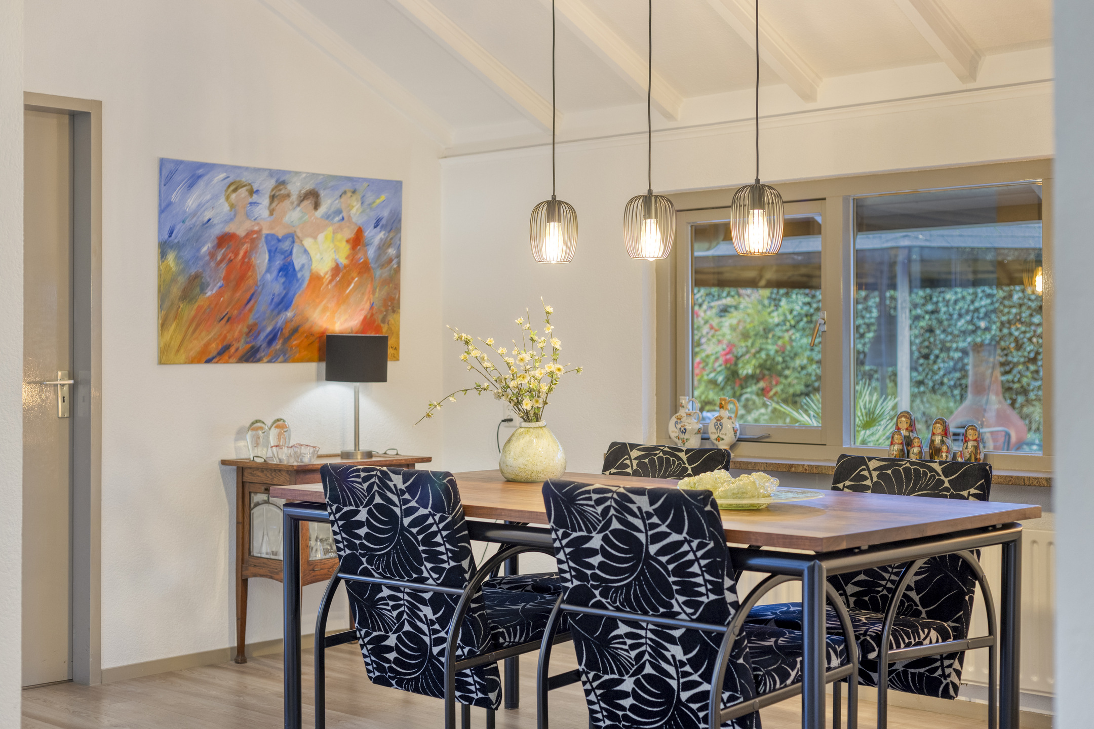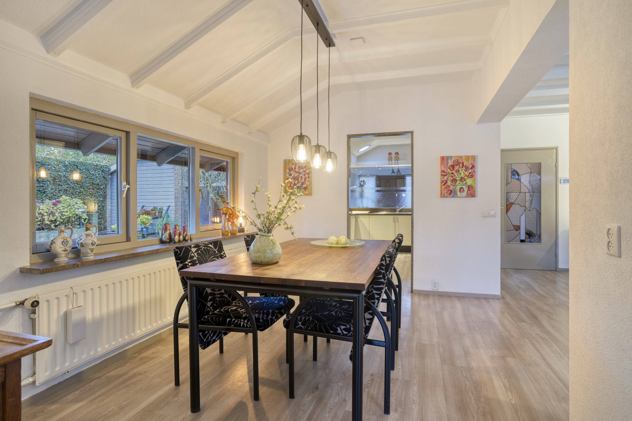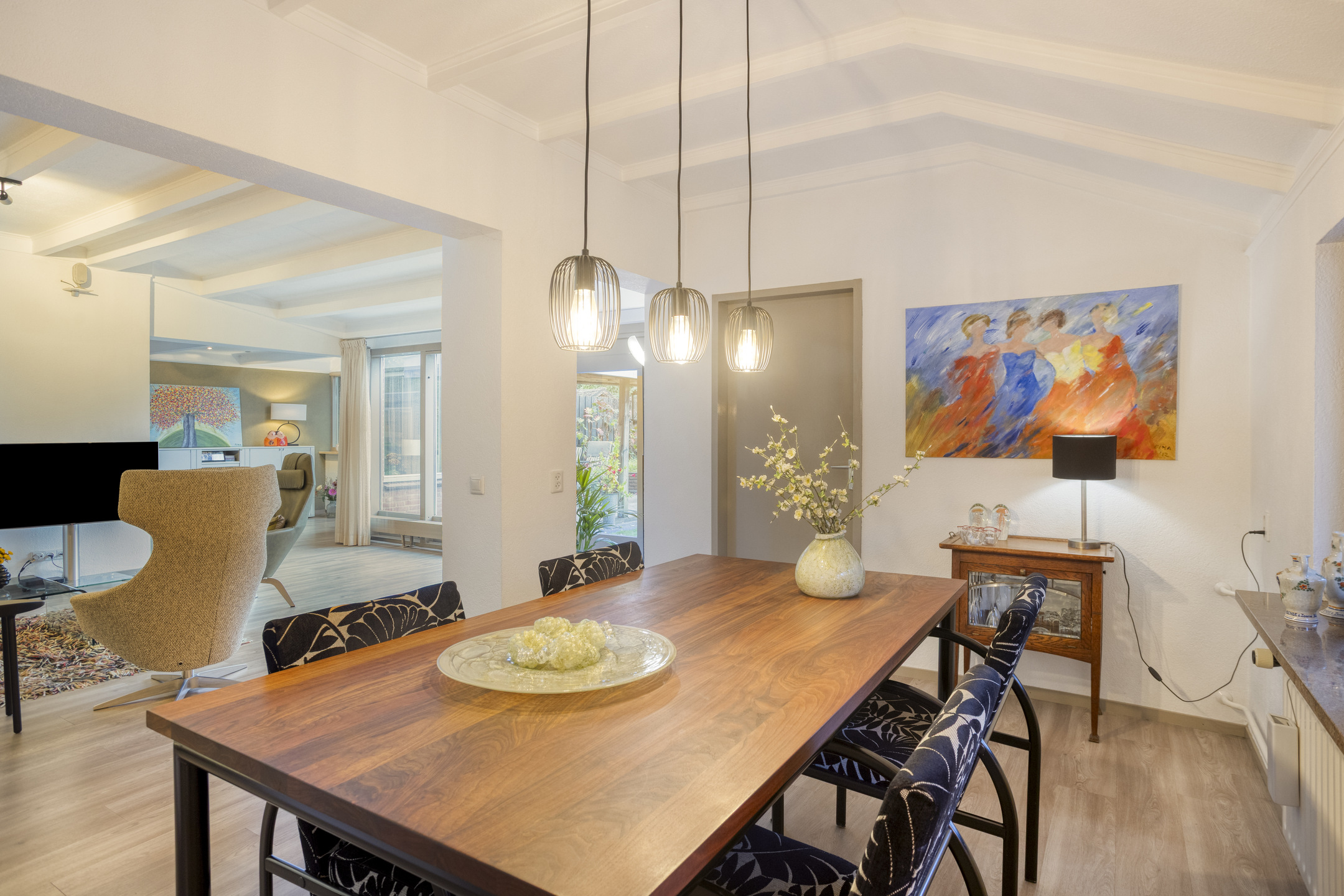 – de eetkamer een centraal punt in huis vormt, met ruimte voor een royale eettafel, een hoog plafond met zichtbare balken en een gezellige inkijk naar de achtertuin, ideaal voor lange avonden tafelen met familie en vrienden;