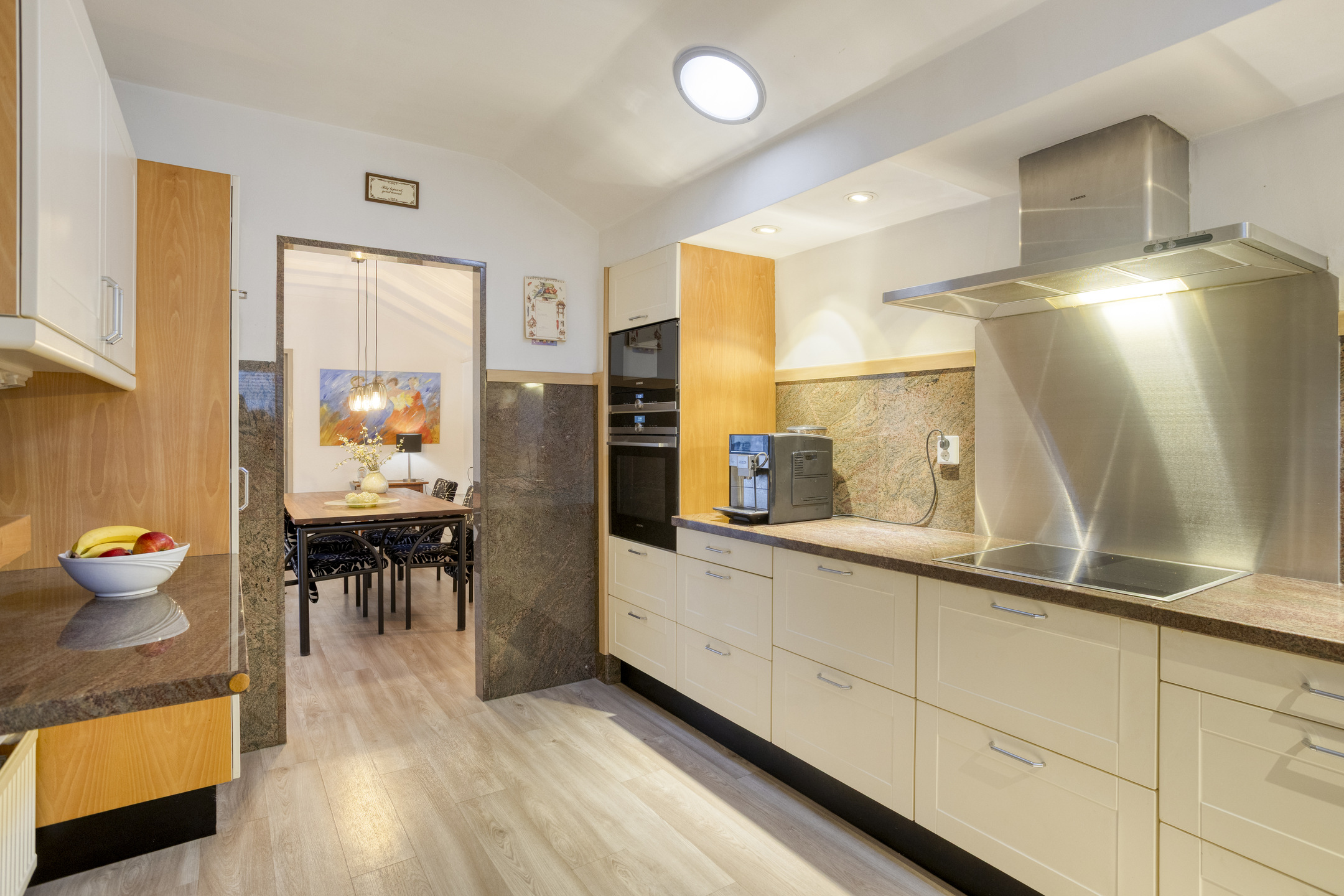 – de keuken royaal is ingericht met veel kast- en werkruimte, een natuurstenen werkblad en inbouwapparatuur zoals een inductiekookplaat, afzuigkap, koelkast en vaatwasser, zodat je hier comfortabel en praktisch kunt koken;