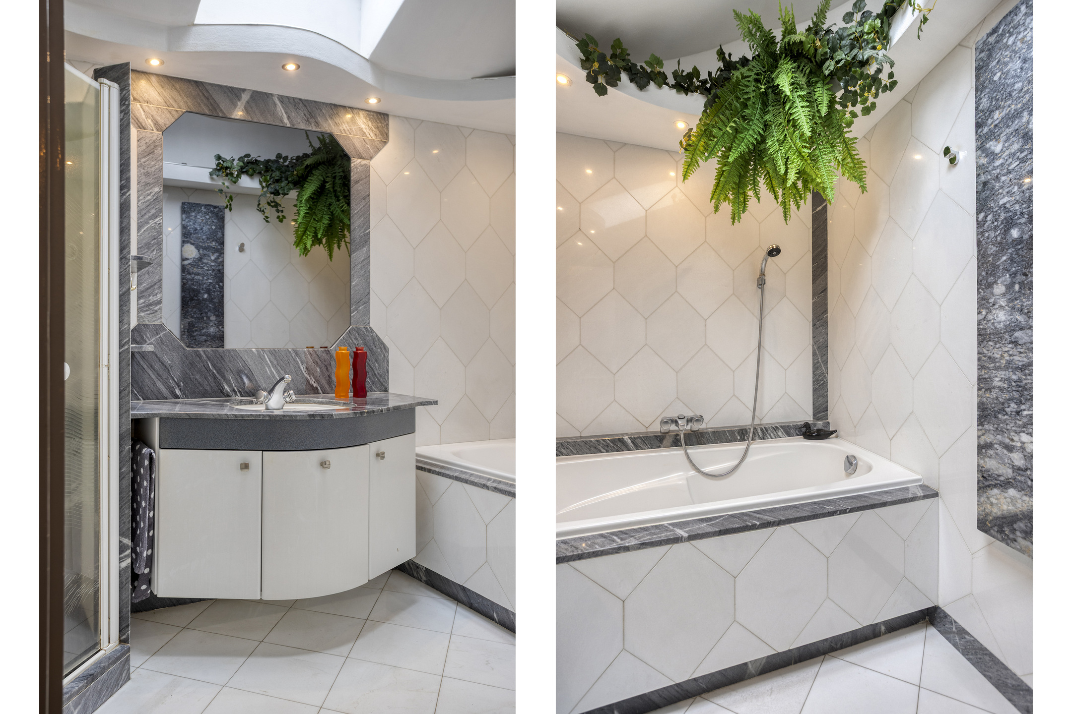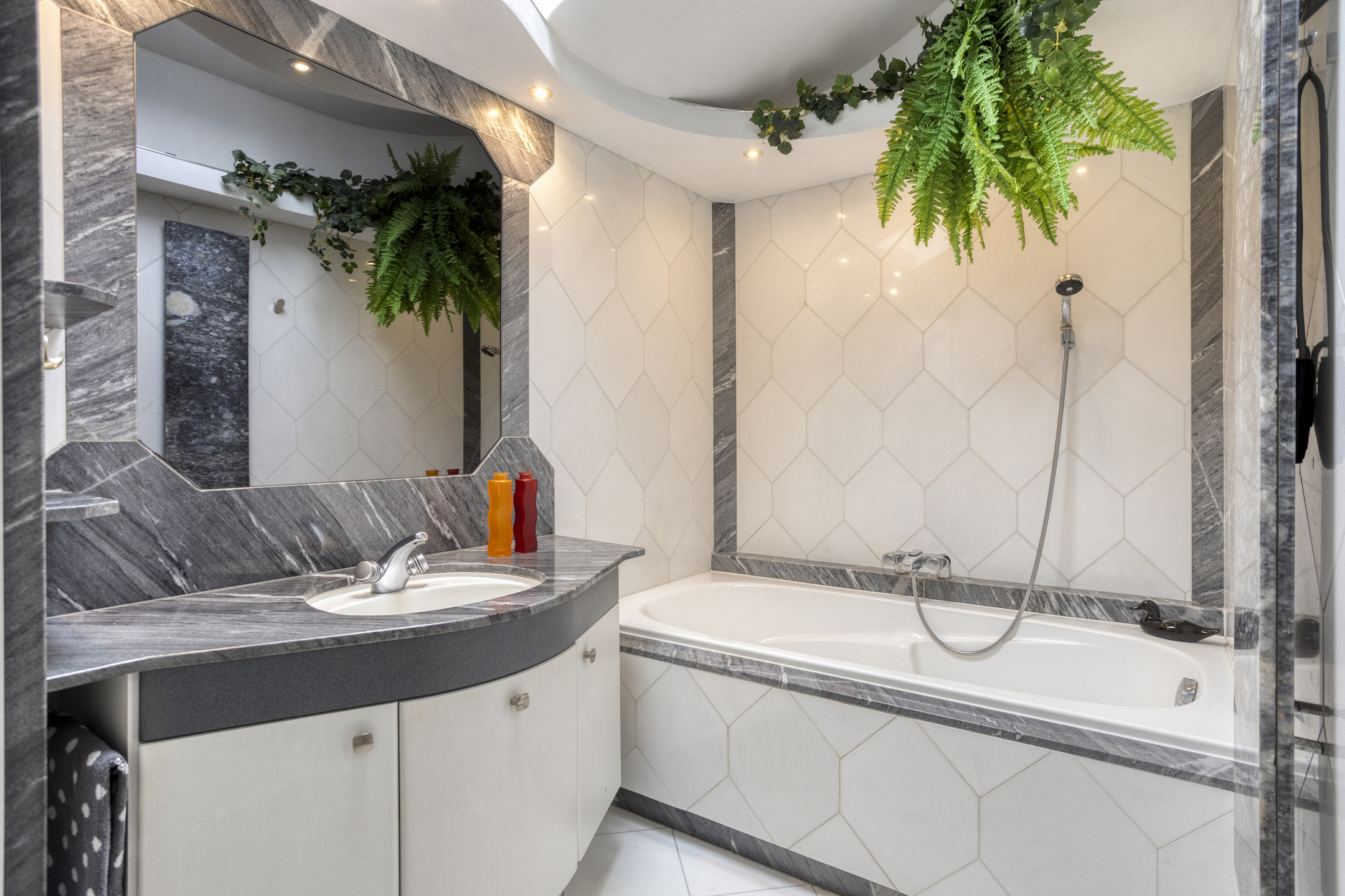 – de badkamer is ingericht met een bubbelbad, douche, wastafelmeubel, spiegelwand met verlichting en een lichte, tijdloze tegelafwerking;
