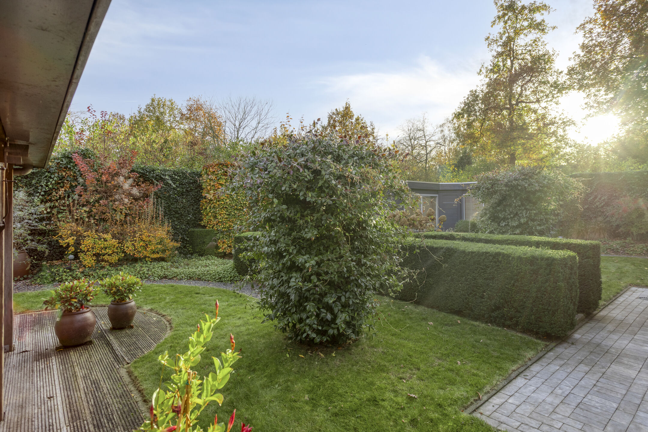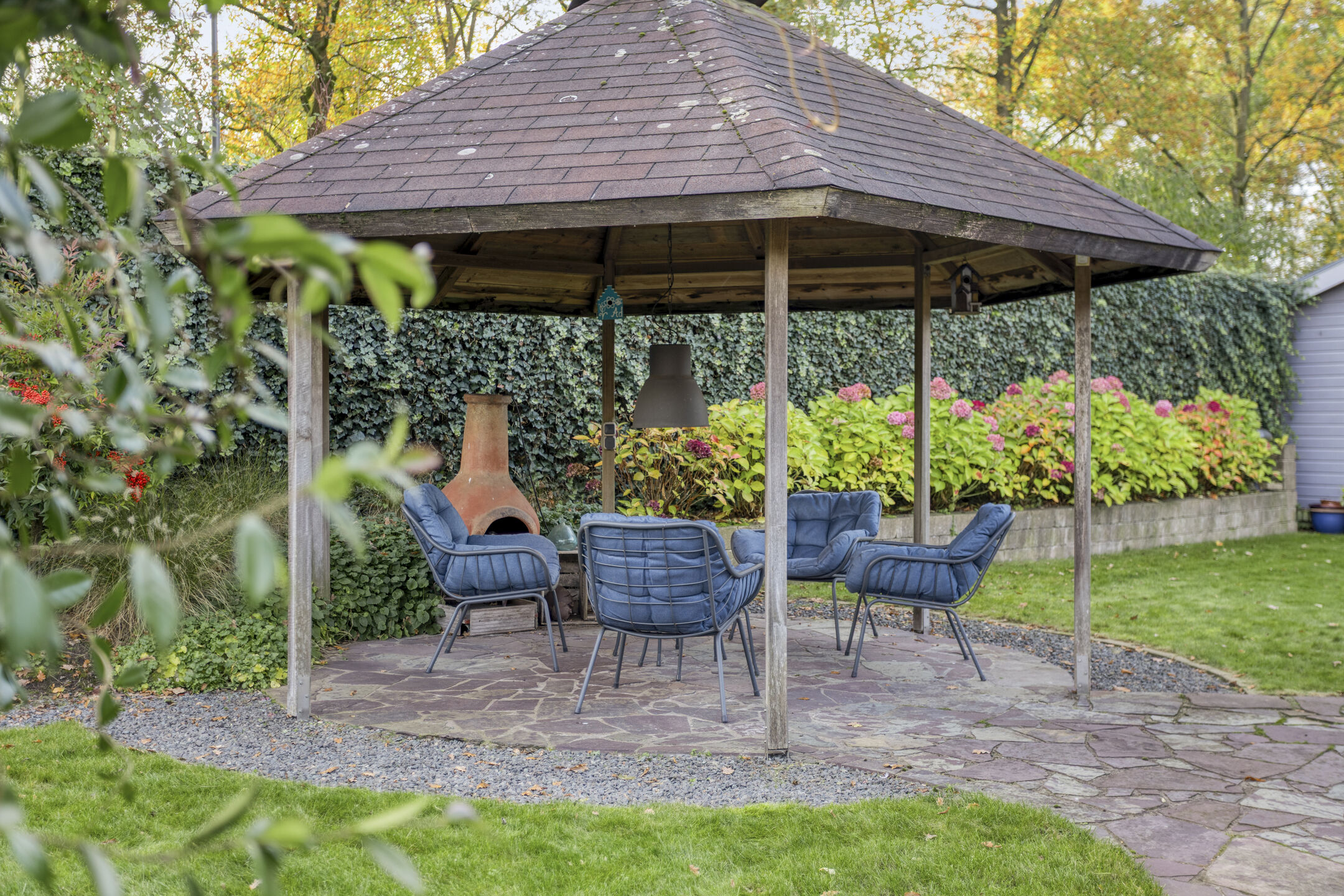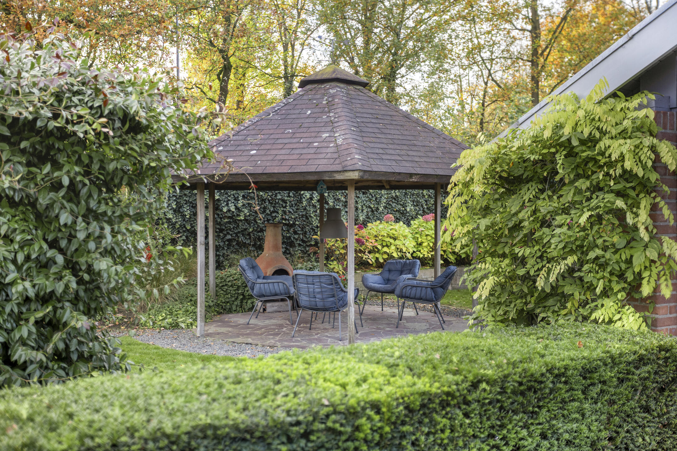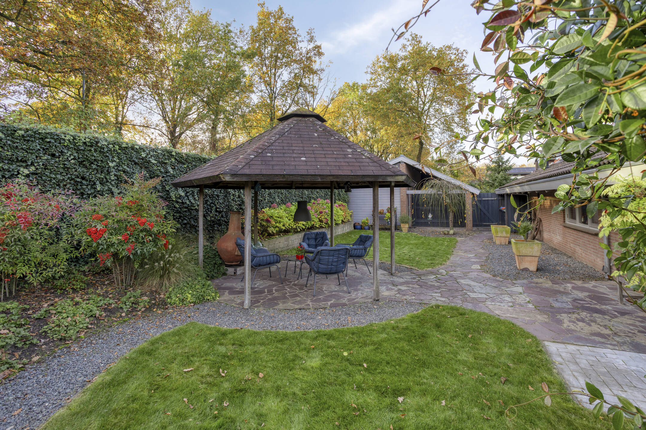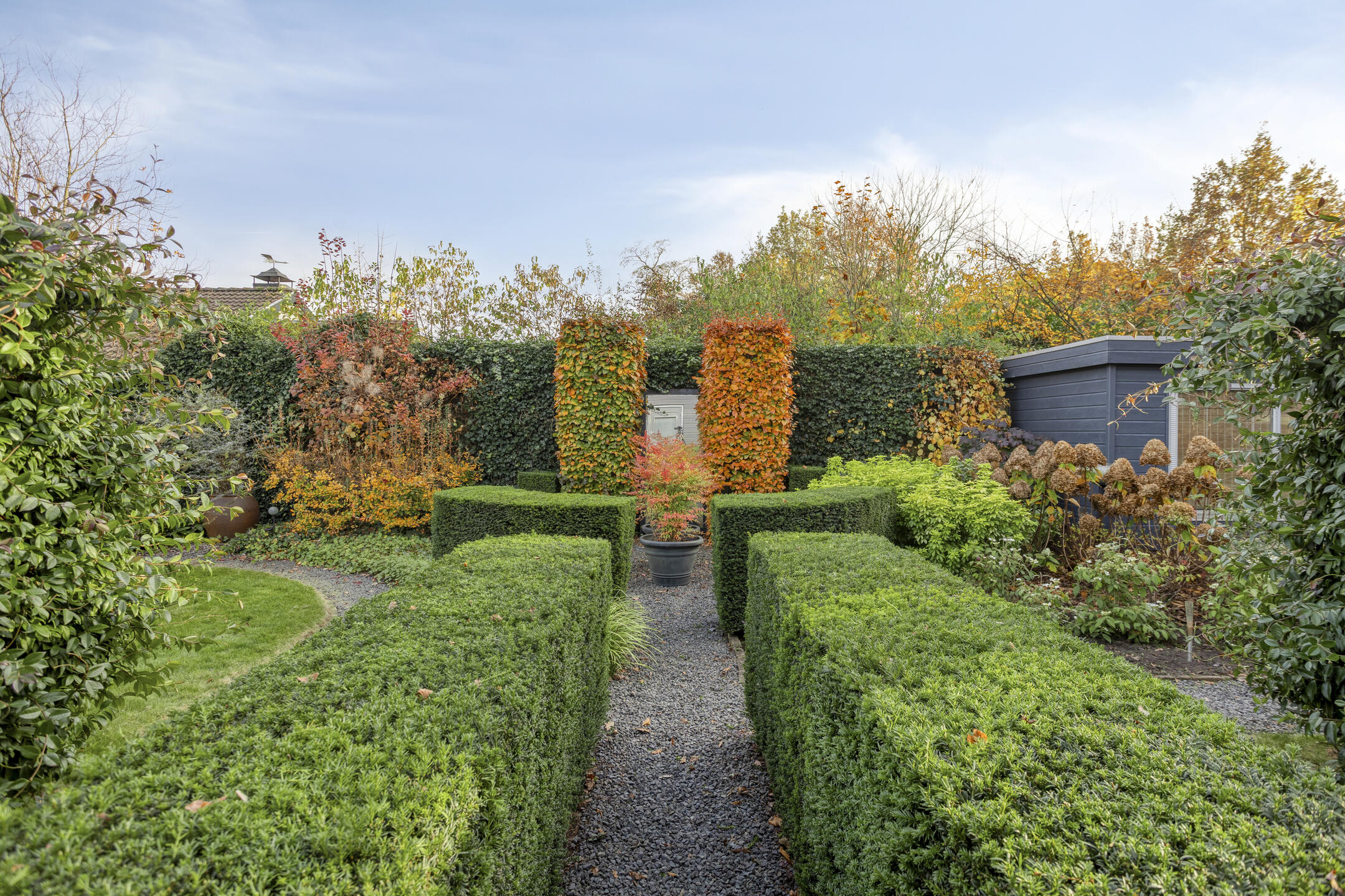 – de prachtig aangelegde tuin op het zuidoosten veel zonuren heeft, is ingericht met meerdere zithoeken, een groot overdekt terras, een houten prieel, slingerpaden, strak gesnoeide hagen, volwassen beplanting en volop privacy;