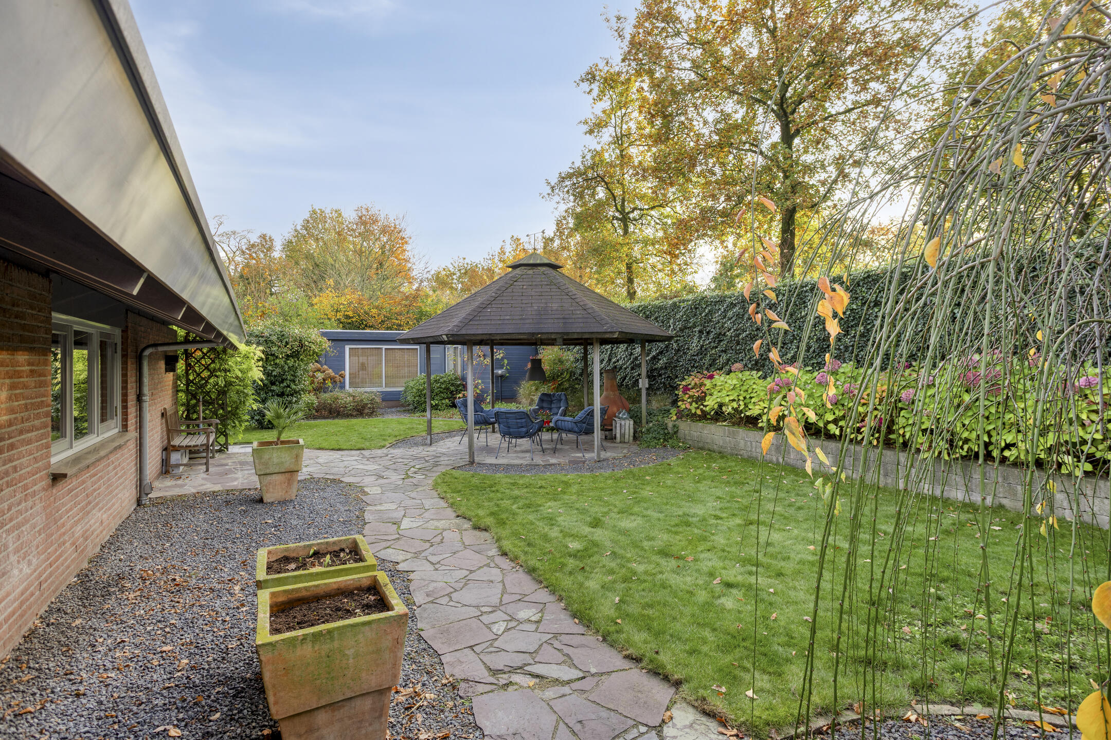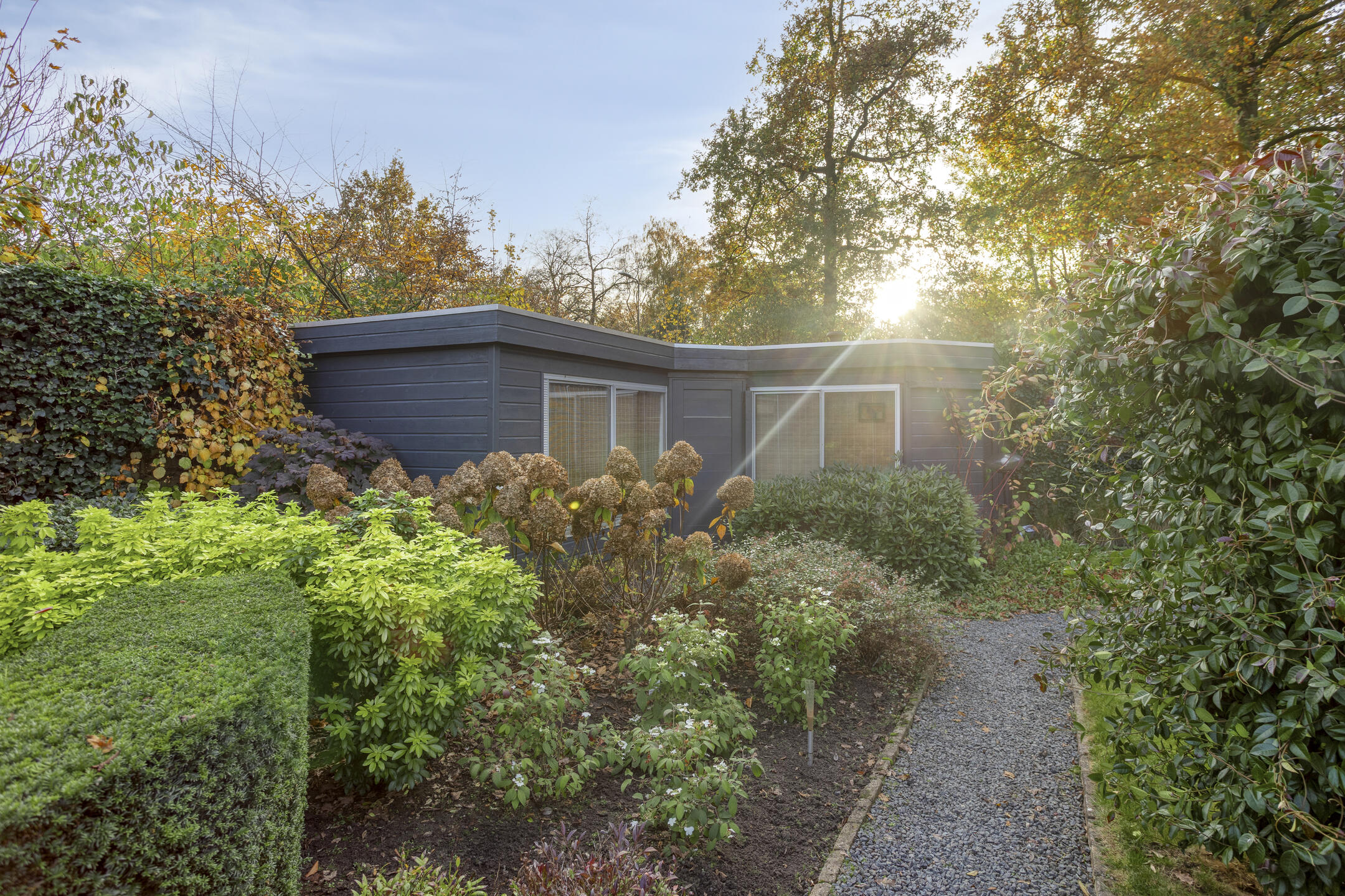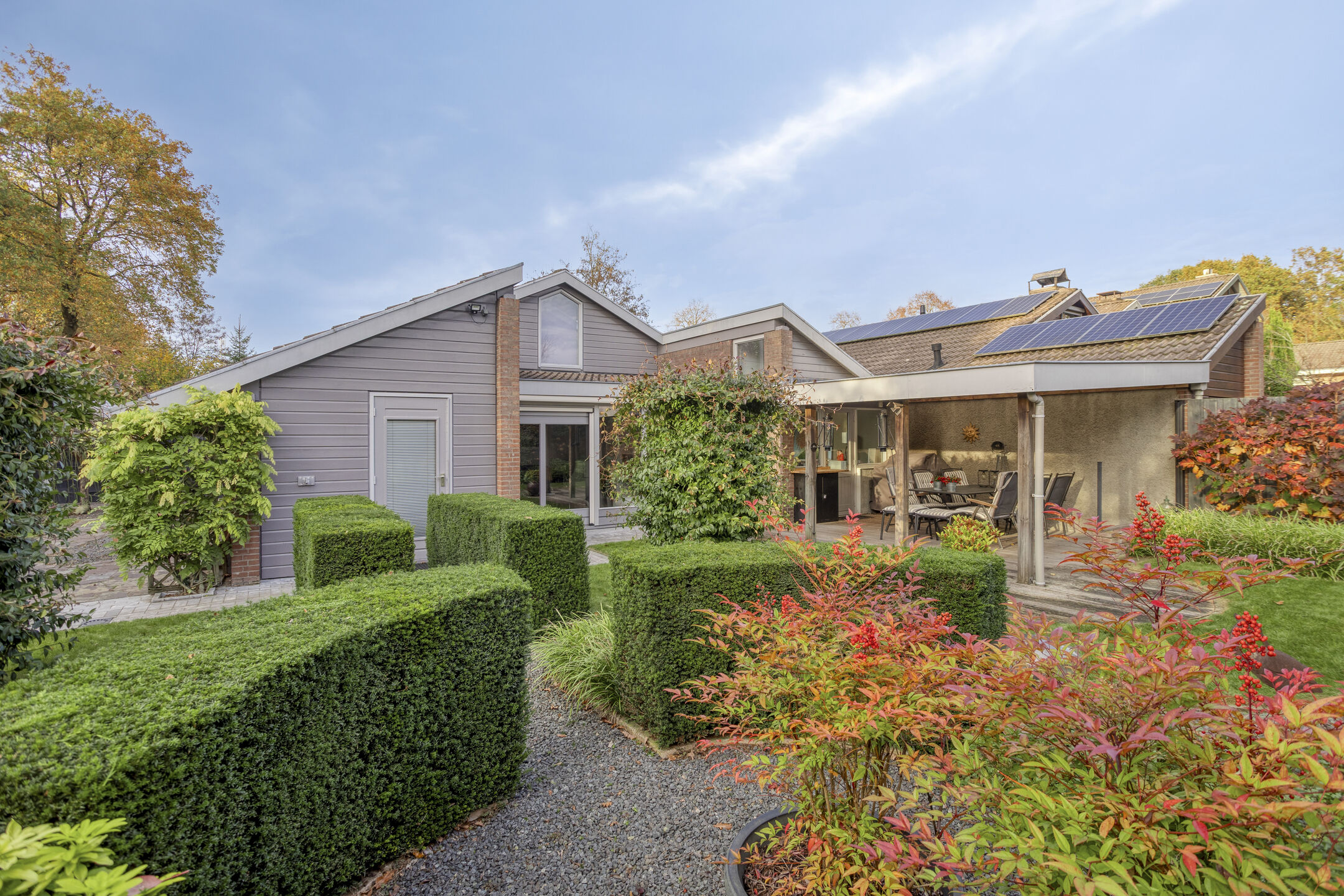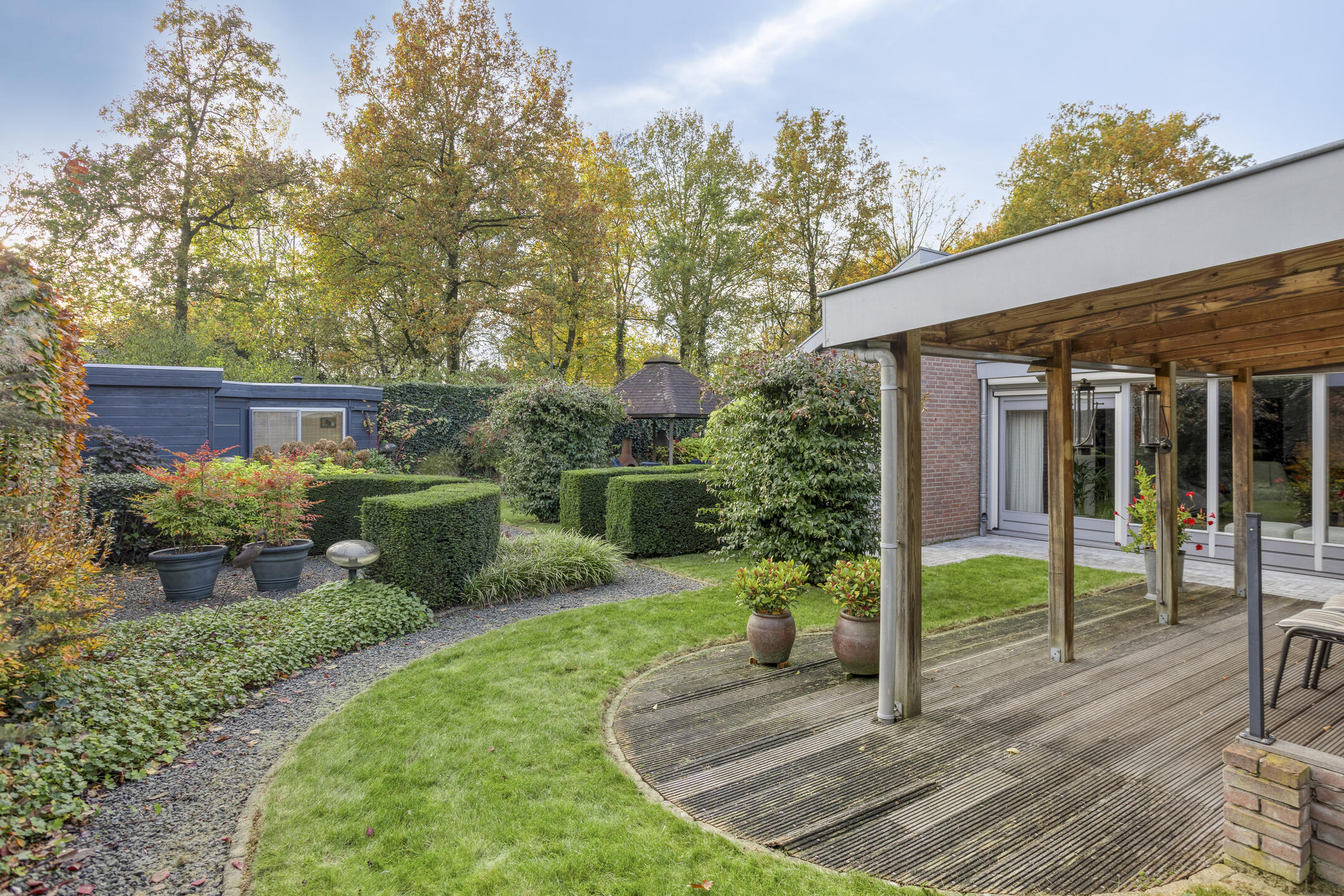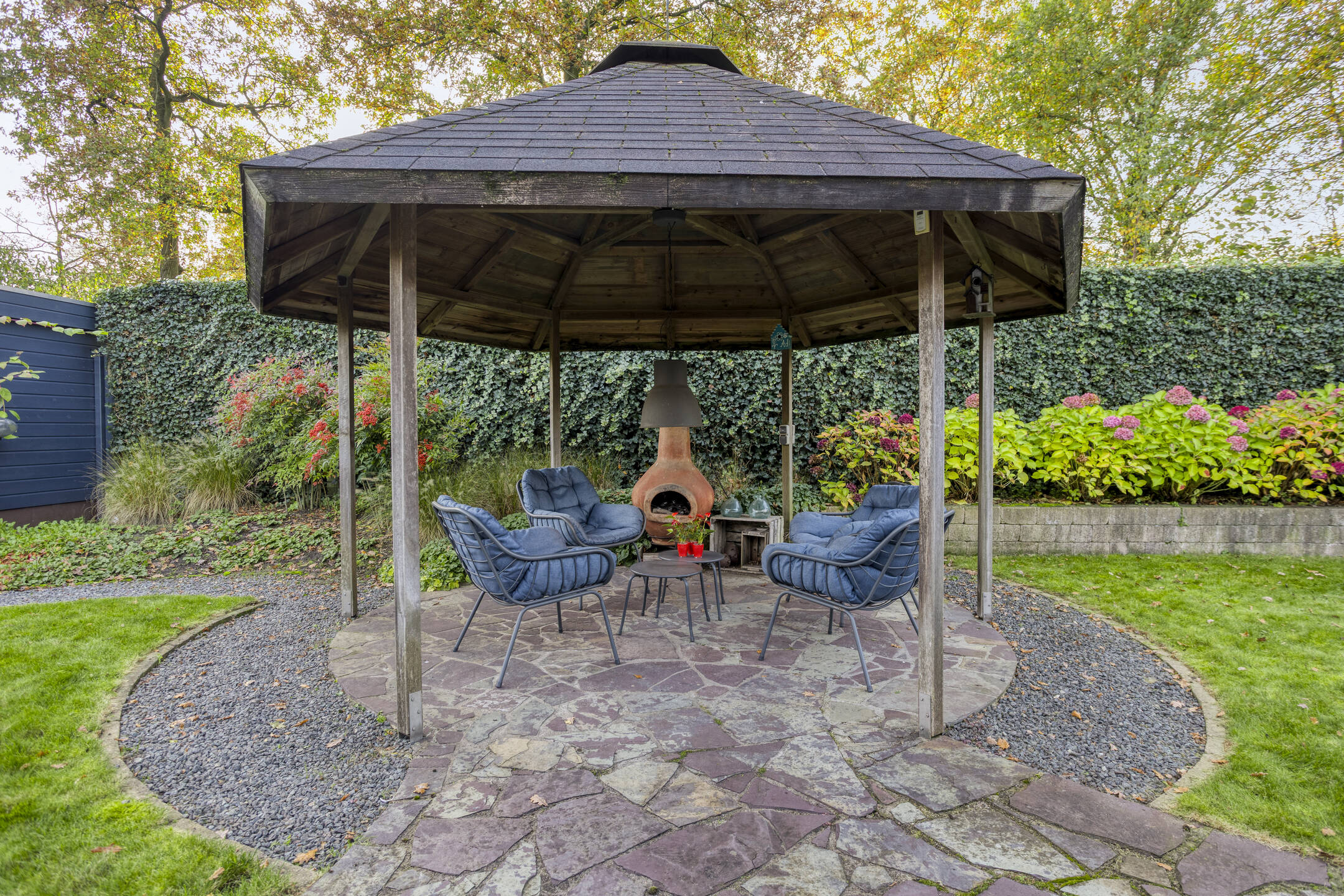 – de prachtig aangelegde tuin op het zuidoosten veel zonuren heeft, is ingericht met meerdere zithoeken, een groot overdekt terras, een houten prieel, slingerpaden, strak gesnoeide hagen, volwassen beplanting en volop privacy;