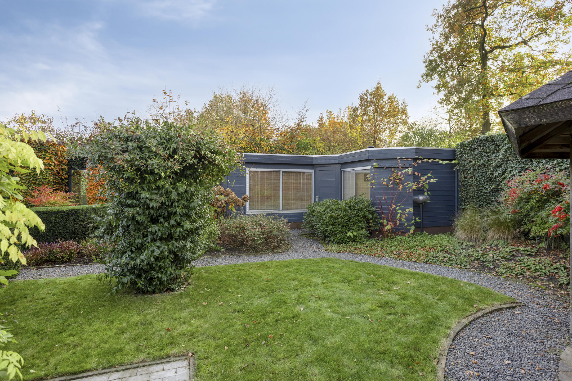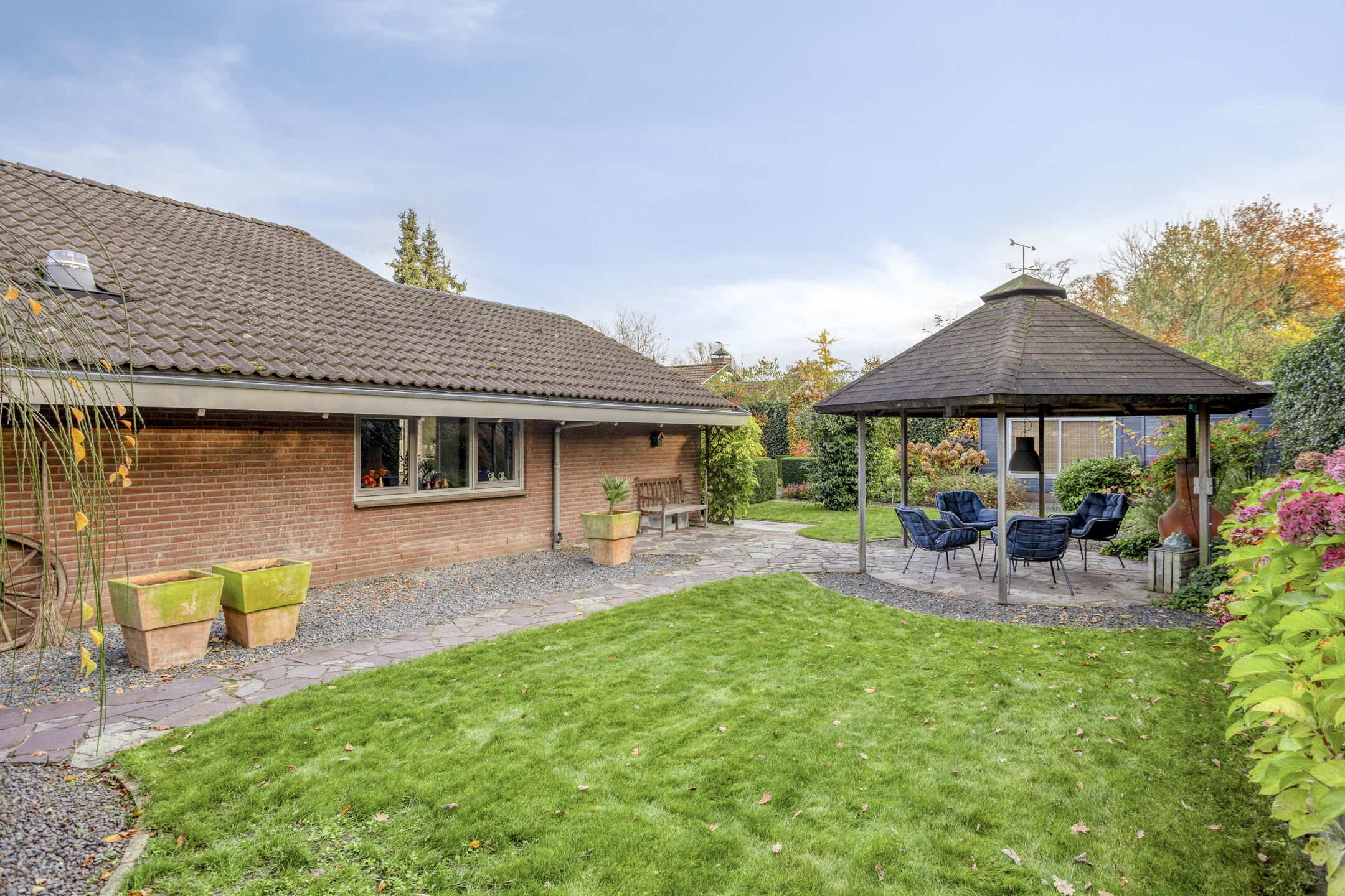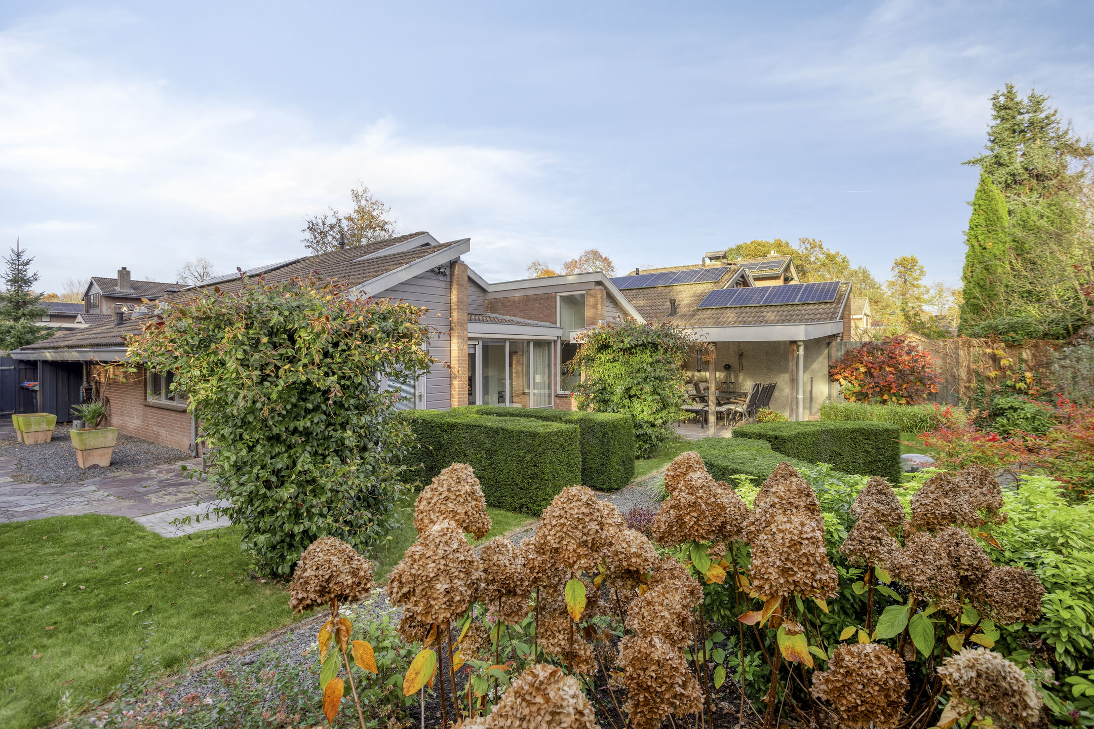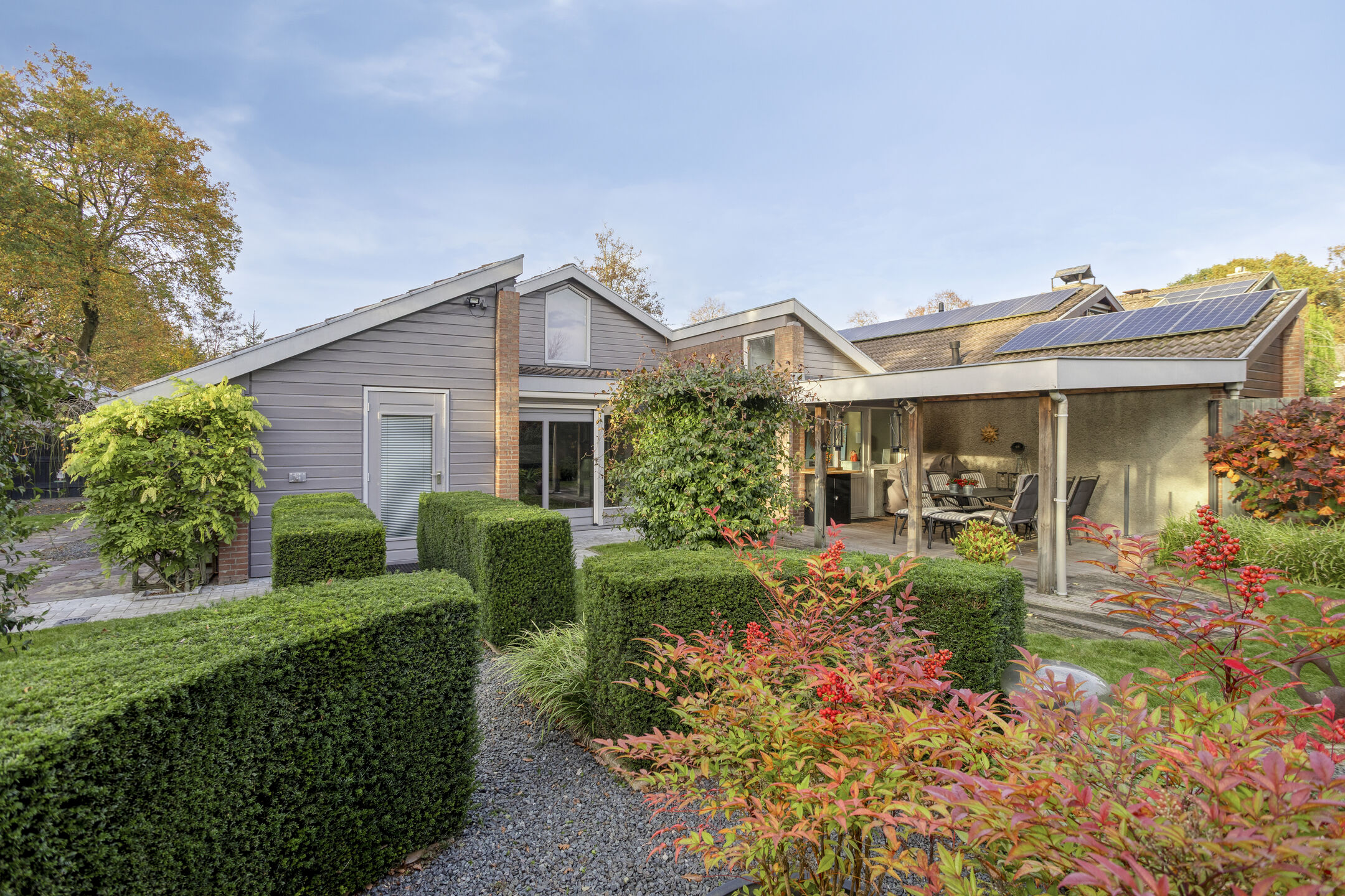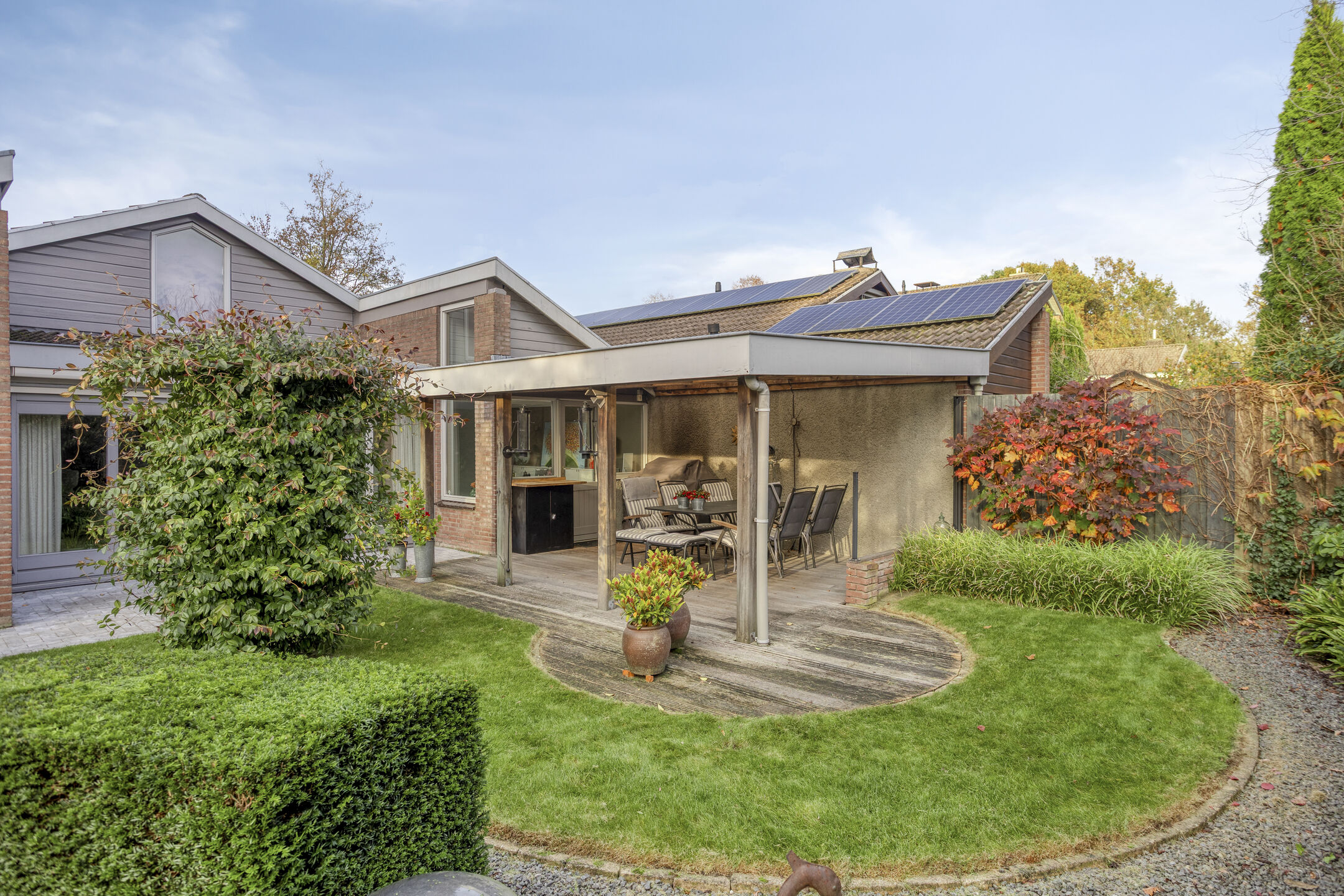 – de prachtig aangelegde tuin op het zuidoosten veel zonuren heeft, is ingericht met meerdere zithoeken, een groot overdekt terras, een houten prieel, slingerpaden, strak gesnoeide hagen, volwassen beplanting en volop privacy;