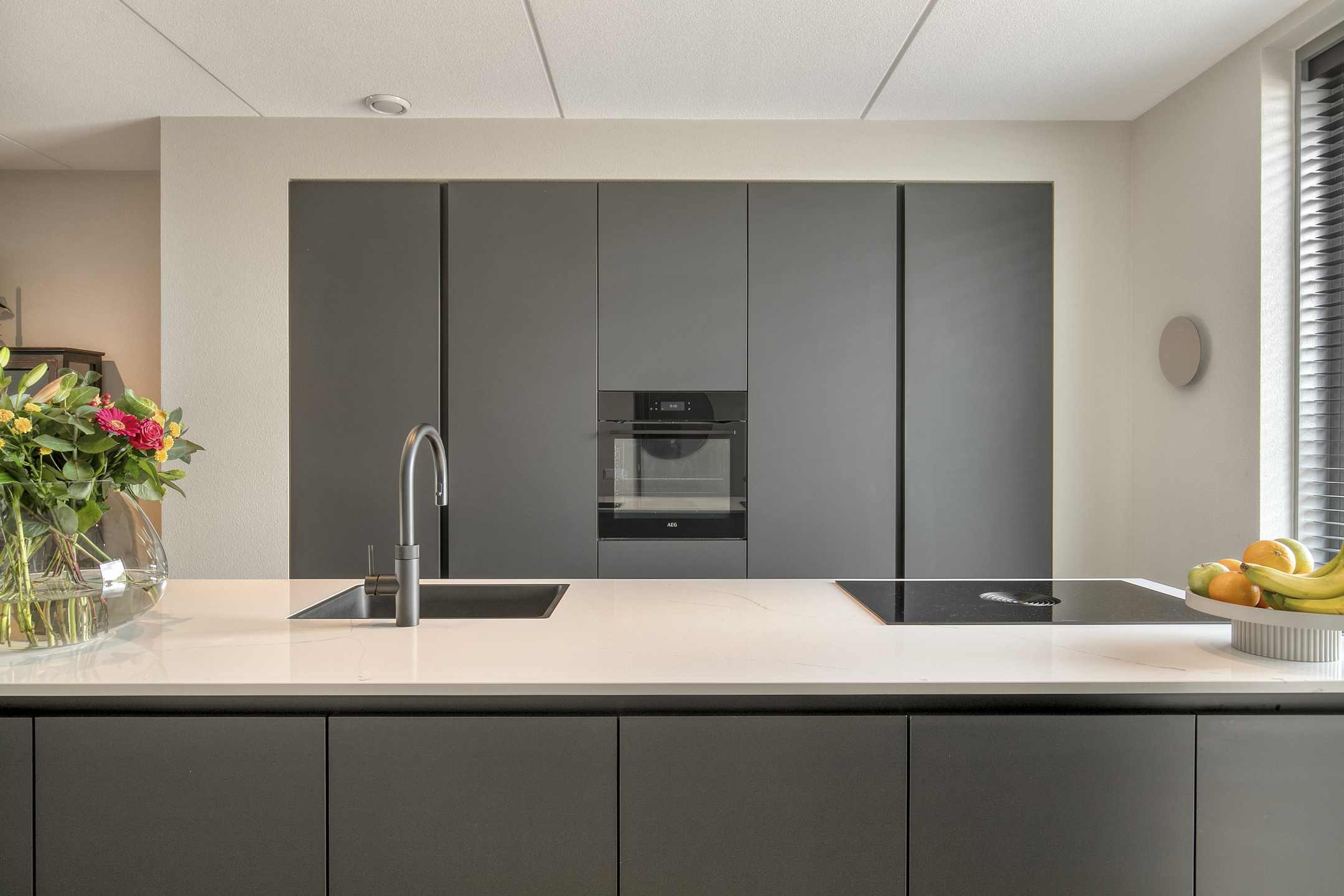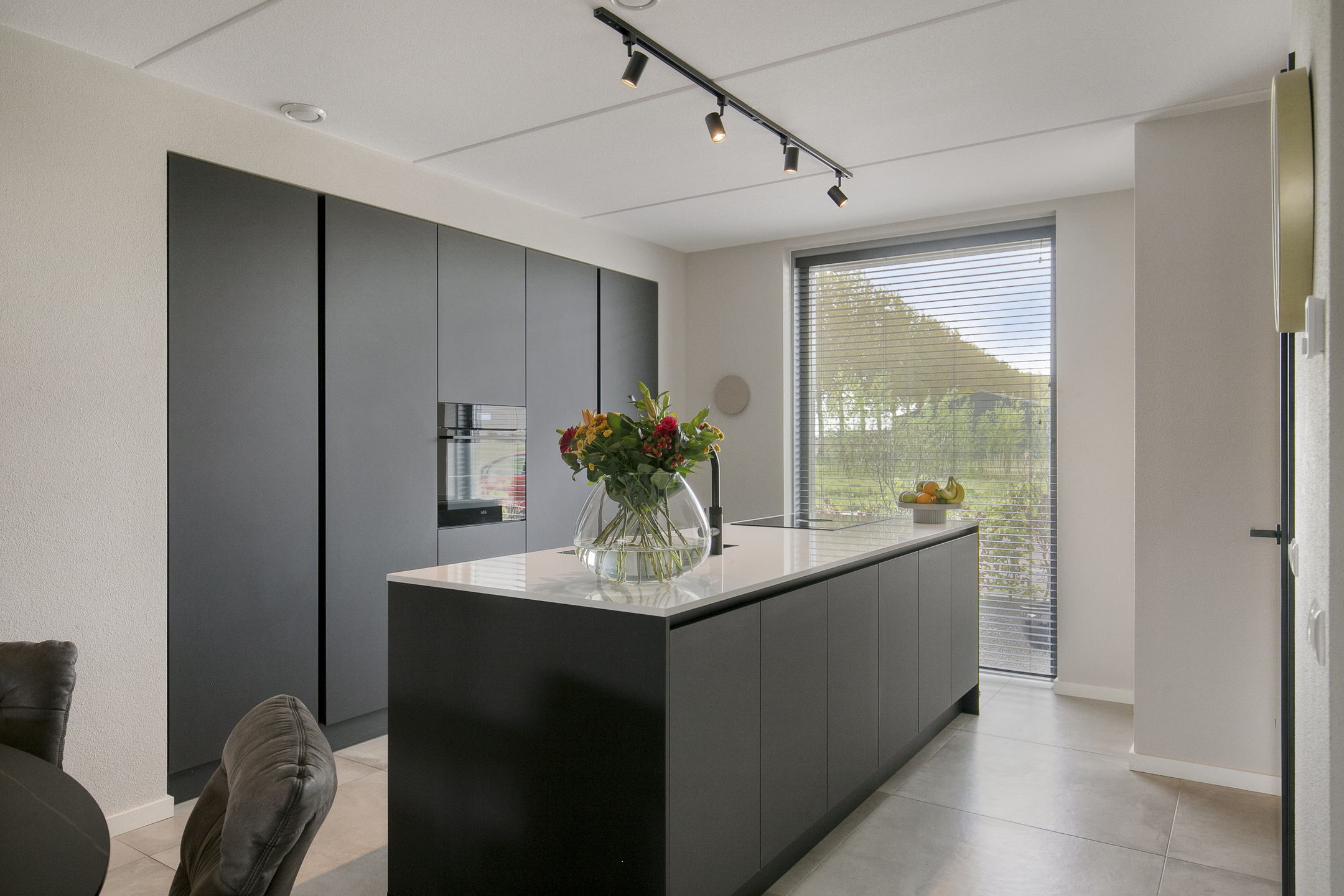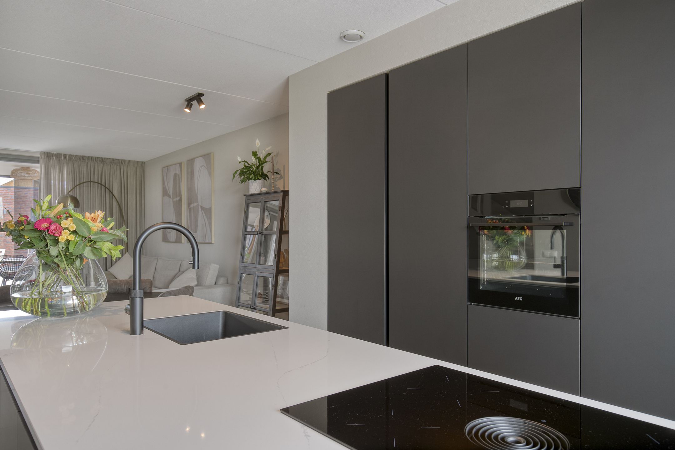– de moderne open keuken met kookeiland is uitgevoerd in een eigentijdse stijl en voorzien van diverse inbouwapparatuur, waaronder een inductiekookplaat, afzuigkap, combi-oven, vaatwasser en koelkast, waardoor het een ideale plek is om uitgebreid te koken en samen te komen;