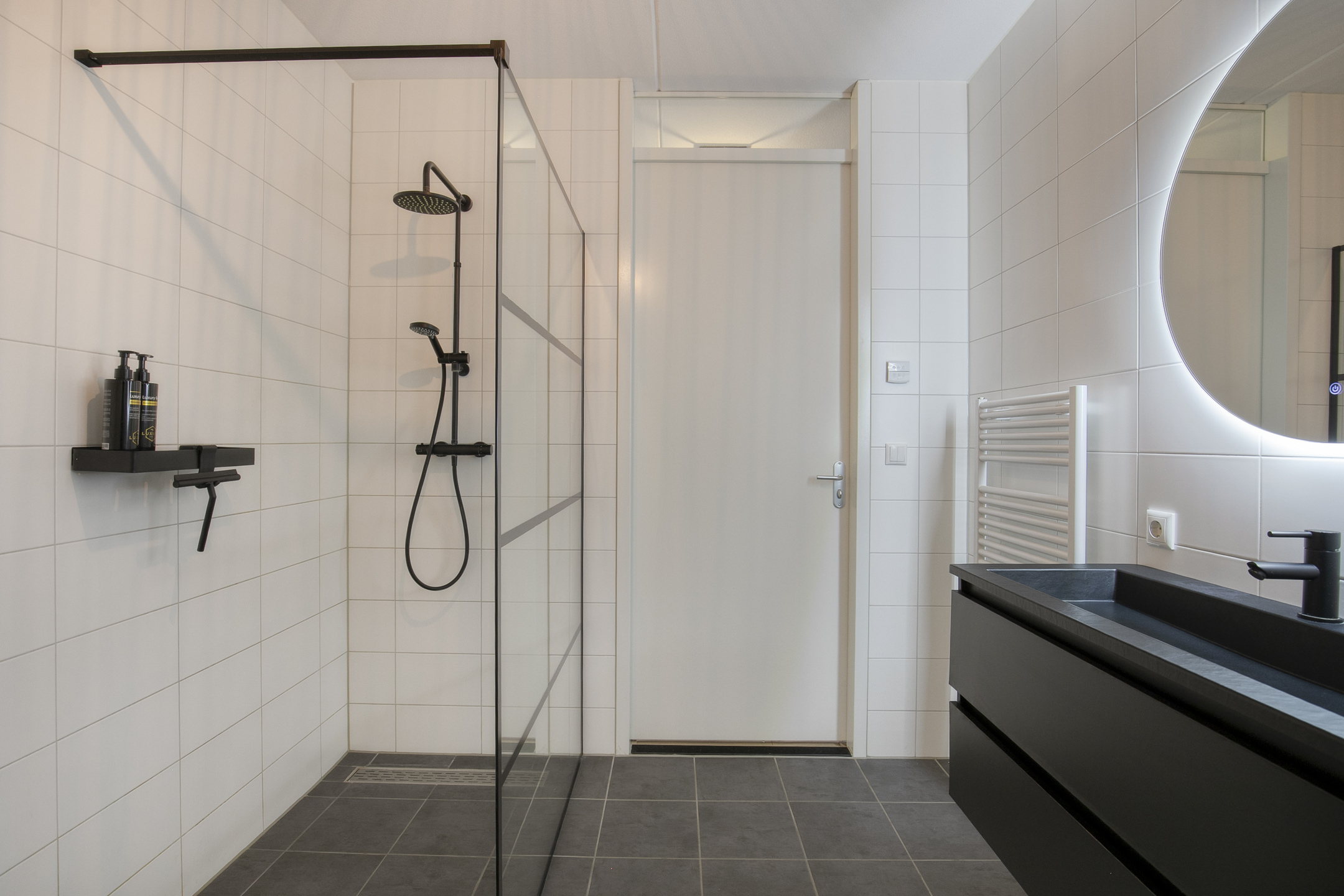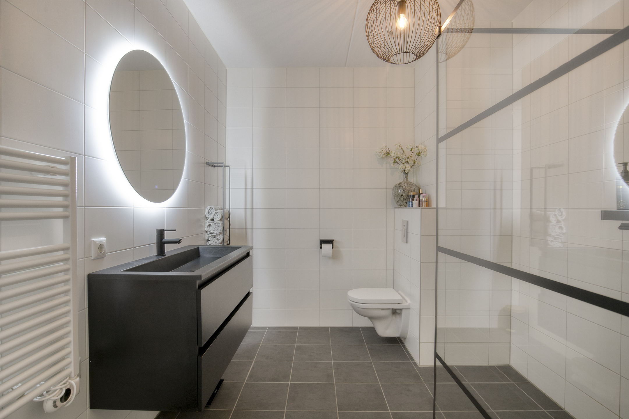 – de moderne badkamer is strak en tijdloos afgewerkt en voorzien van een ruime inloopdouche, toilet en een stijlvol wastafelmeubel;