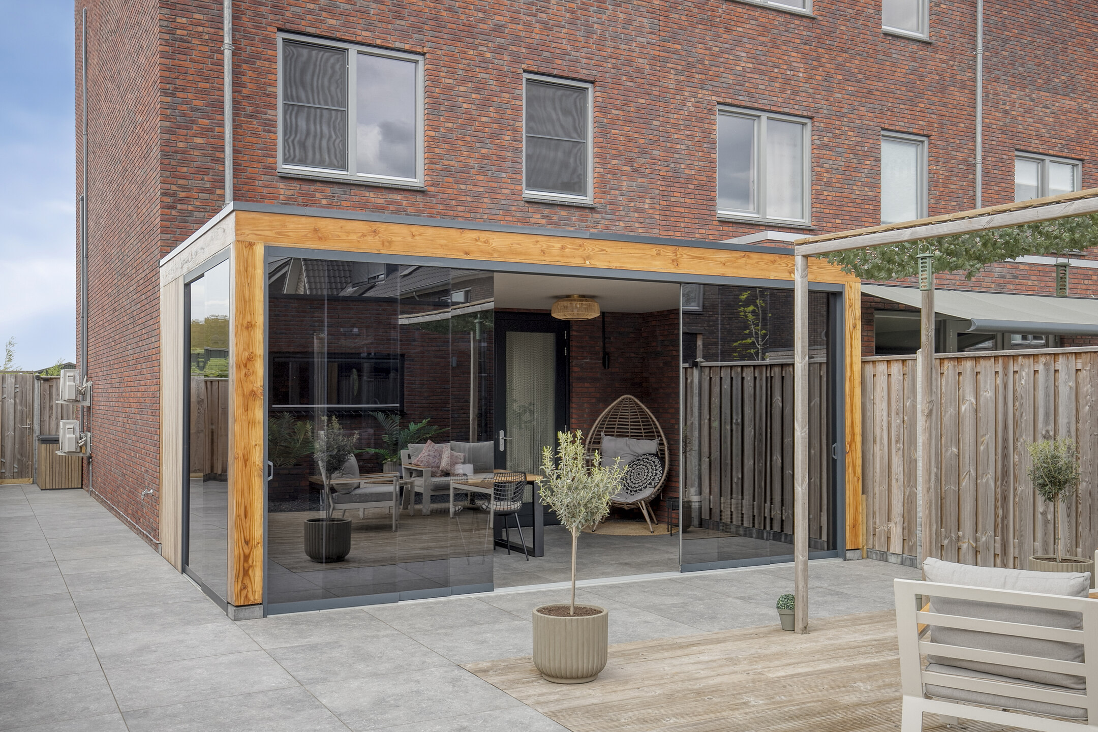 – er is een heerlijke (en met glazen wandpanelen af te sluiten) veranda (ca. 21m2) waar je al vroeg in het jaar heerlijk kunt genieten;