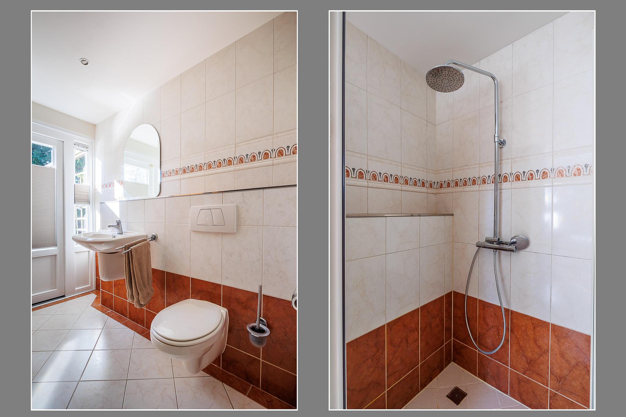 De aangrenzende badkamer is grotendeels betegeld en beschikt over een douchecabine, sauna, toilet en wastafel. Vanuit de slaapkamer en de badkamer heb je ook toegang tot de achtertuin.