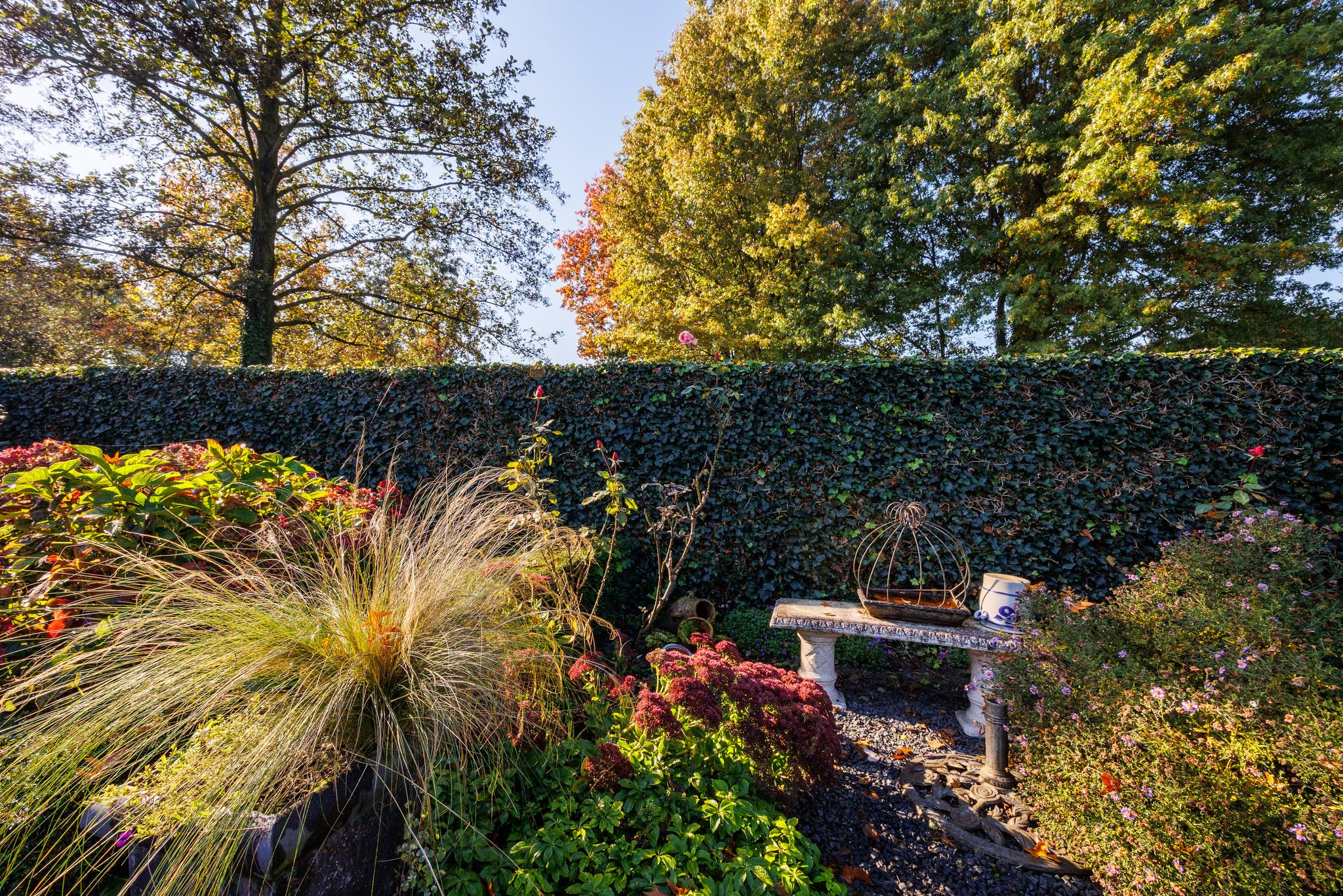 De riante tuin, gelegen op het noordwesten, biedt veel privacy en is sfeervol ingericht met meerdere zitjes en groen.