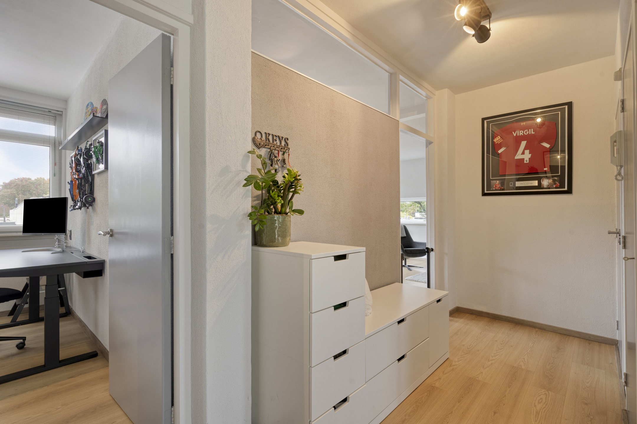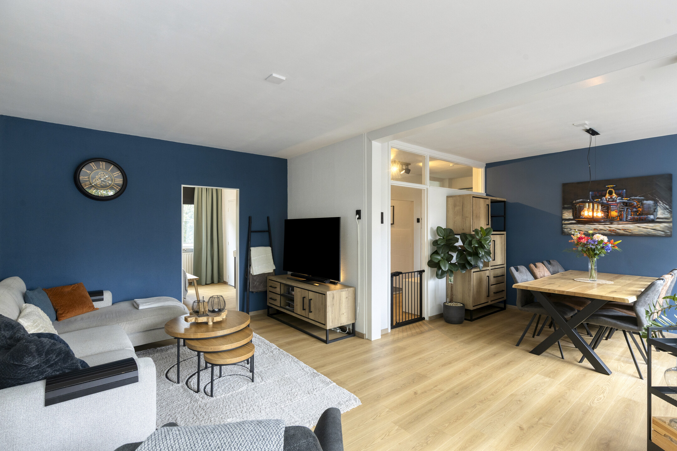 – de lichte en ruime woonkamer een gezellige zithoek en een aparte eethoek biedt, met grote ramen die zorgen voor prettig veel daglicht. De strakke wandafwerking en de moderne laminaatvloer zorgen samen voor een frisse en eigentijdse uitstraling;