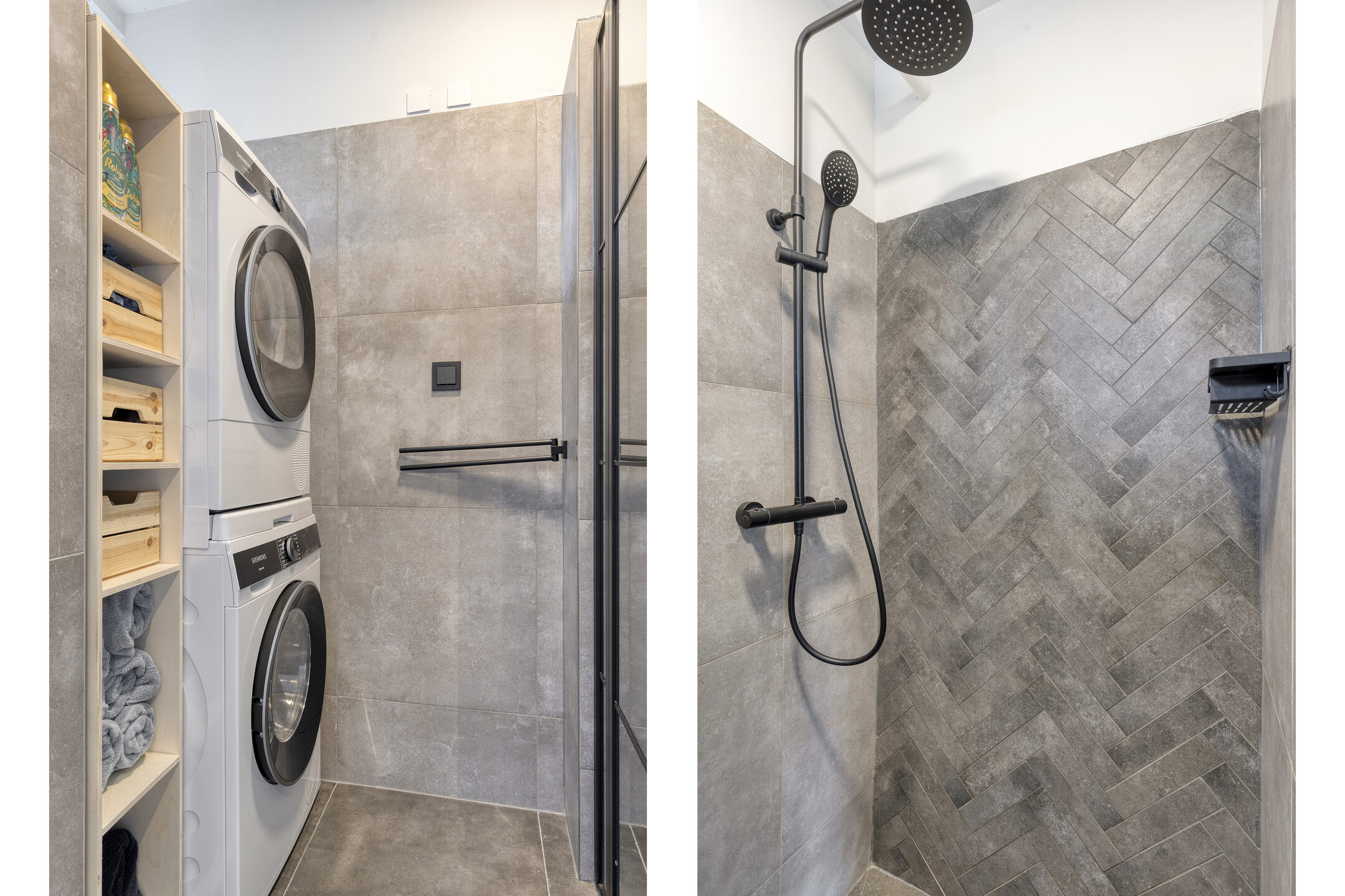 – de badkamer in 2023 geheel is vernieuwd en modern is afgewerkt met grote grijze tegels, een inloopdouche met regendouche en ruimte voor wasmachine en droger. De afwerking met zwarte accenten geeft de ruimte een luxe uitstraling;