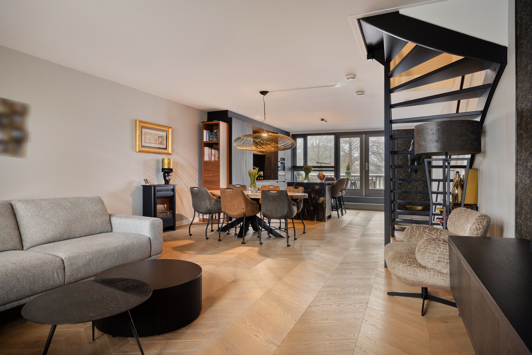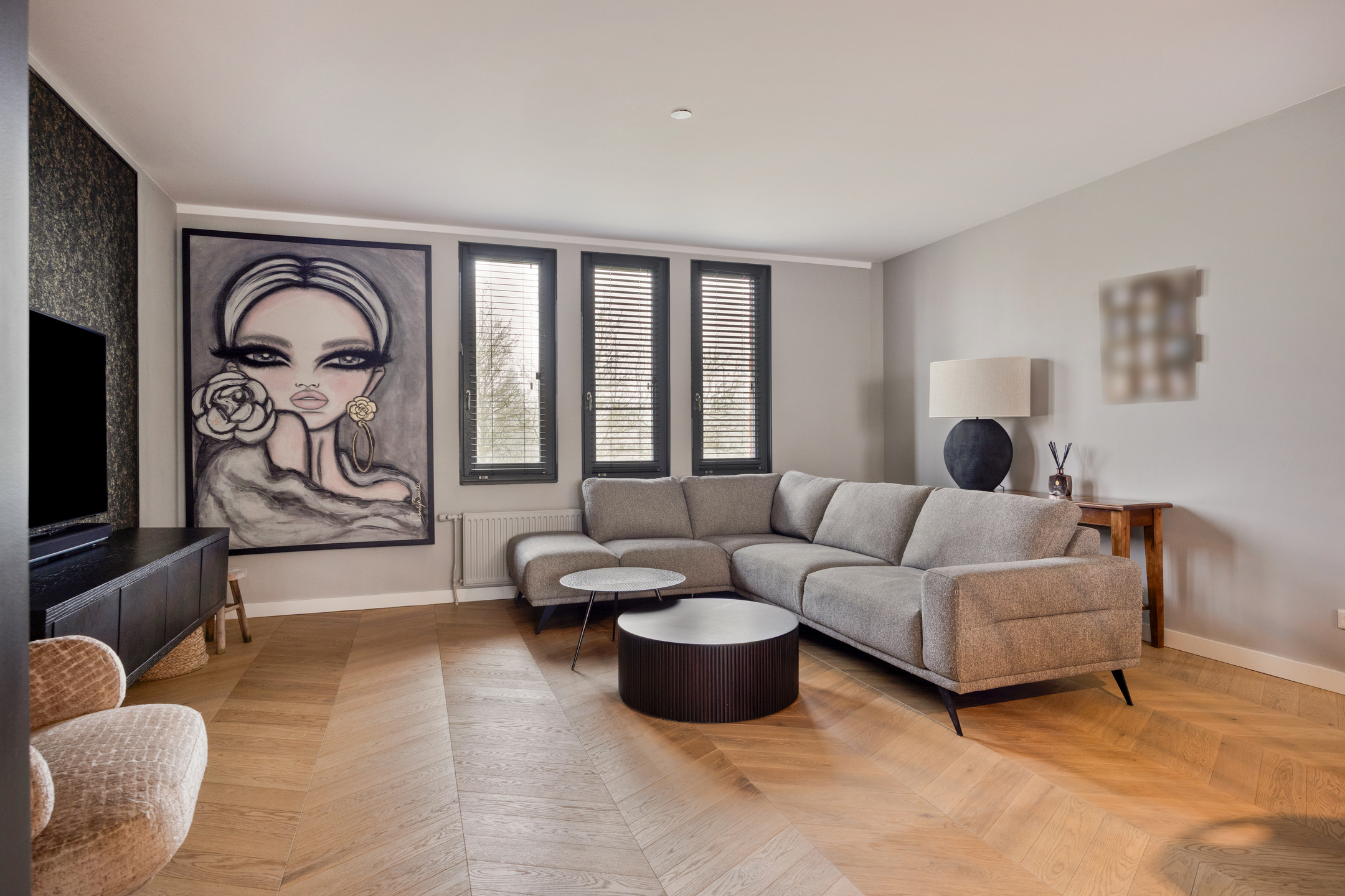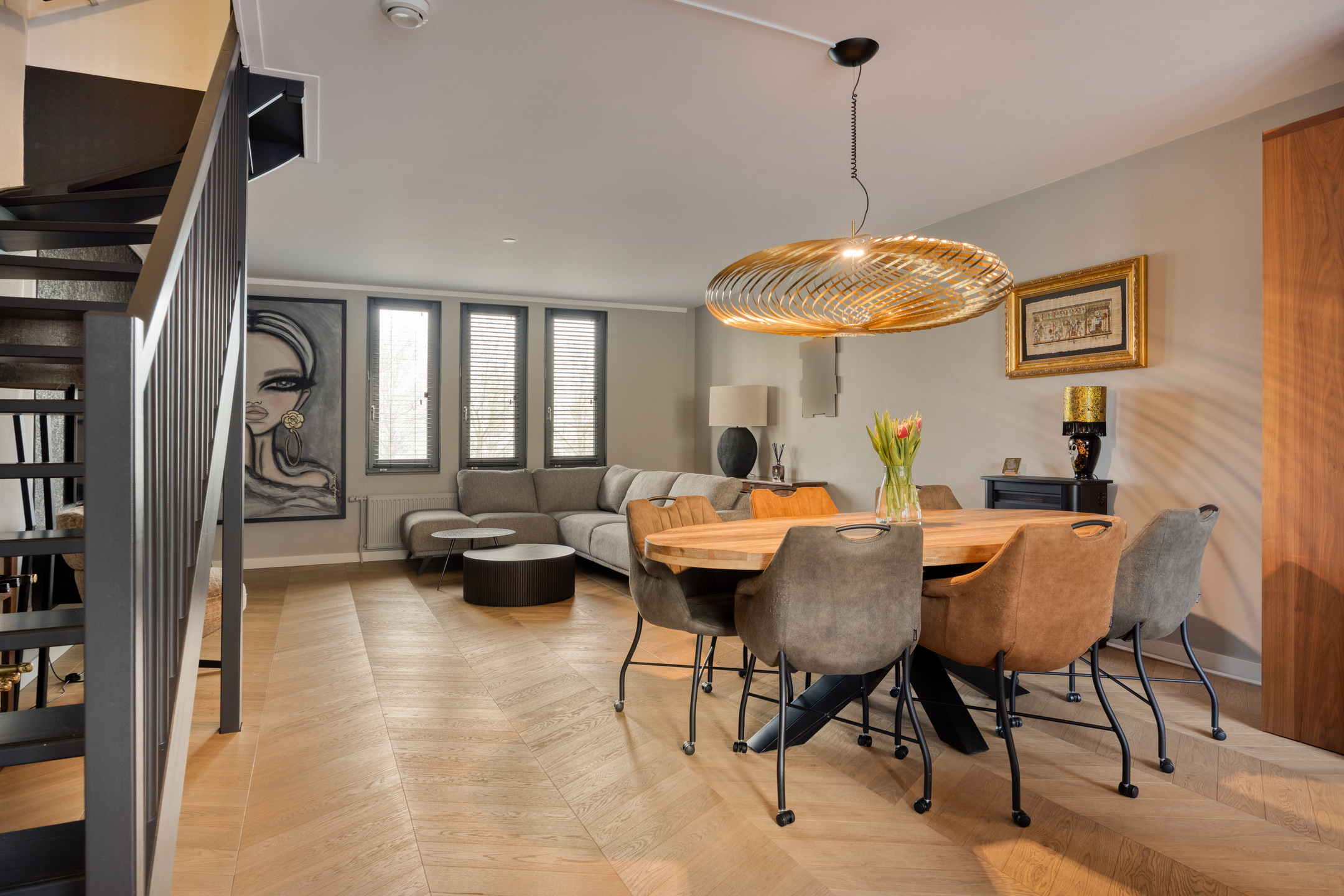 – de eerste verdieping is ingericht als woonverdieping. De woonkamer is voorzien van een fraaie eiken parketvloer in Hongaarse punt en een strakke wand- en plafondafwerking met diverse behang accenten.
