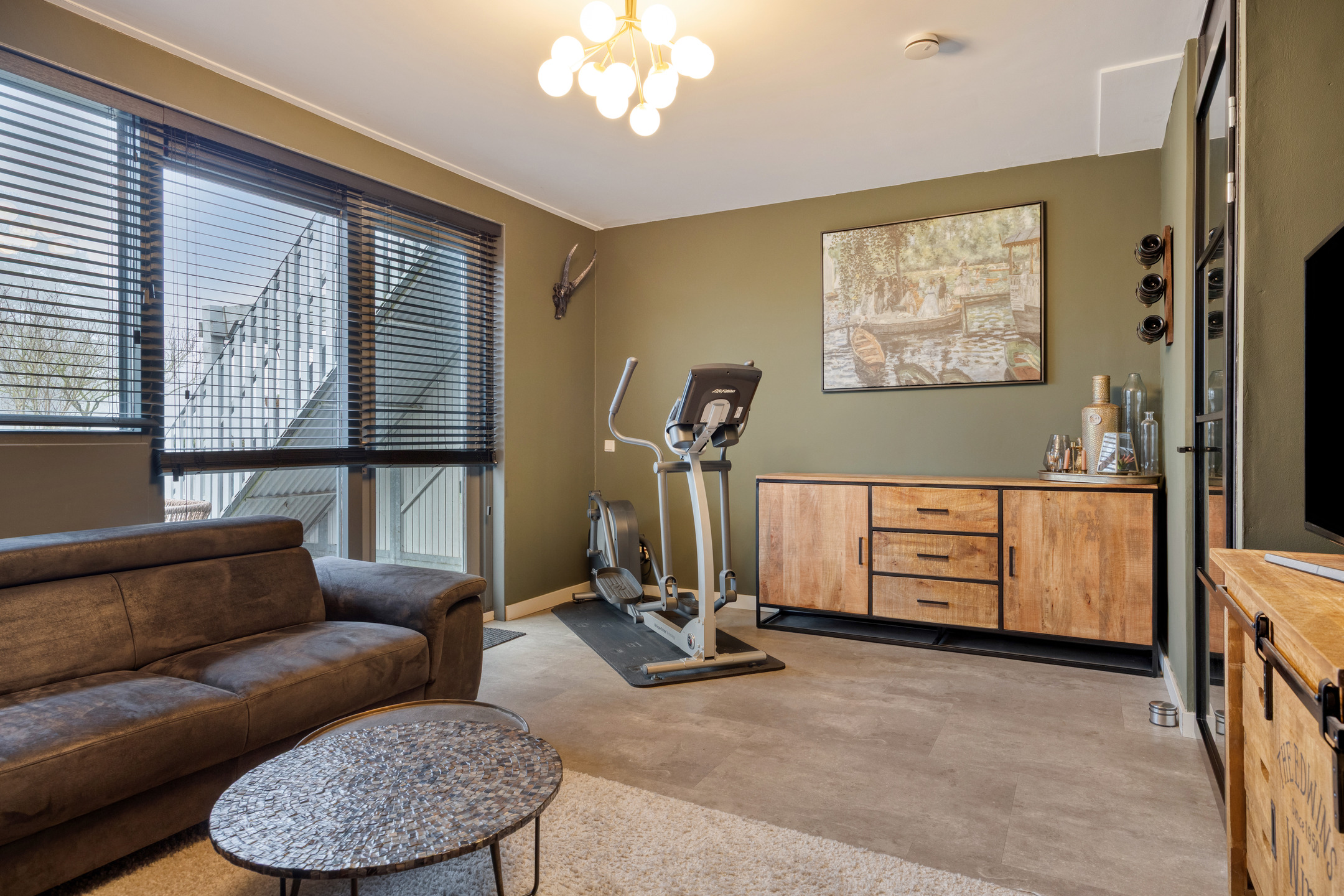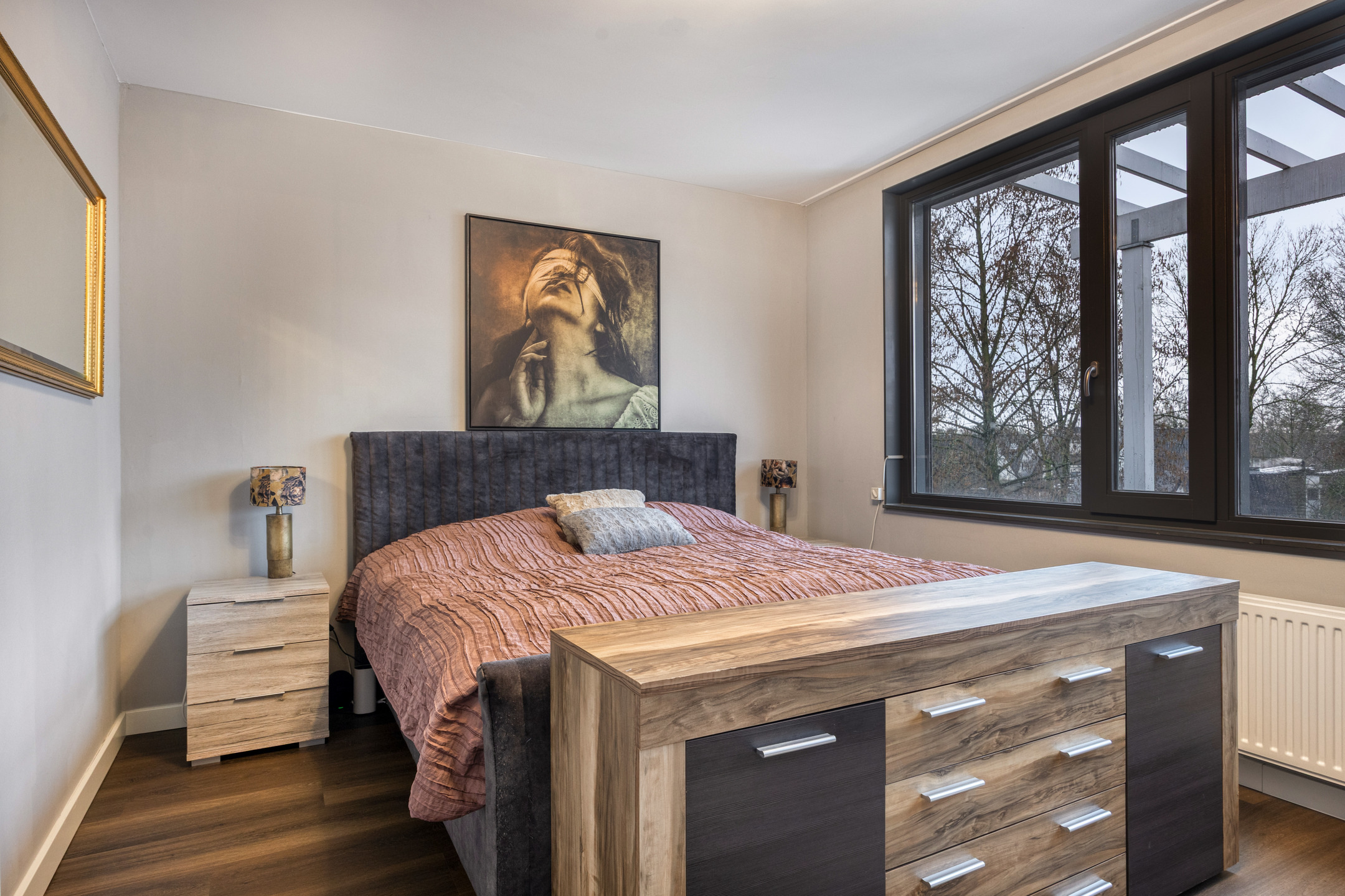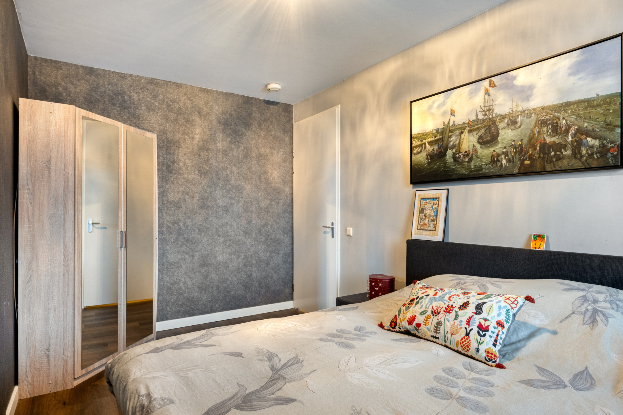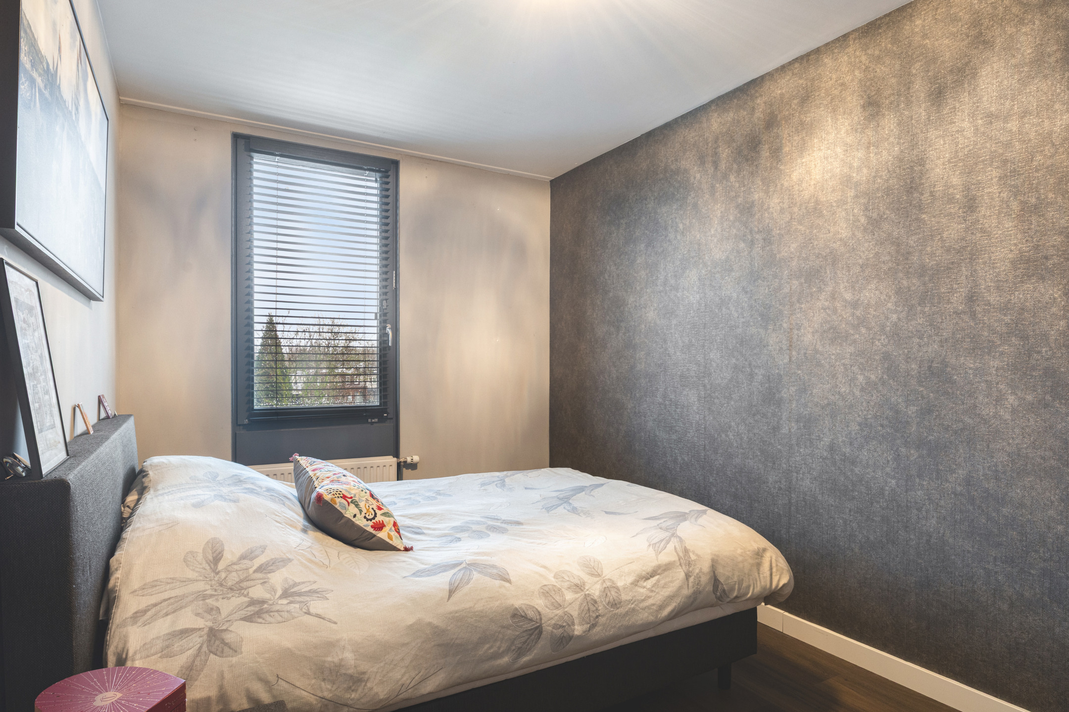 – de eerste verdieping is ingericht als woonverdieping. De woonkamer is voorzien van een fraaie eiken parketvloer in Hongaarse punt en een strakke wand- en plafondafwerking met diverse behang accenten.