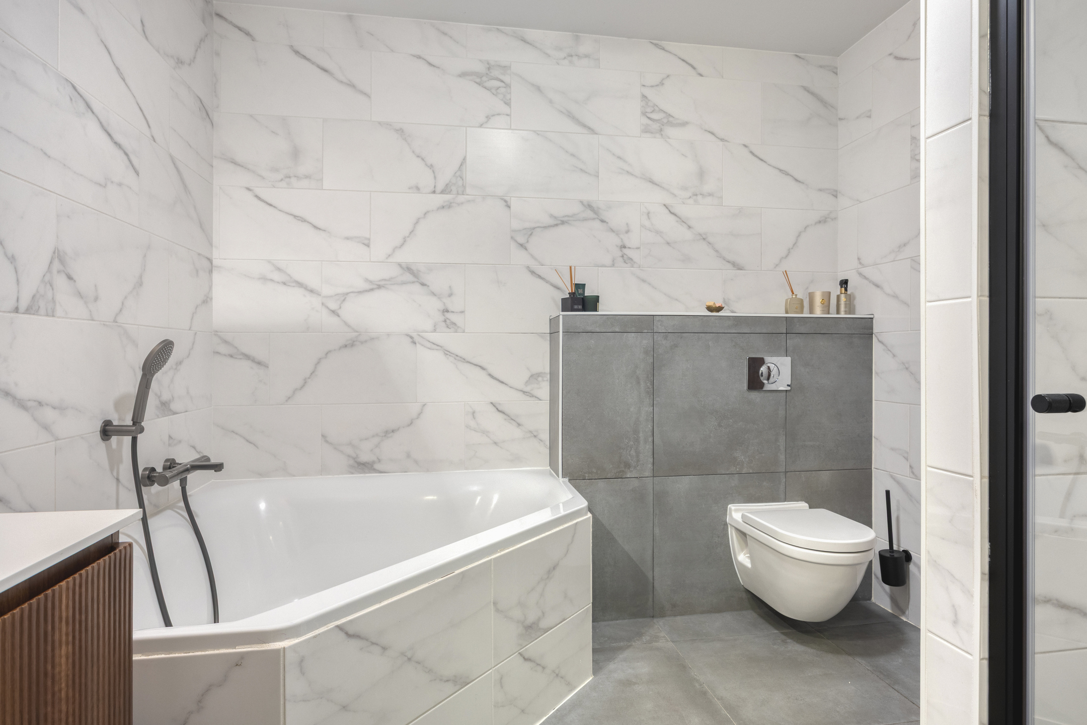 – de moderne badkamer is volledig betegeld en uitgerust met comfortabele vloerverwarming, een ligbad, inloopdouche, badkamermeubel met wastafel en een wandcloset;