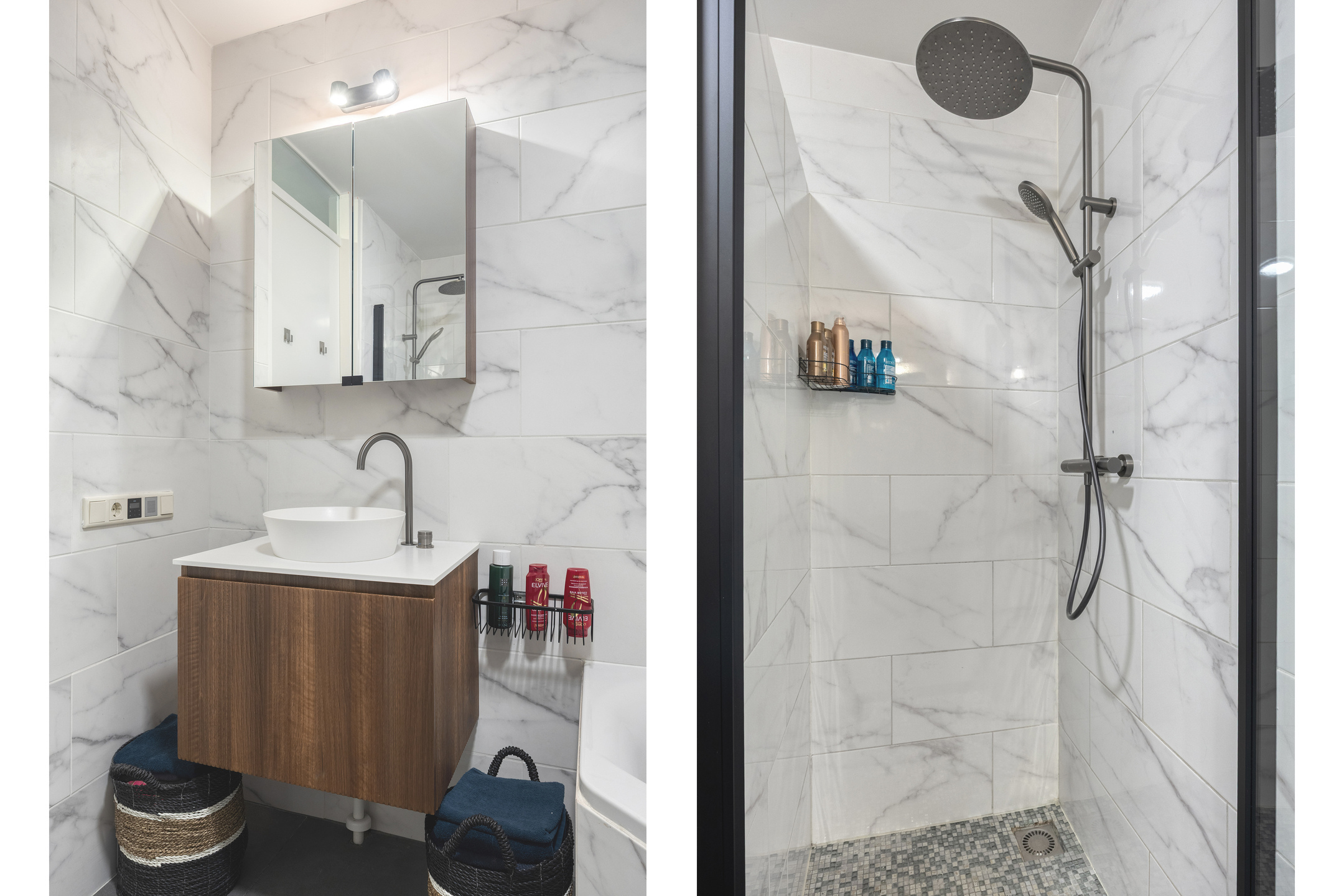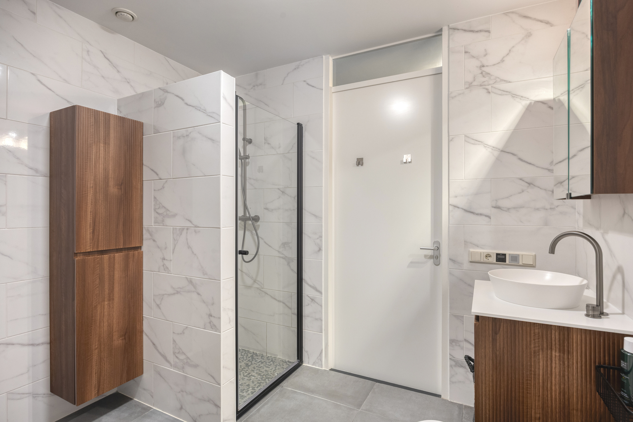 - Badkamervoorzieningen Ligbad, toilet, wastafel, wastafelmeubel, inloopdouche, vloerverwarming