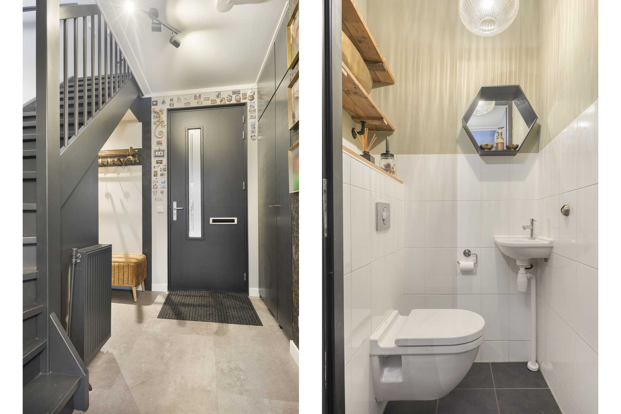 – achter de voordeur bevindt zich een ruime hal met garderobe, meterkast, trapopgang naar de eerste verdieping en een moderne toiletruimte met wandcloset en fonteintje.