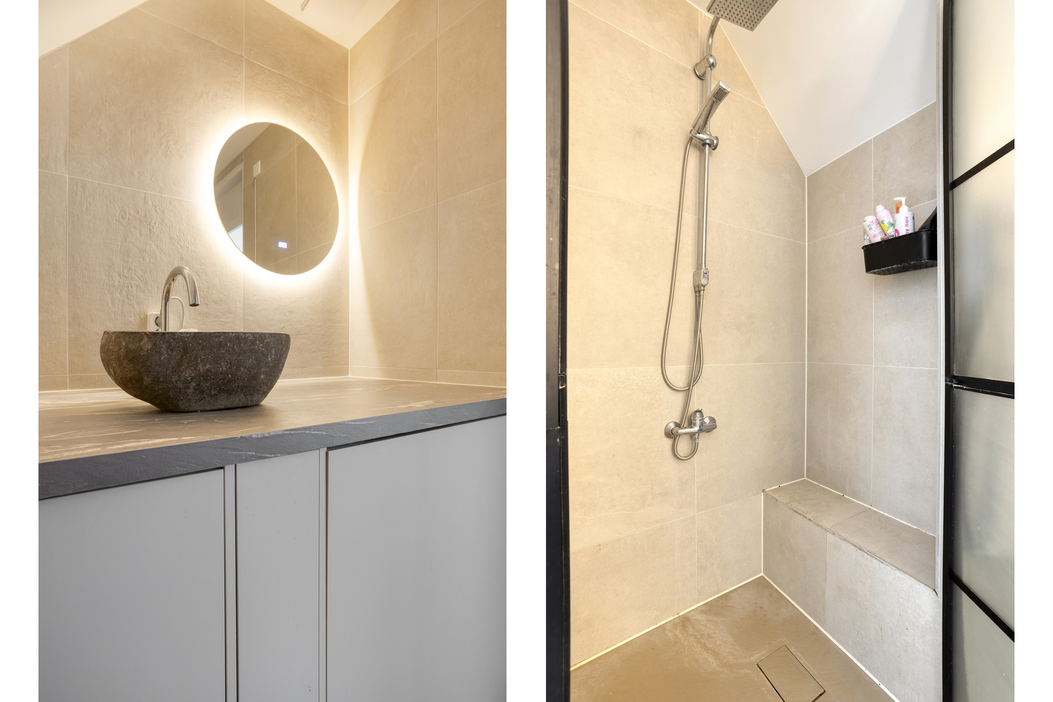 – de moderne badkamer (2024) is volledig betegeld en voorzien van een inloopdouche, wastafelmeubel met spiegelverlichting en een stijlvolle afwerking;
